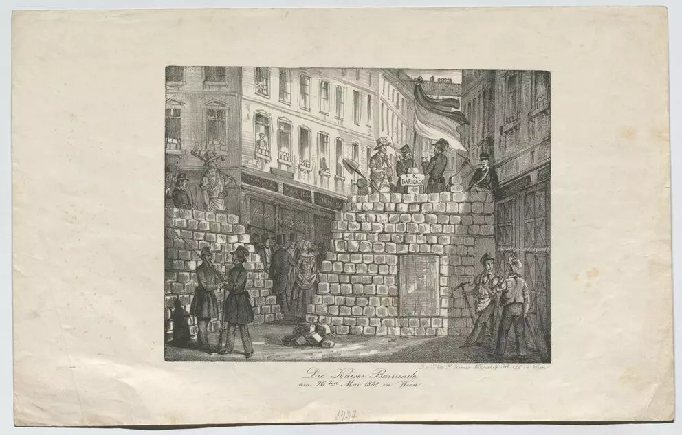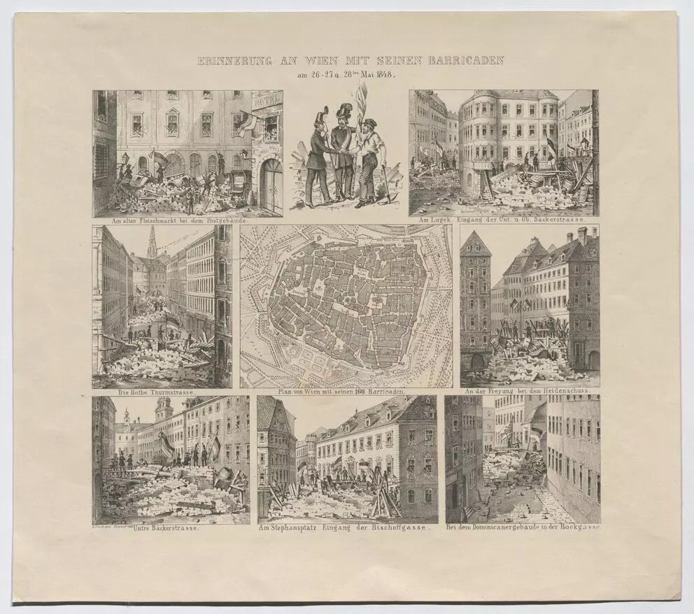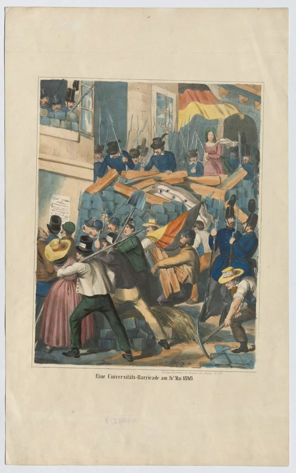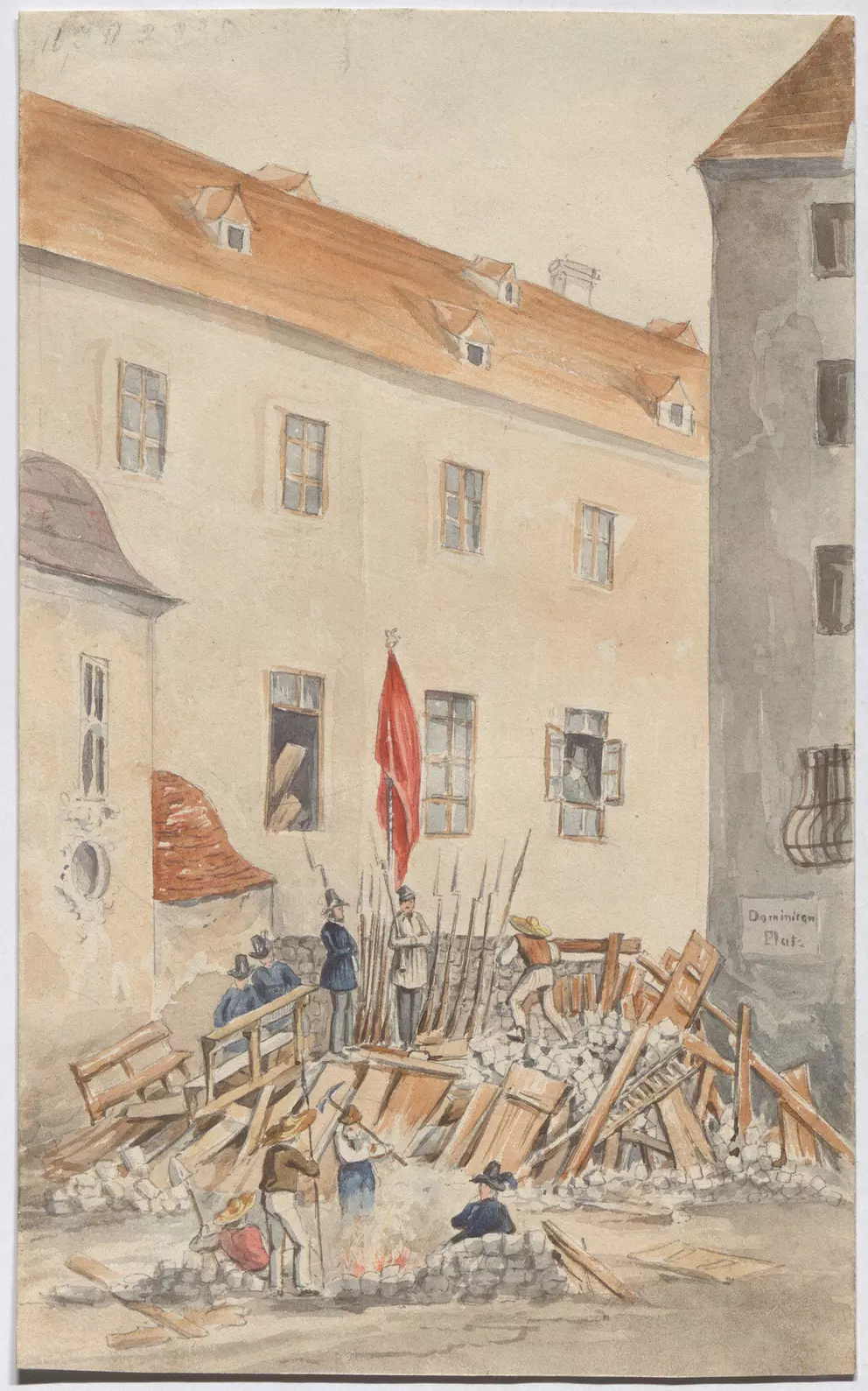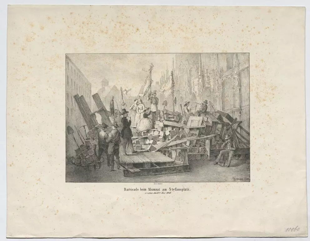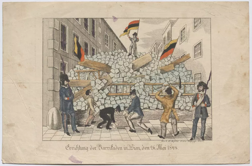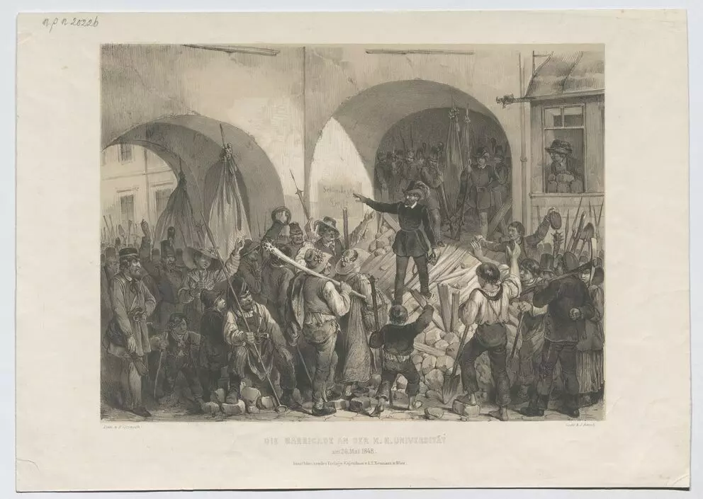 The demonstration of the students on March 13, with which they demanded freedom of speech, teaching, and learning, was the starting note for the revolutionary events of 1848. From then on, the “Academic legion”, an armed formation of students, was at the forefront of all revolutionary actions. When the government resolved to dissolve the Legion, the students, supported by workers from the periphery, erected roughly 160 barricades in Vienna’s city centre from 26 to 28 May, with which they forced the government to repeal the decree.