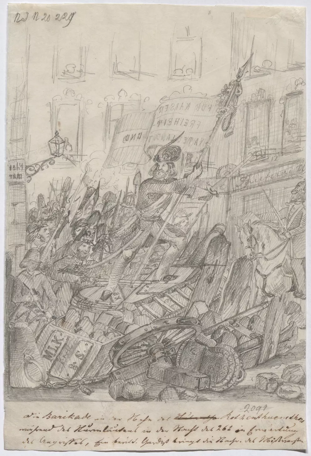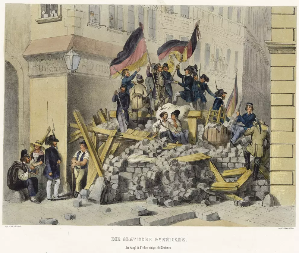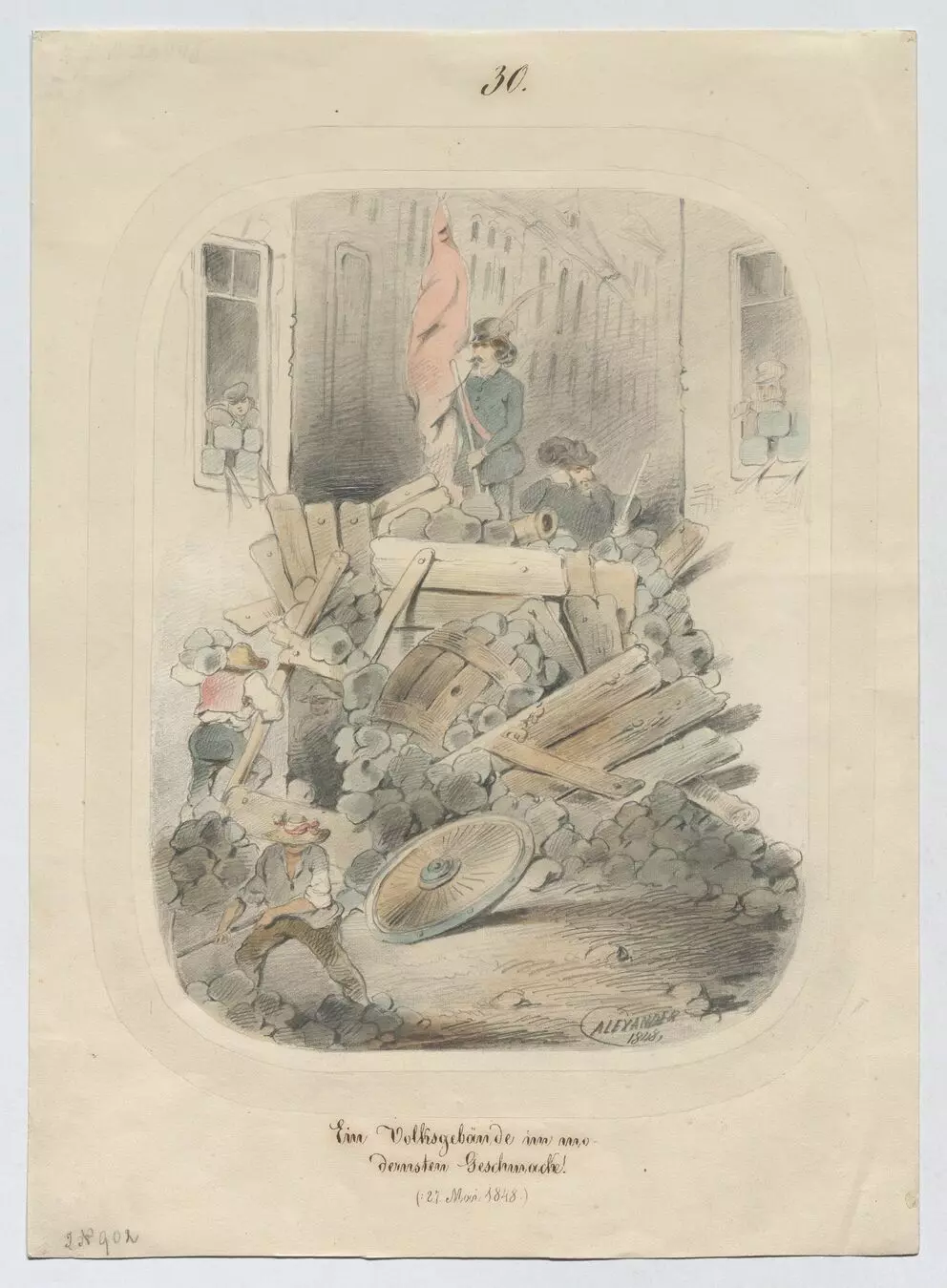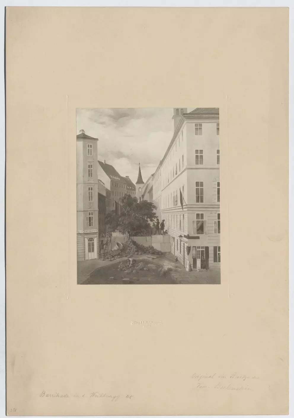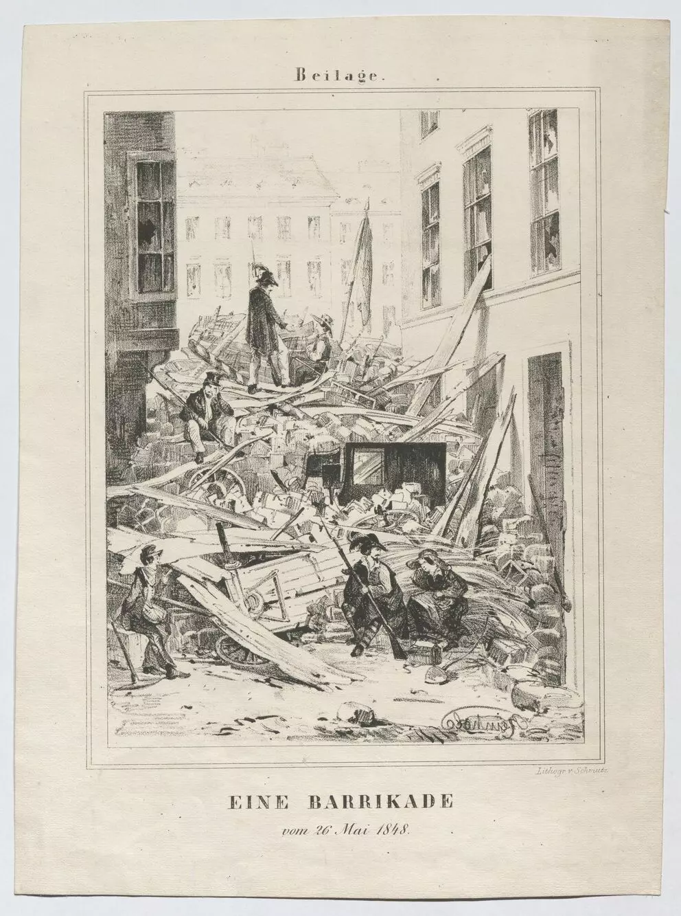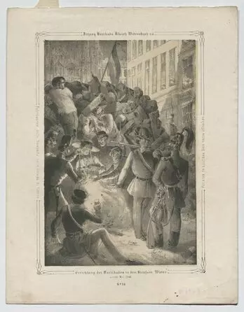 The demonstration of the students on March 13, with which they demanded freedom of speech, teaching, and learning, was the starting note for the revolutionary events of 1848. From then on, the “Academic legion”, an armed formation of students, was at the forefront of all revolutionary actions. When the government resolved to dissolve the Legion, the students, supported by workers from the periphery, erected roughly 160 barricades in Vienna’s city centre from 26 to 28 May, with which they forced the government to repeal the decree.