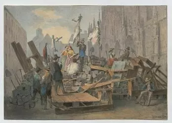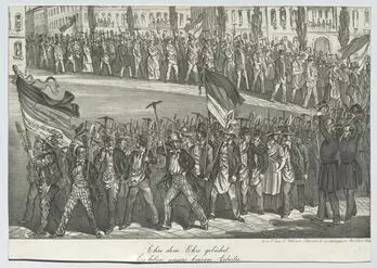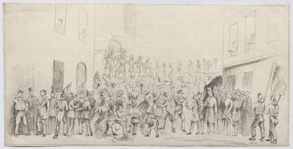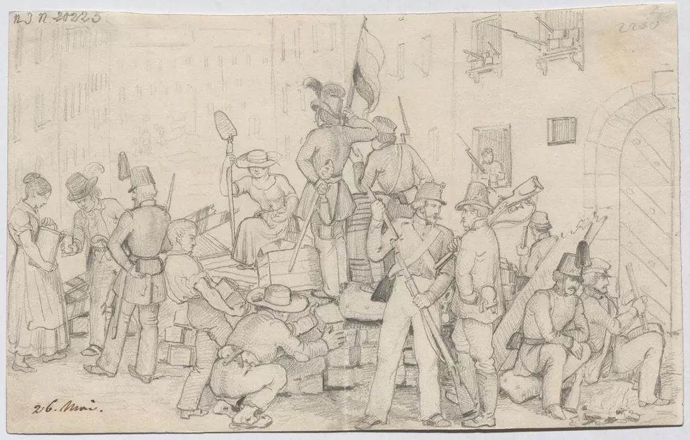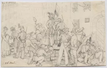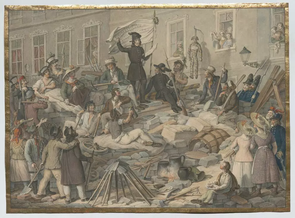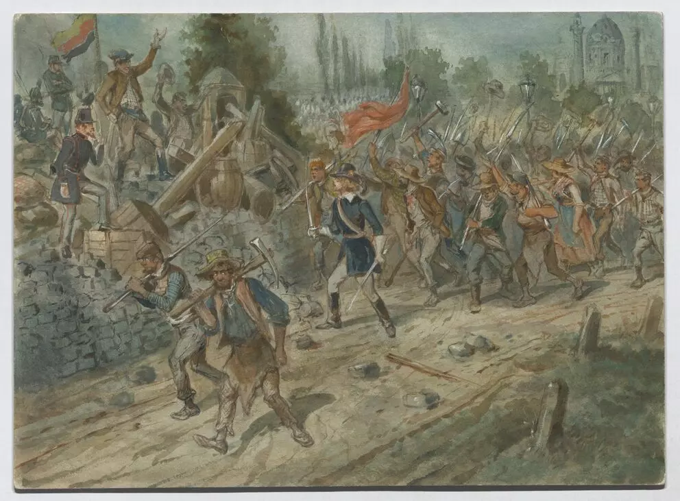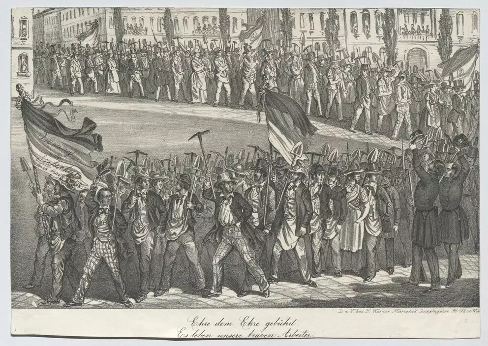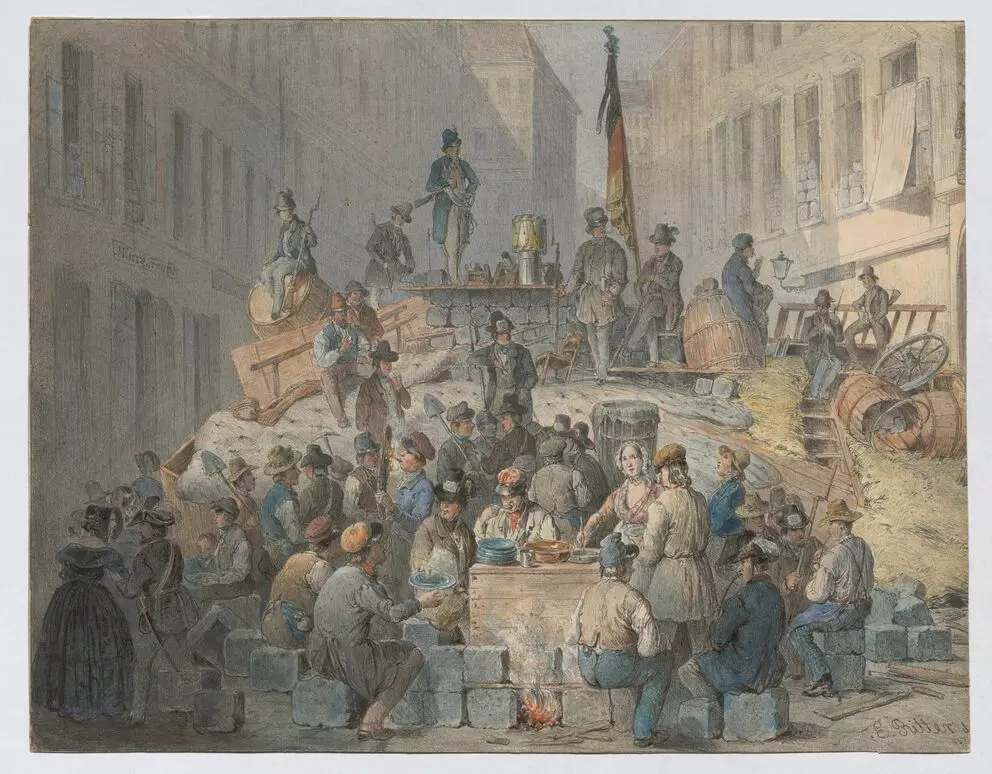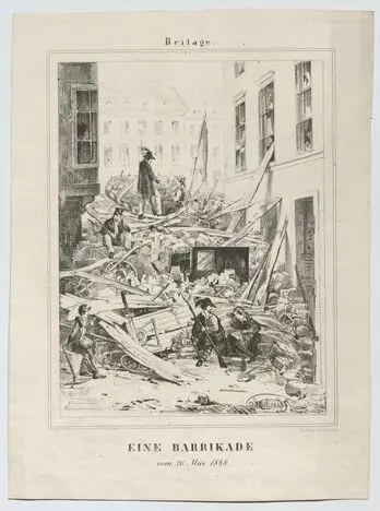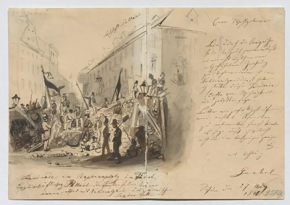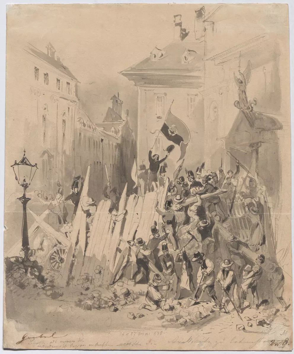 The demonstration of the students on March 13, with which they demanded freedom of speech, teaching, and learning, was the starting note for the revolutionary events of 1848. From then on, the “Academic legion”, an armed formation of students, was at the forefront of all revolutionary actions. When the government resolved to dissolve the Legion, the students, supported by workers from the periphery, erected roughly 160 barricades in Vienna’s city centre from 26 to 28 May, with which they forced the government to repeal the decree.