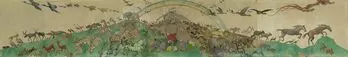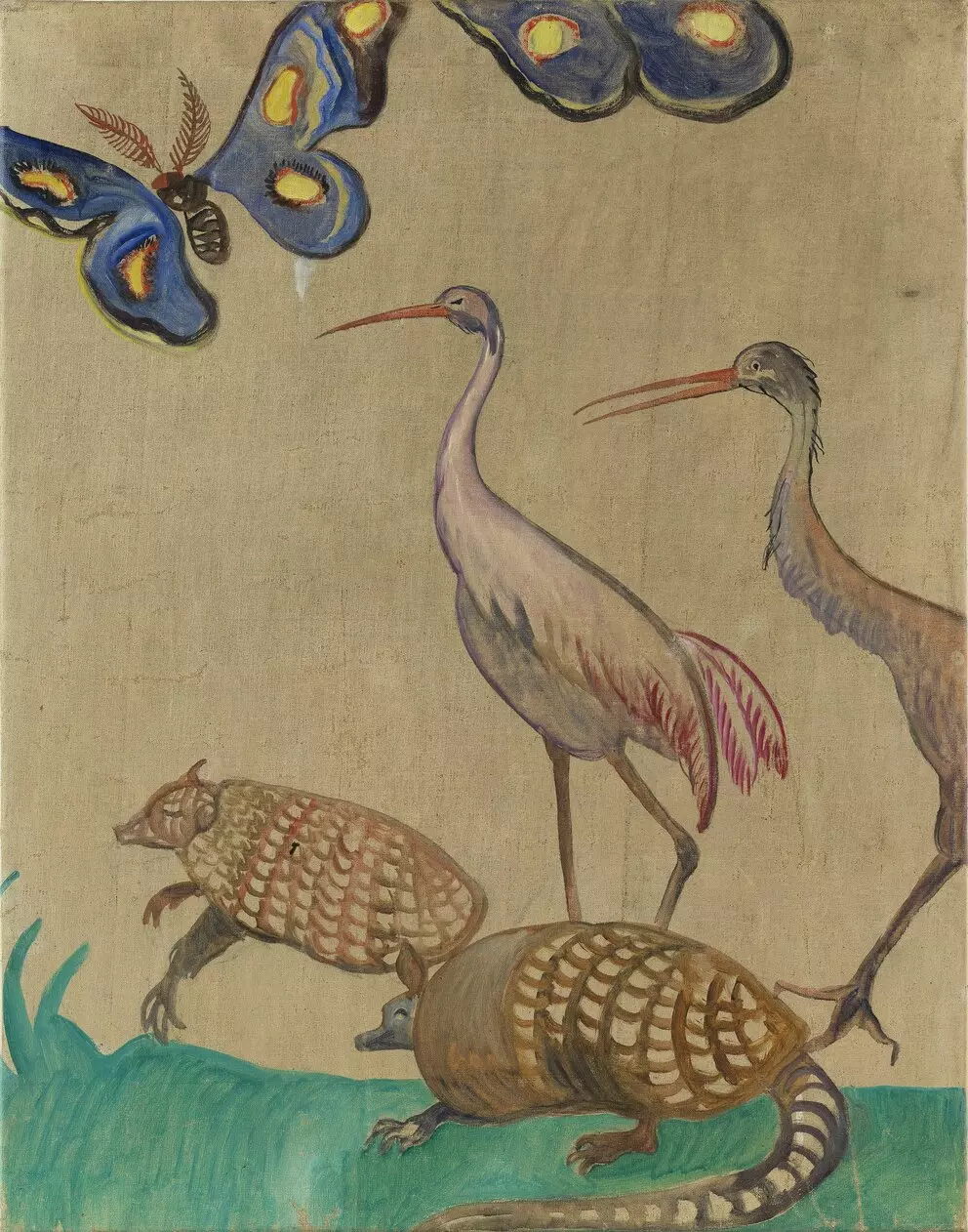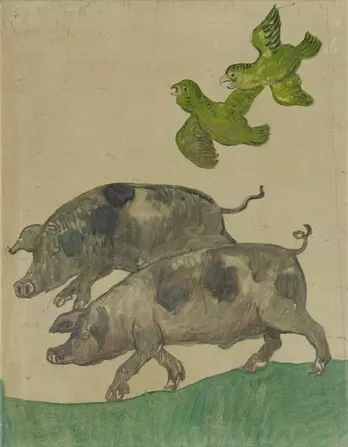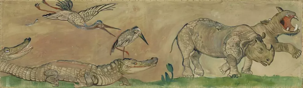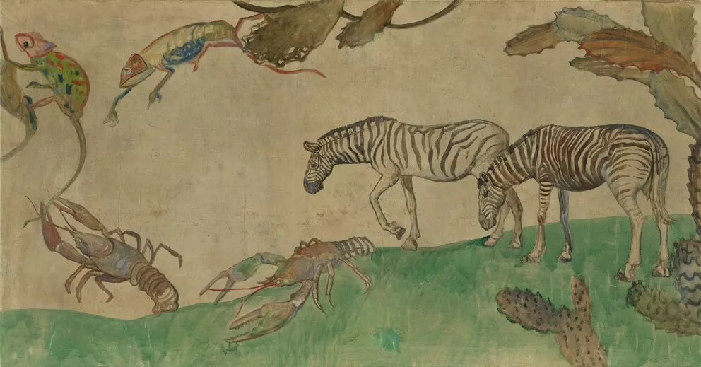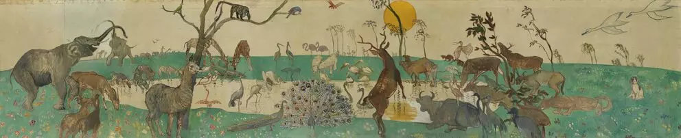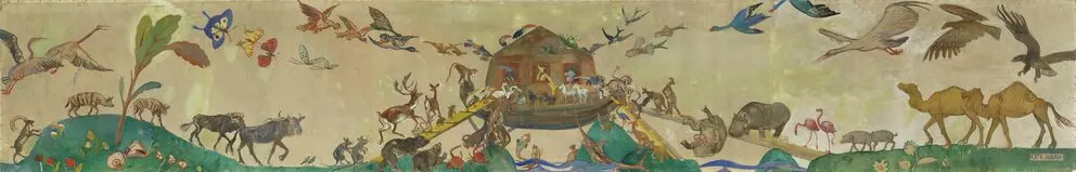 The eighty-meter-long wall frieze by Oskar Laske was created for a home for children, the Rodauner Kinderheim (Elisenstraße 45, 1230) in 1918. Two scenes are shown in magnificent color, on the one side, the animals arranged in pairs stream onto the ark to seek protection from the imminent flood, while in the second scene, they have already survived the catastrophe and the animals are leaving the ship again. With that, Laske brought color and hope into the lives of these home children in the First Republic.