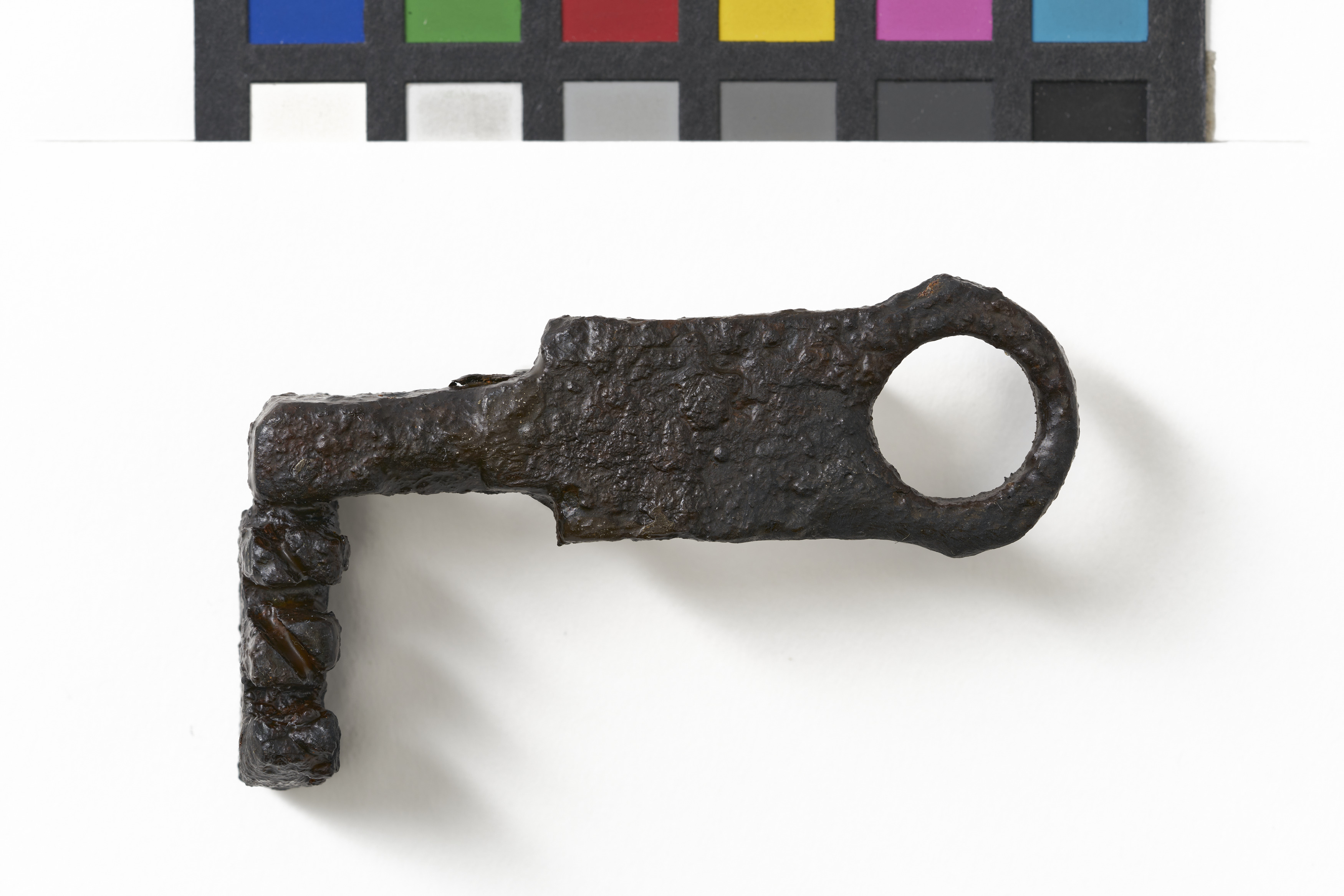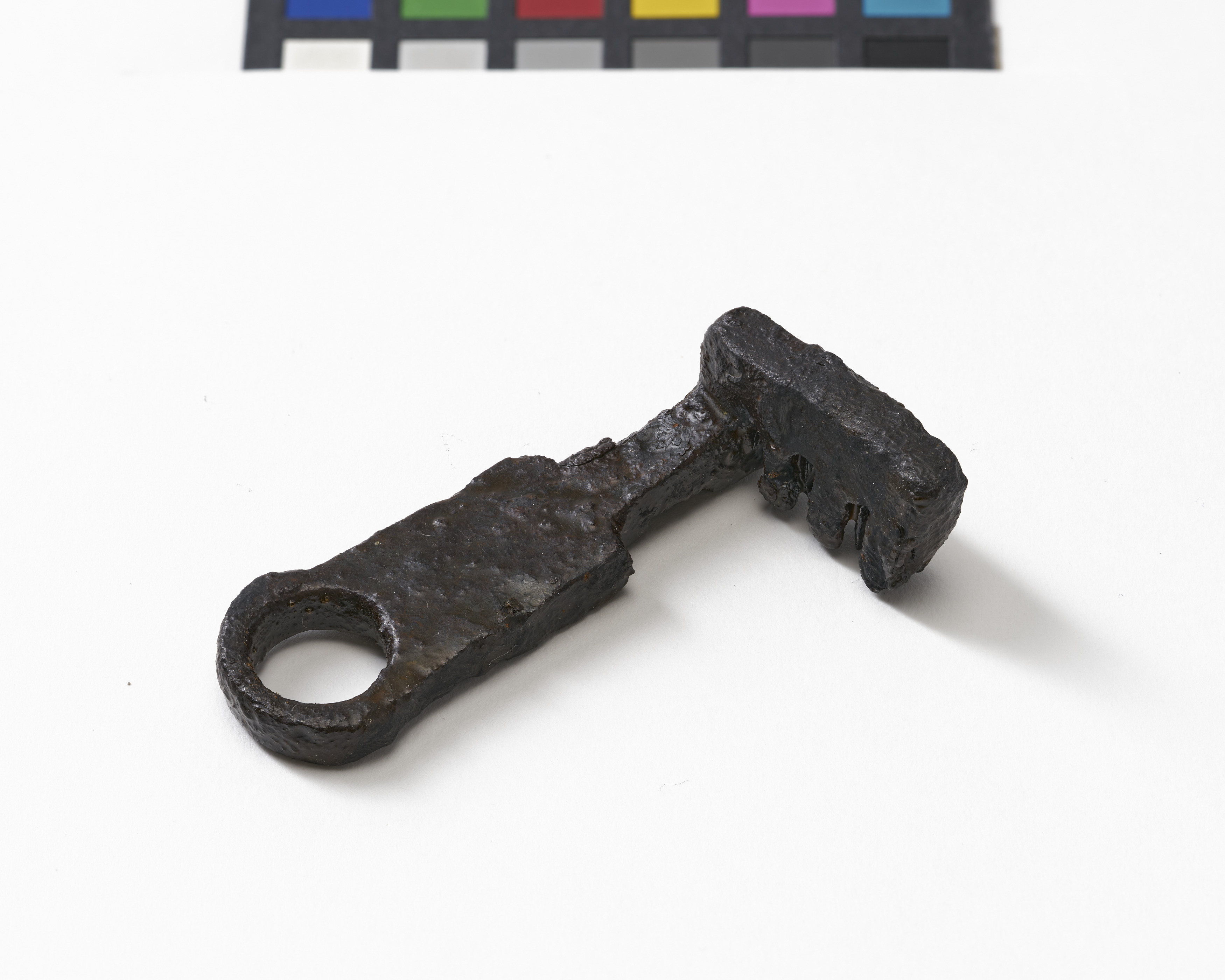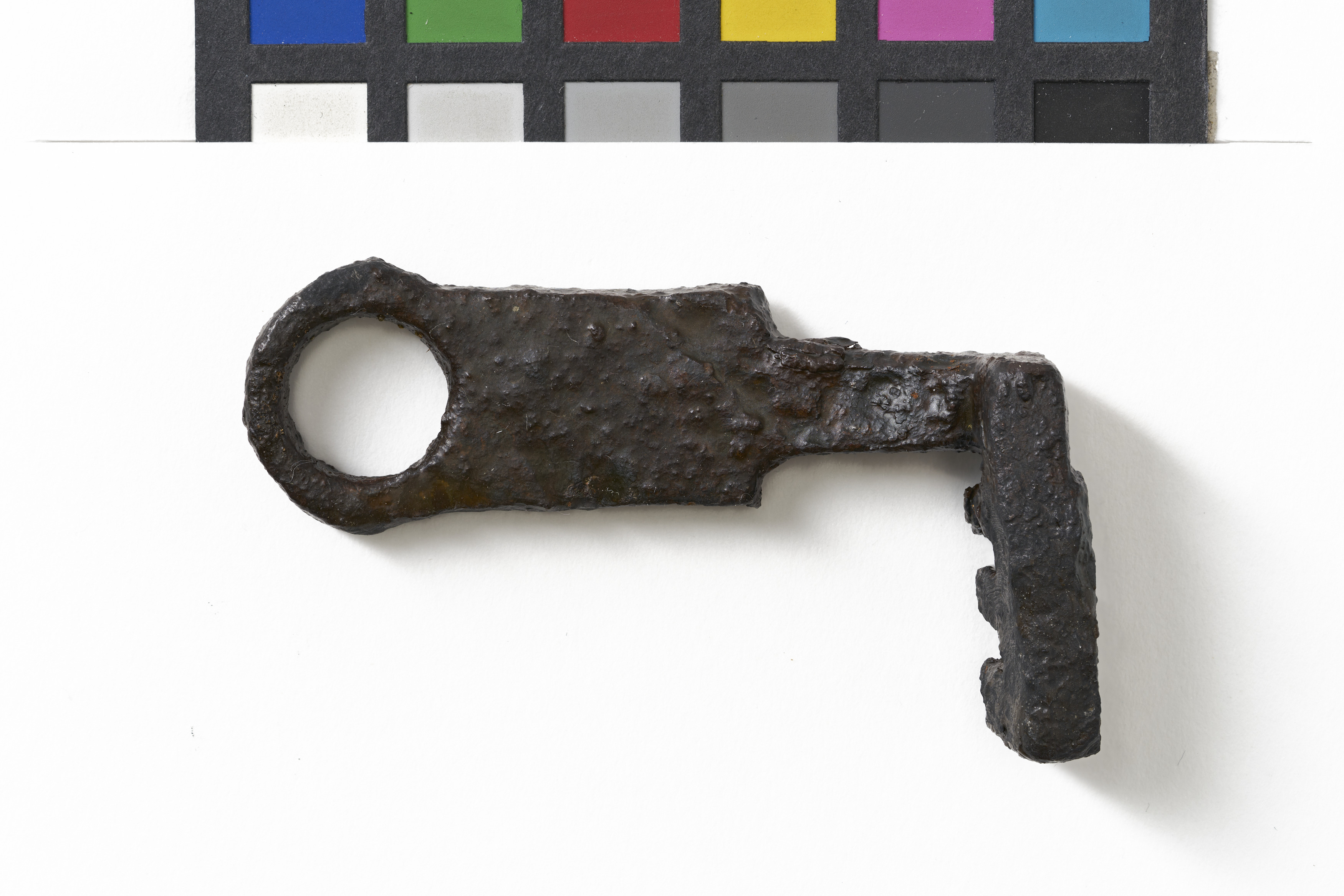 Schlüssel mit flachem, durchlochtem Griff und rechtwinklig abgesetztem, dreiteiligem Bart.