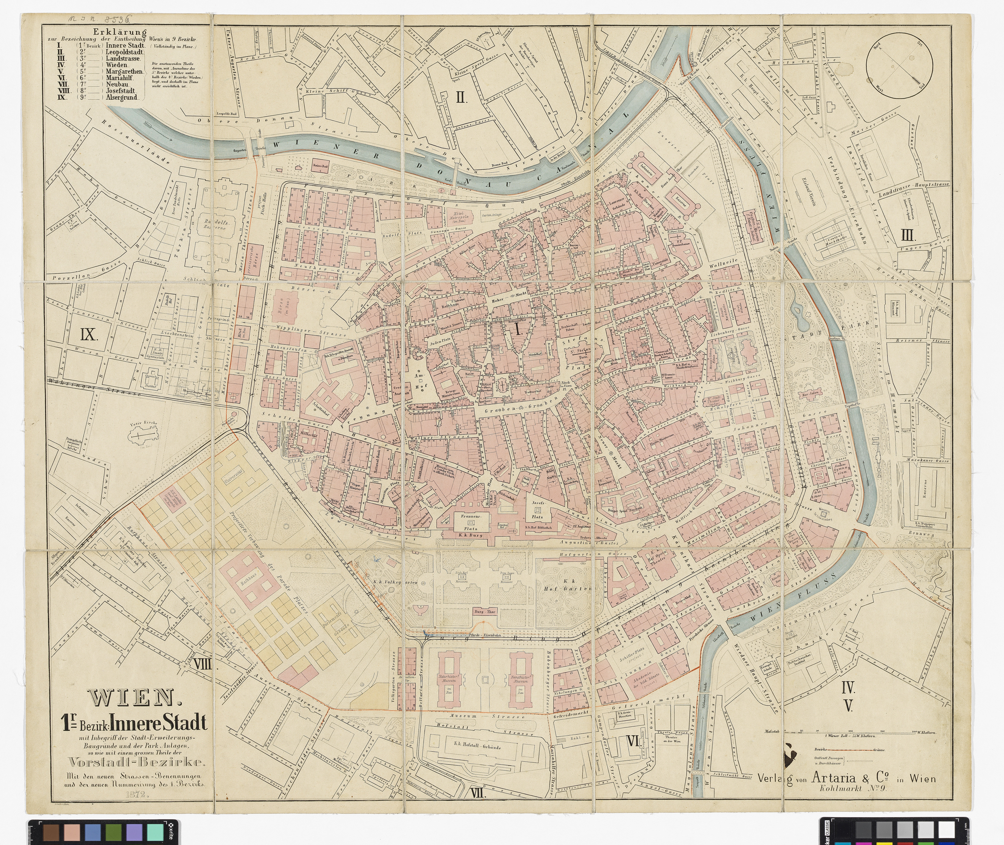 "Wien. 1r=Bezirk: Innere Stadt mit Inbegriff der Stadt-Erweiterungs-Baugründe und der Park-Anlagen sowie mit einem großen Theile der Vorstadt-Bezirke. Mit den neuen Strassen-Benennungen und der neuen Nummerirung des 1. Bezirks."