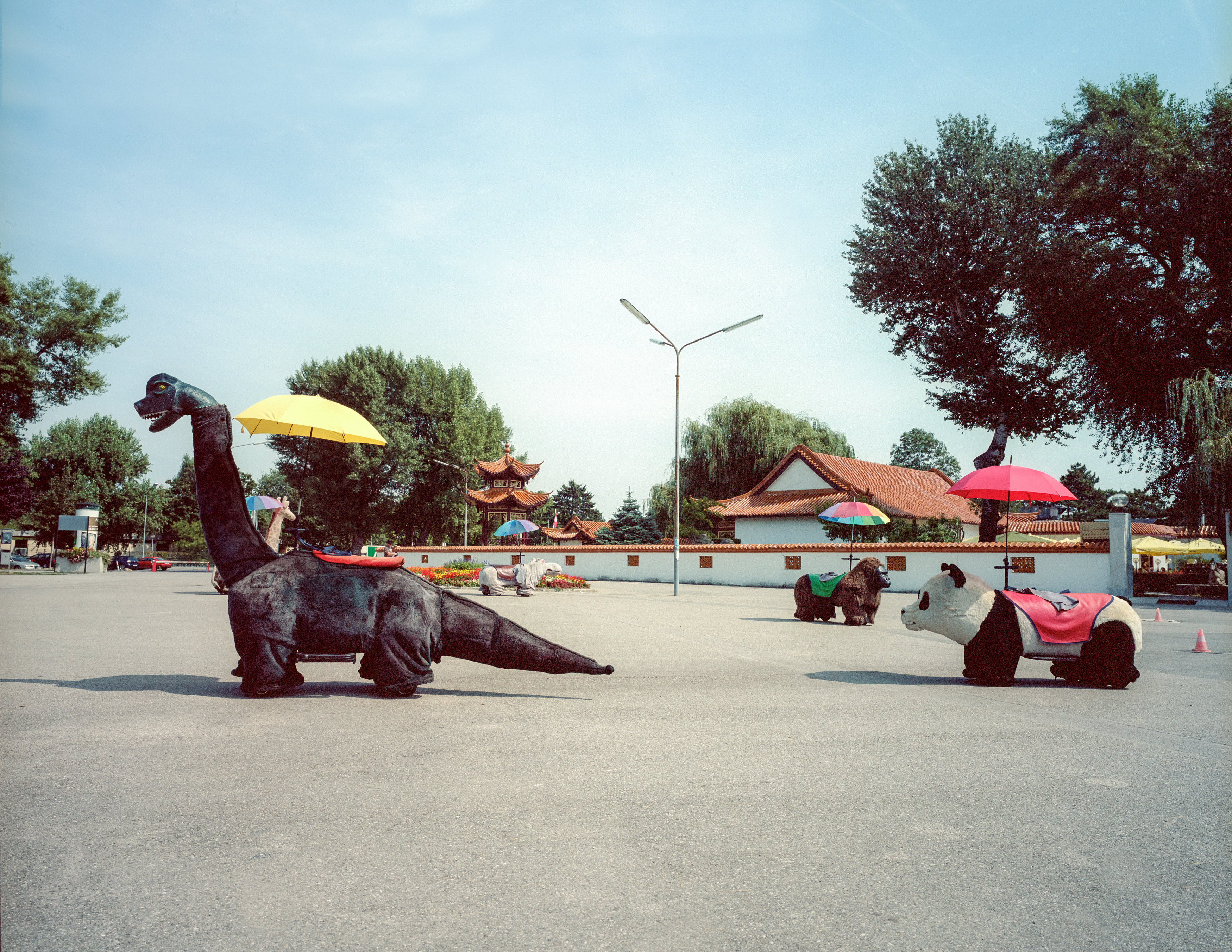 “Dinosaurier und Pandabär” - zwei von mehreren elektrisch bewegten Fahrtieren für Kinder - beim Donauparkeingang Arbeiterstrandbadstraße/U1 Alte Donau; im Hintergrund das ehemalige Au-Restaurant der WIG 64/heute Chinarestaurant Sichuan.Zur Fotoserie: