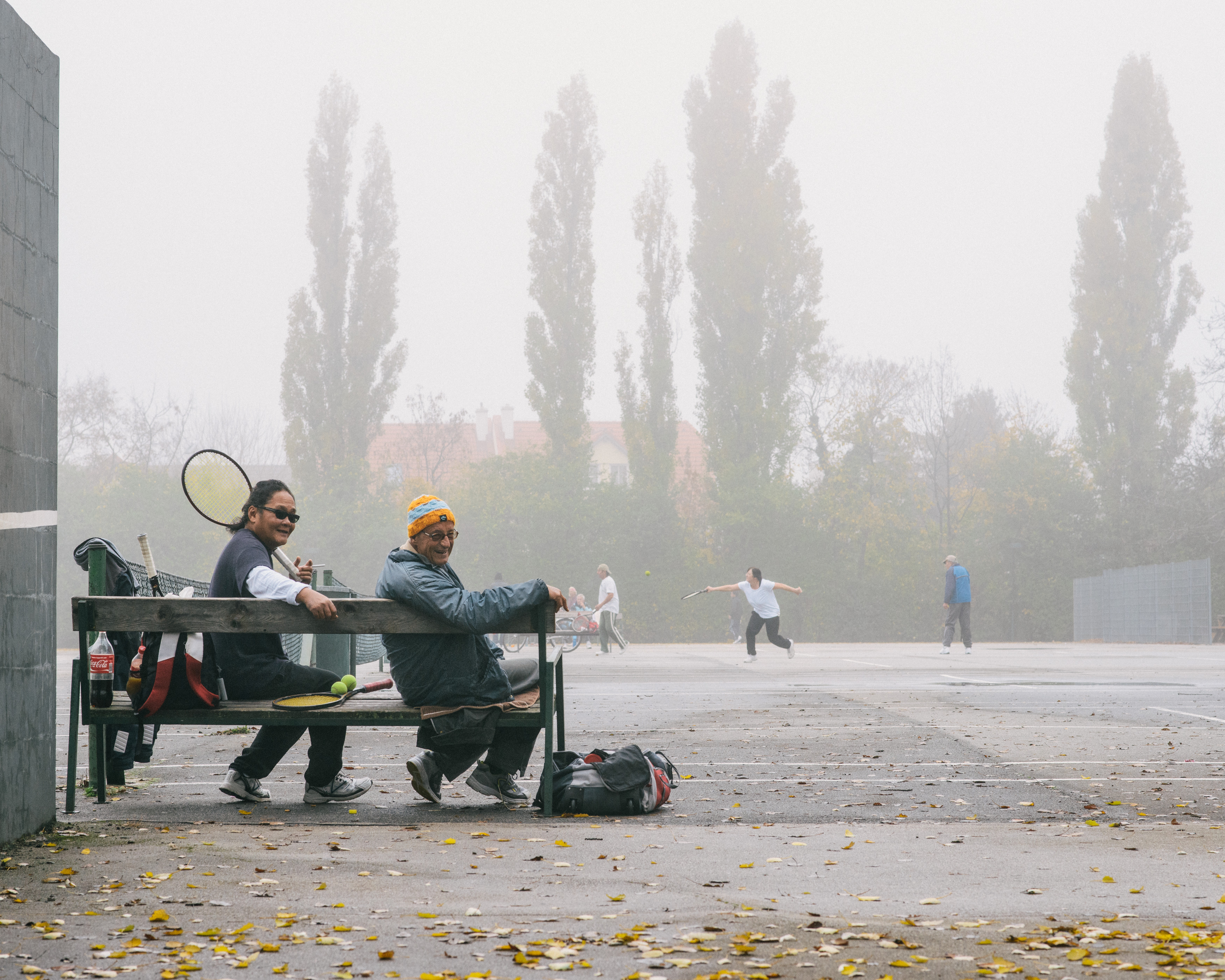 Tennisspieler*innen am Tennisplatz im Donaupark - Wiens einzigem selbstorganisierten Gratis-Tennisplatz, der auf einer von der WIG 64 übrig gebliebenen Asphaltfläche entstand.