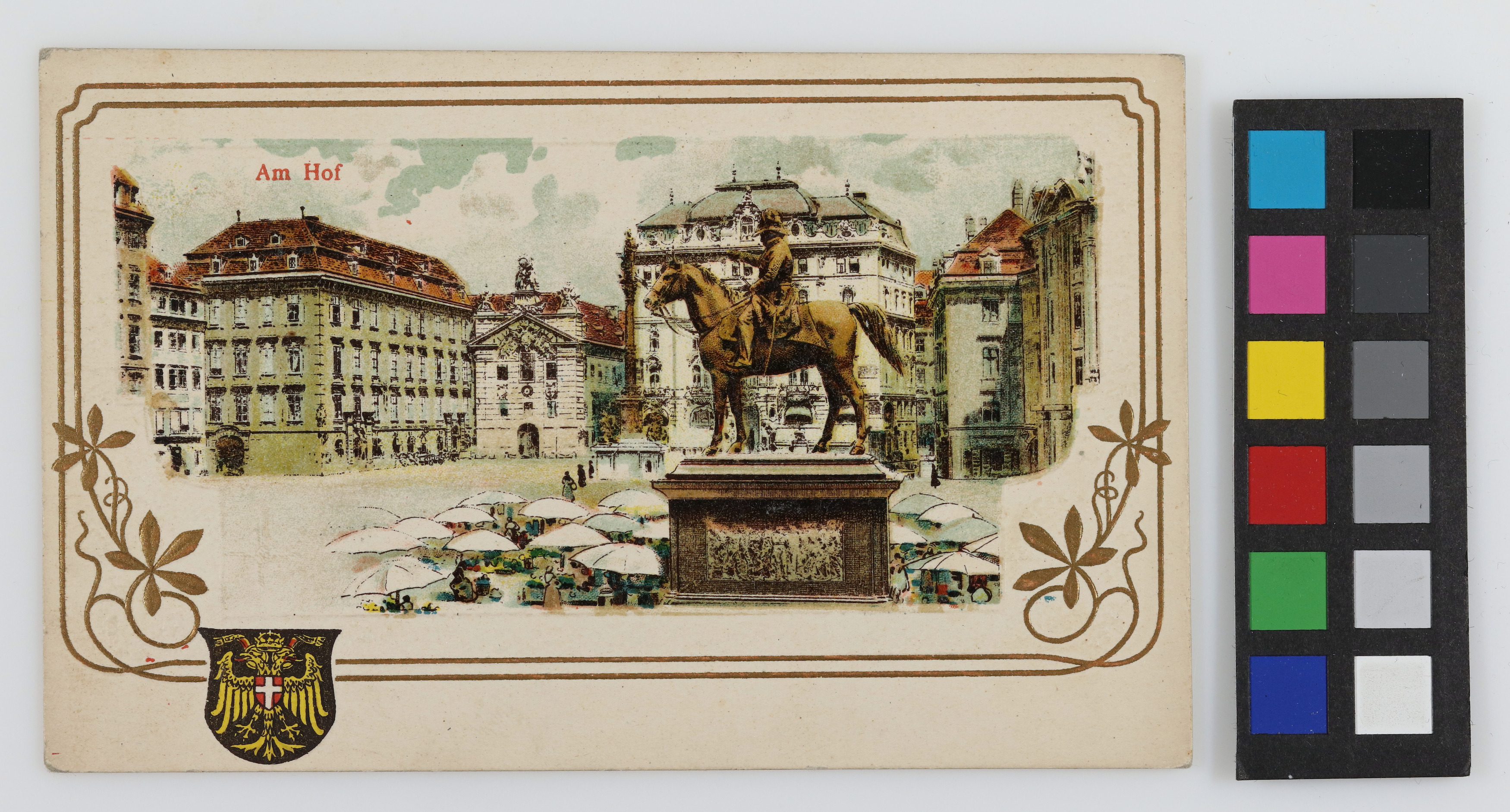 - 1., Am Hof - Blick gegen Zeughaus, Ansichtskarte mit Prägedruck und Stadtwappen