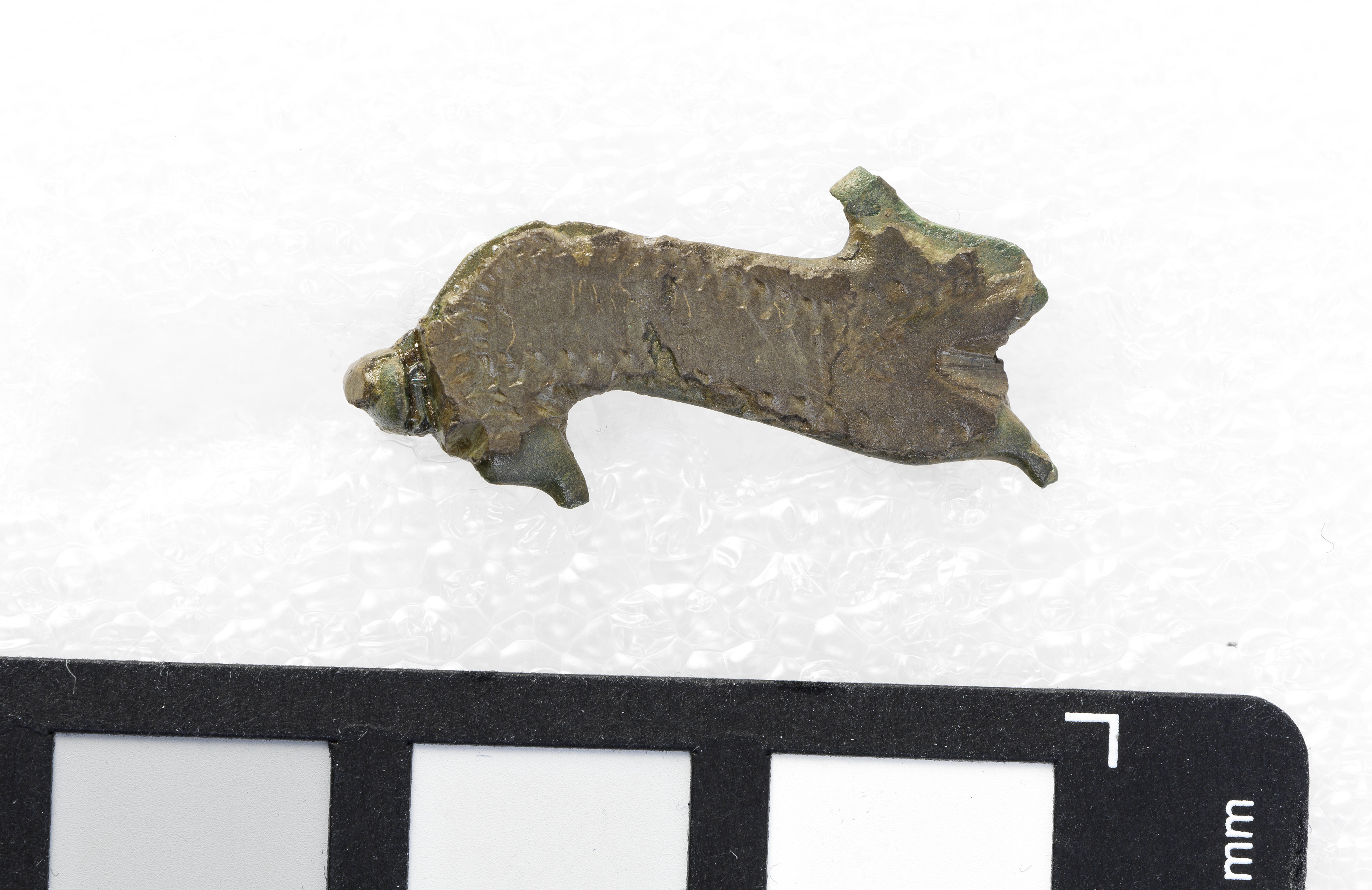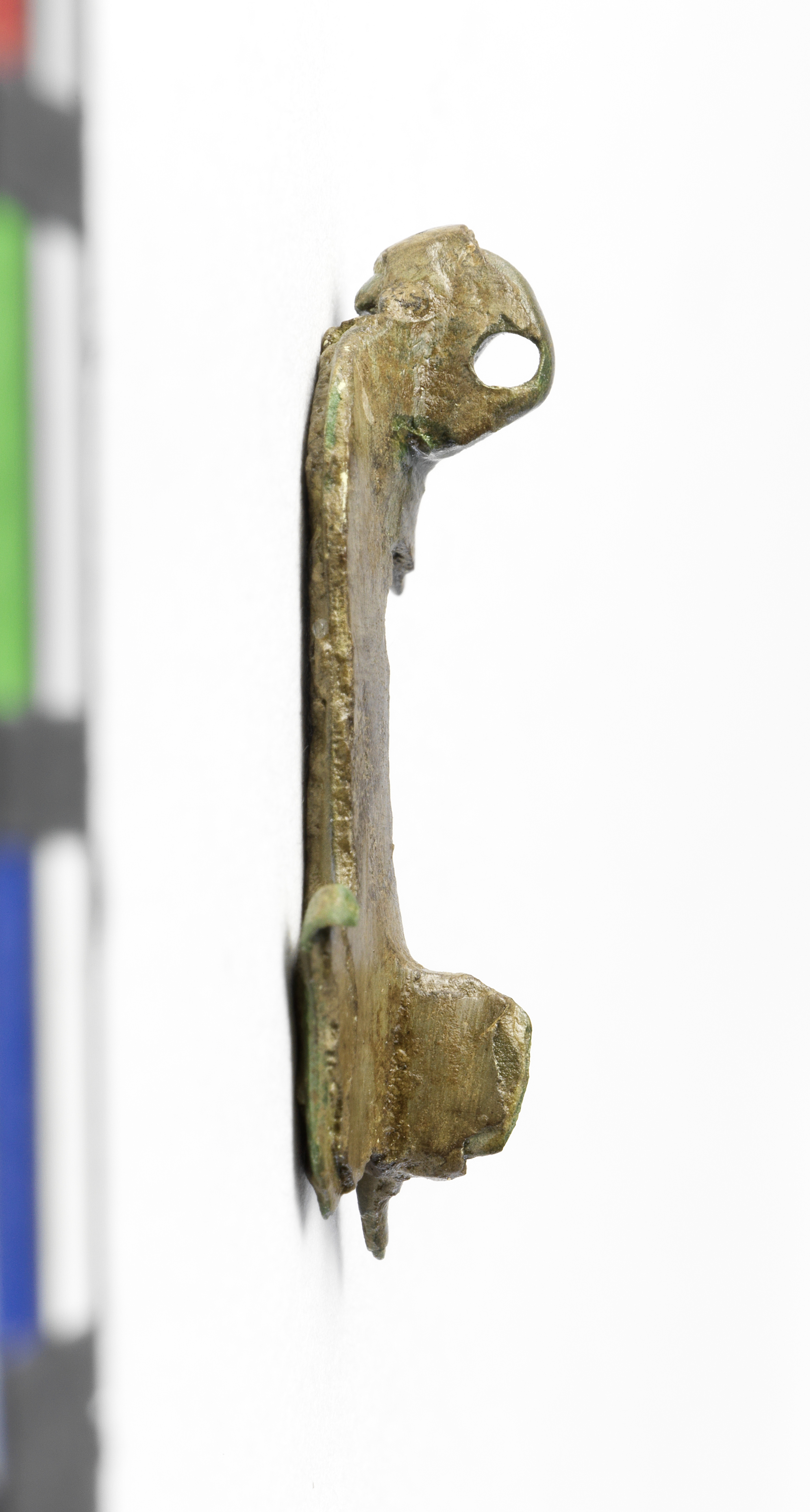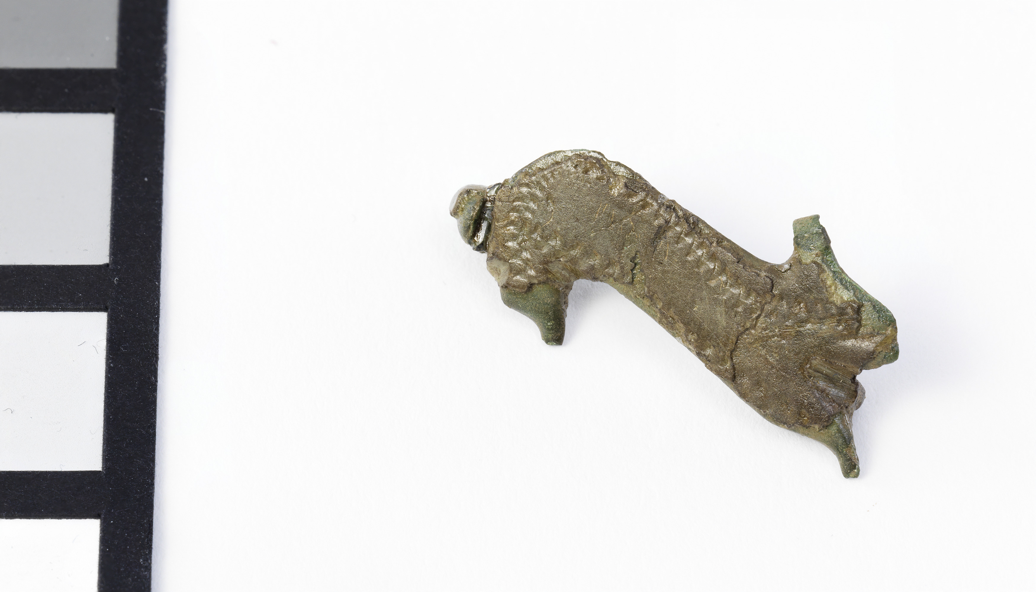 Tierfibel in Hasenform Variante 2b (nach Matouschek/Nowak 1981/82); zweigliedrige Spiralfibel mit viereckigem Nadelhalter, randbegleitender Wolfszahndekor; Spirale und Nadel fehlen, korrodiert.
