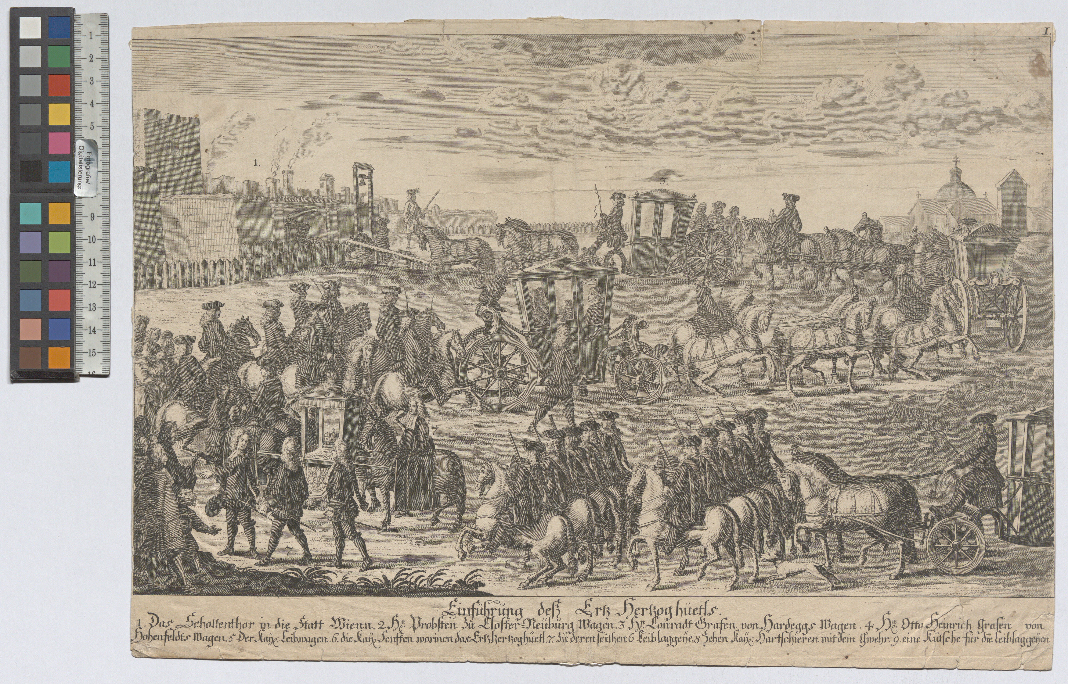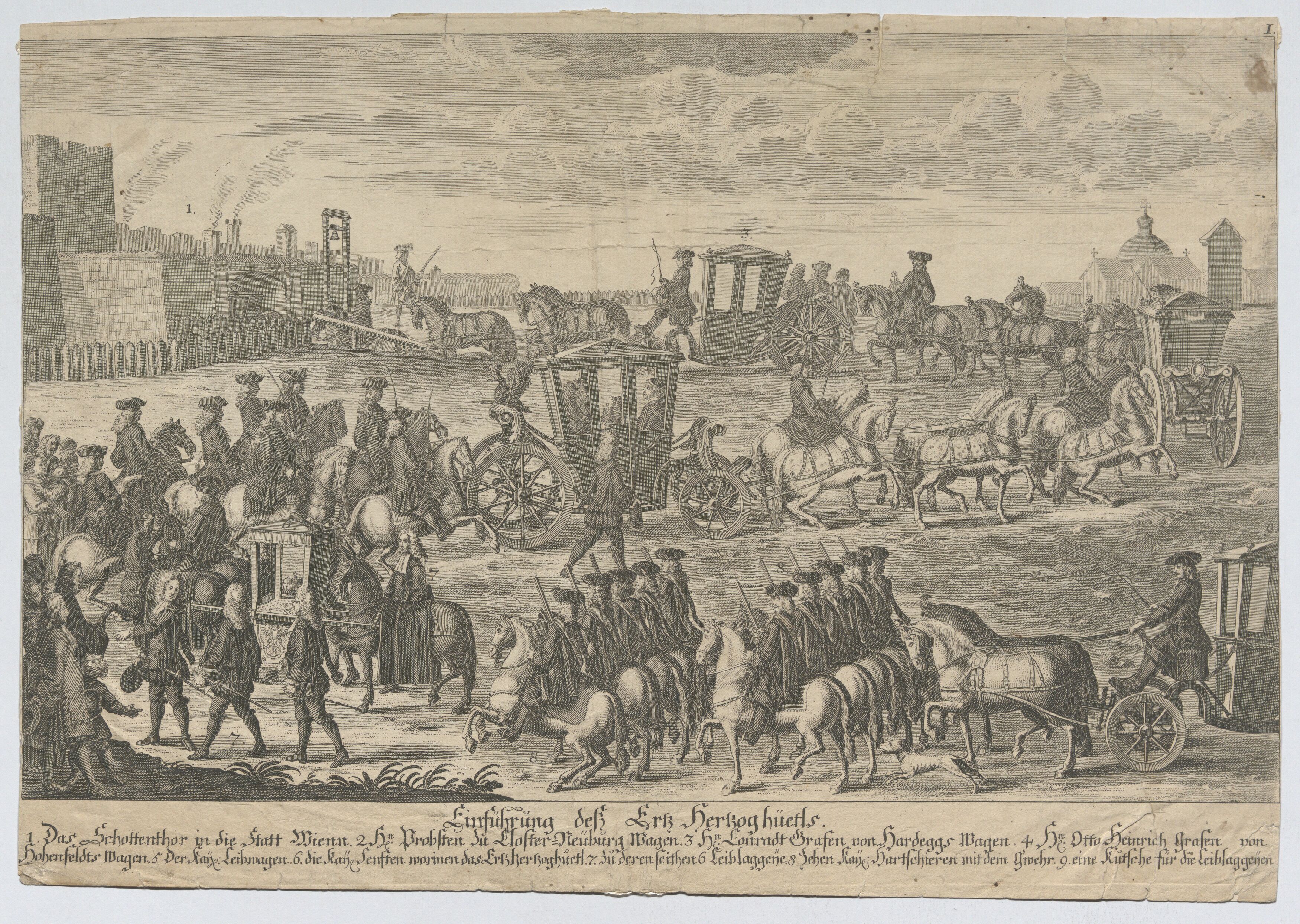 Erbhuldigung der niederösterreichischen Stände für Karl VI. am 8. November 1712, Tafel I: Einbringung des Erzherzoghutes aus Klosterneuburg nach Wien