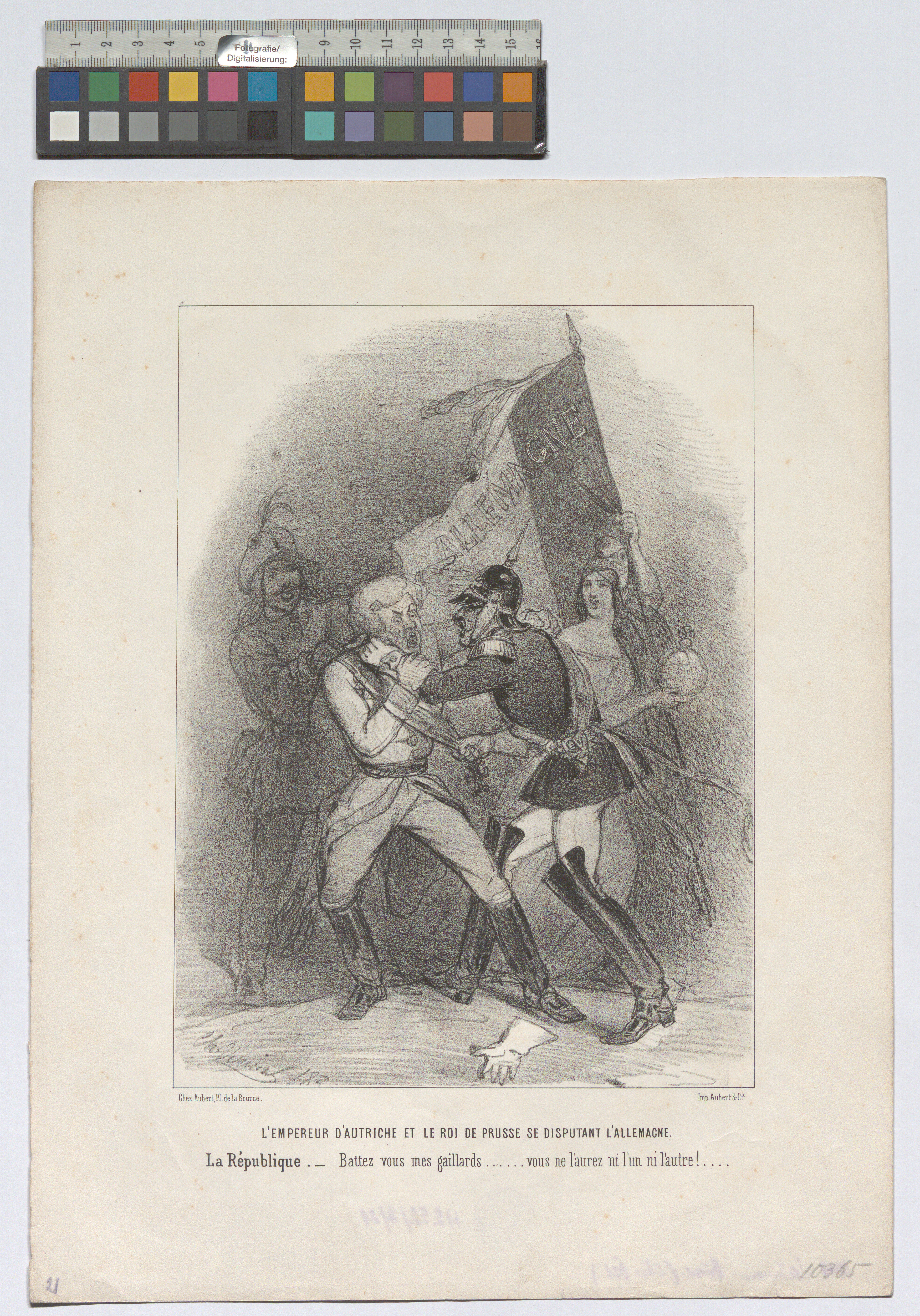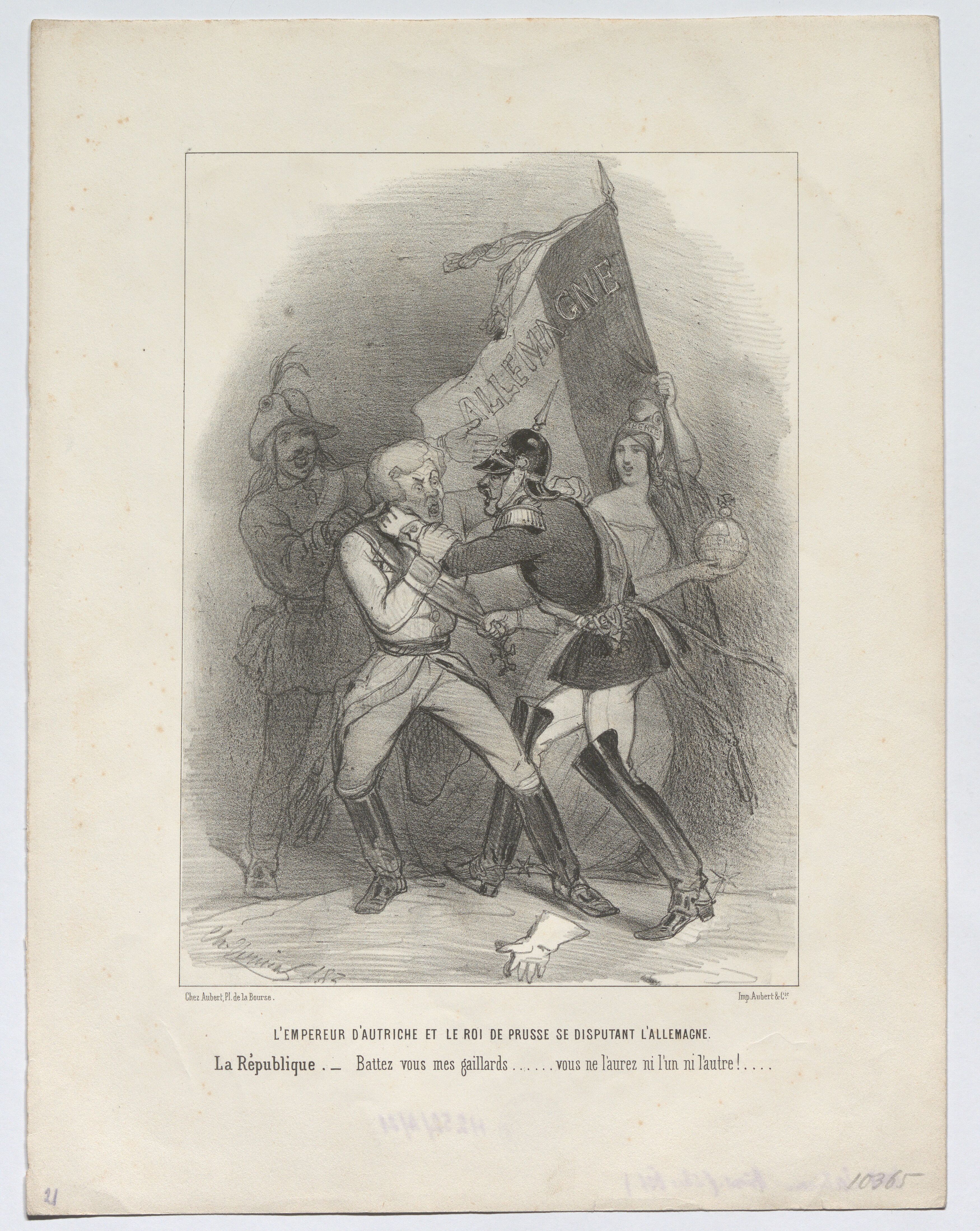 "L'EMPEREUR D'AUTRICHE ET LE ROI DE PRUSSE SE DISPUTANT L'ALLEMAGNE." (Karikatur: König Friedrich Wilhelm IV. von Preußen und Kaiser Ferdinand I. streiten um Deutschland)