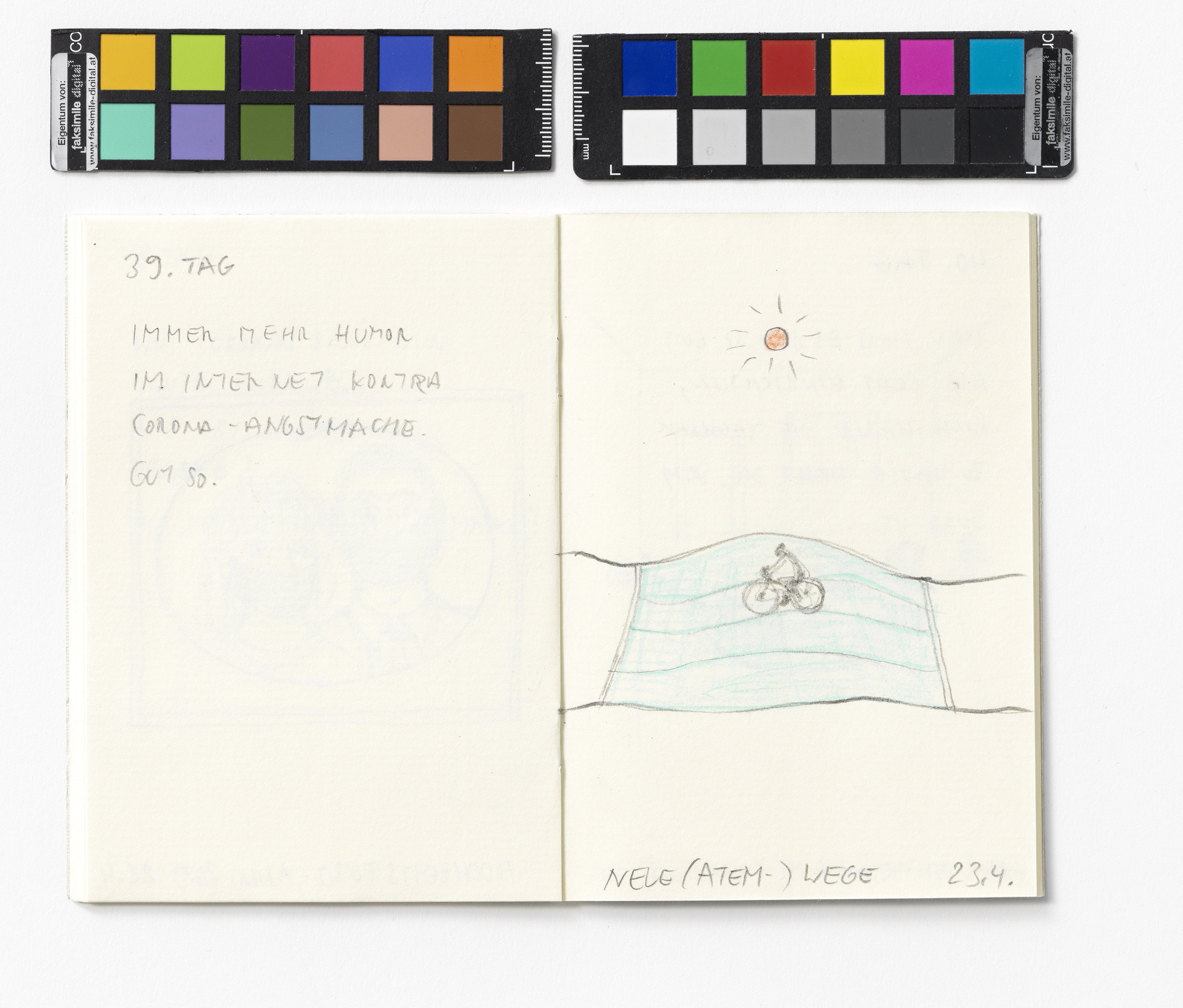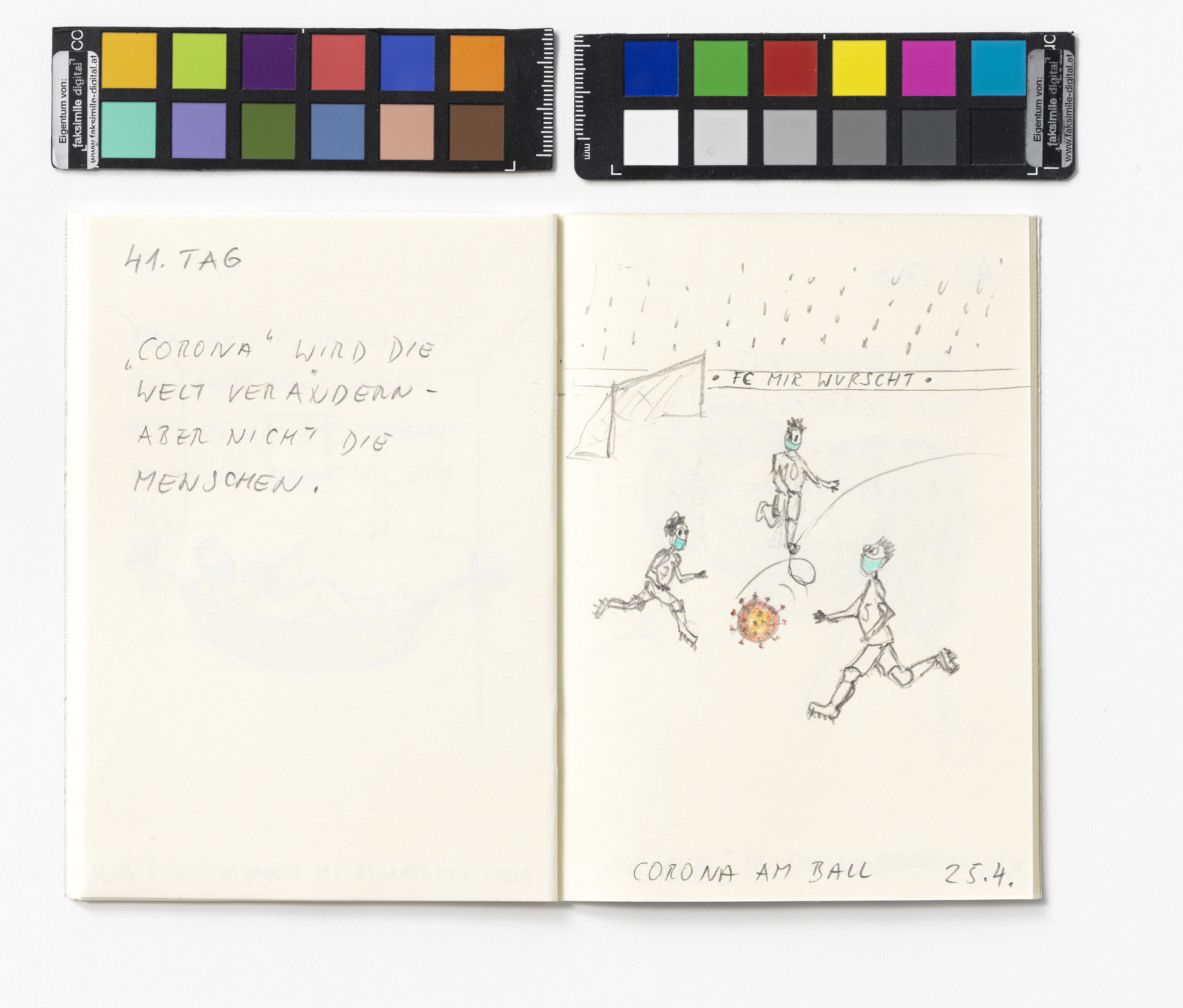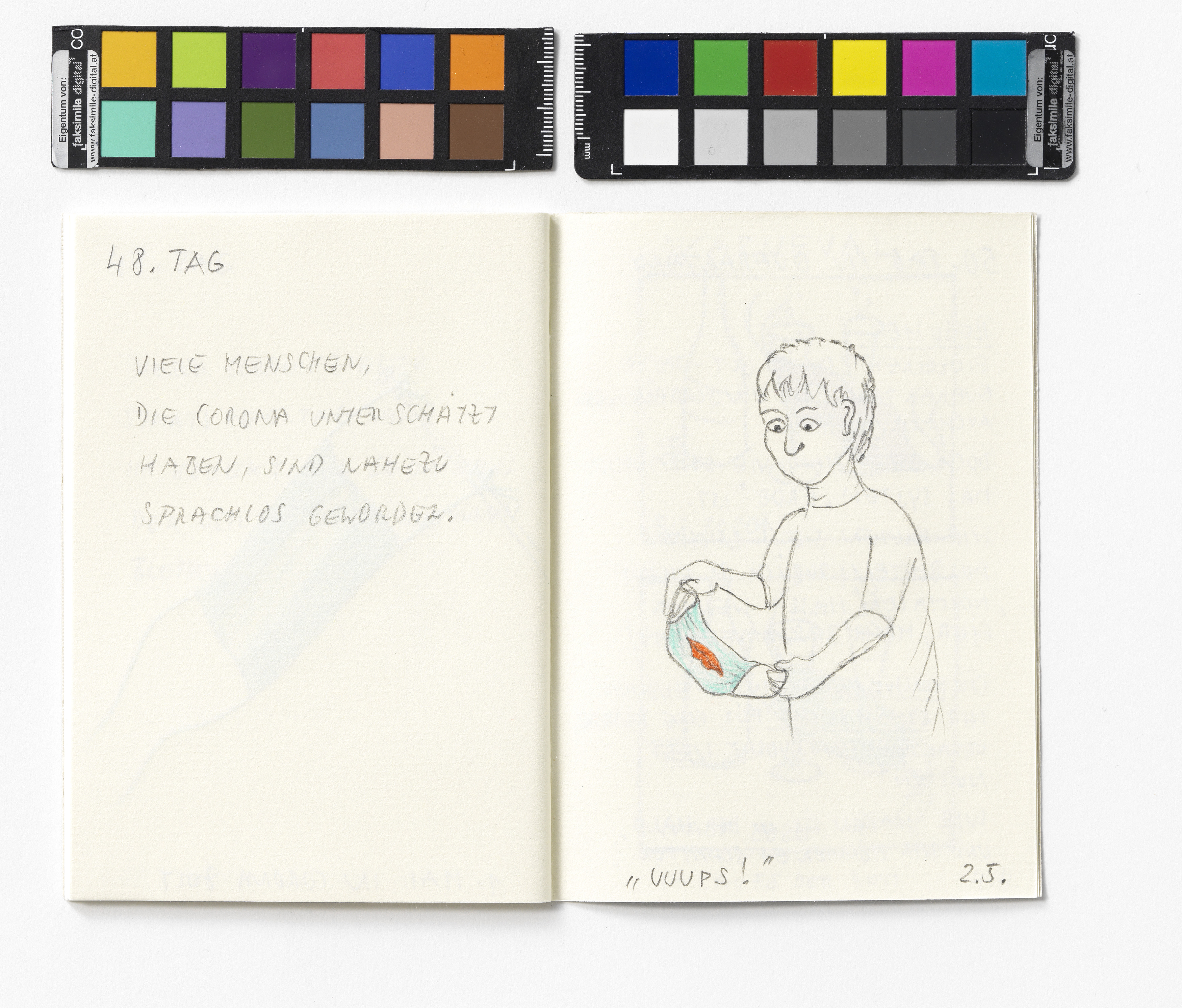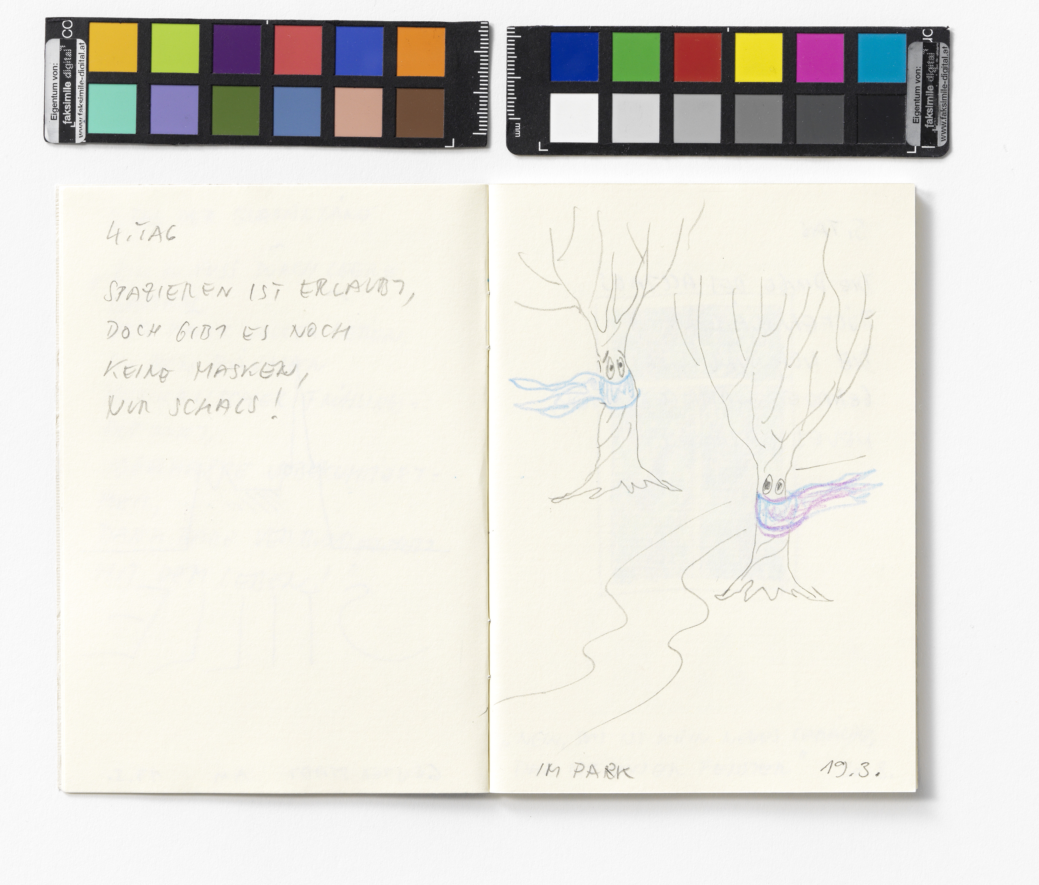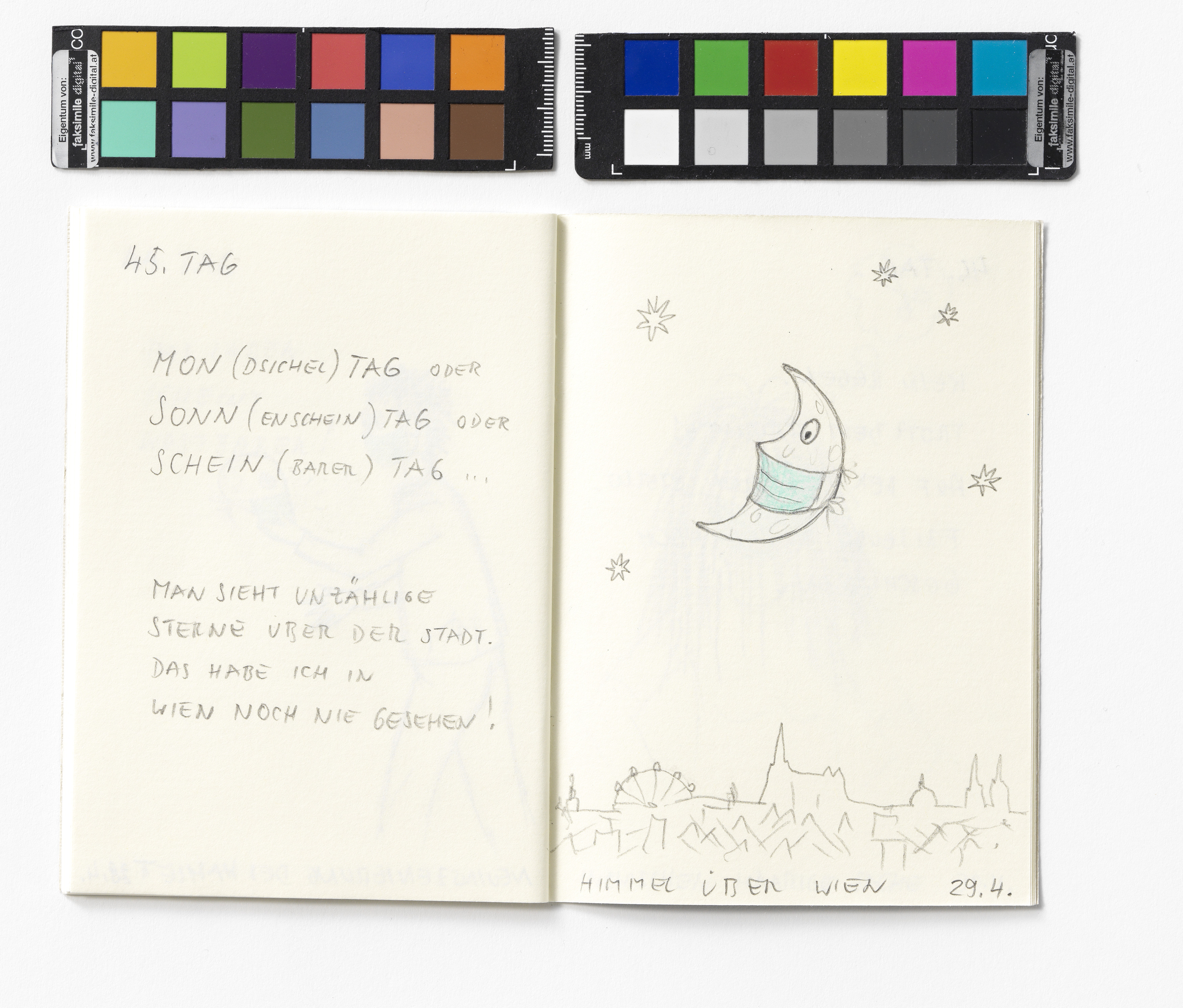 Heft mit 48 Seiten, das die Künstlerin (im Hauptberuf bis zu ihrer Pensionierung 2020 im Bundesministerium für Digitalisierung und Wirtschaftsstandort tätig) in den ersten 50 Tagen des Corona-Lockdowns als Tagebuch führte. Insgesamt fertigte sie 24 Zeichnungen und Kommentare auf je einer Doppelseite an. “Das Papier ist leider etwas dünn, ich konnte jedoch in der Krise kein besseres kaufen, weil ja alles zu war”, schrieb Stefanie Grüssl in einem E-Mail an das Wien Museum am 4. Juni 2020.