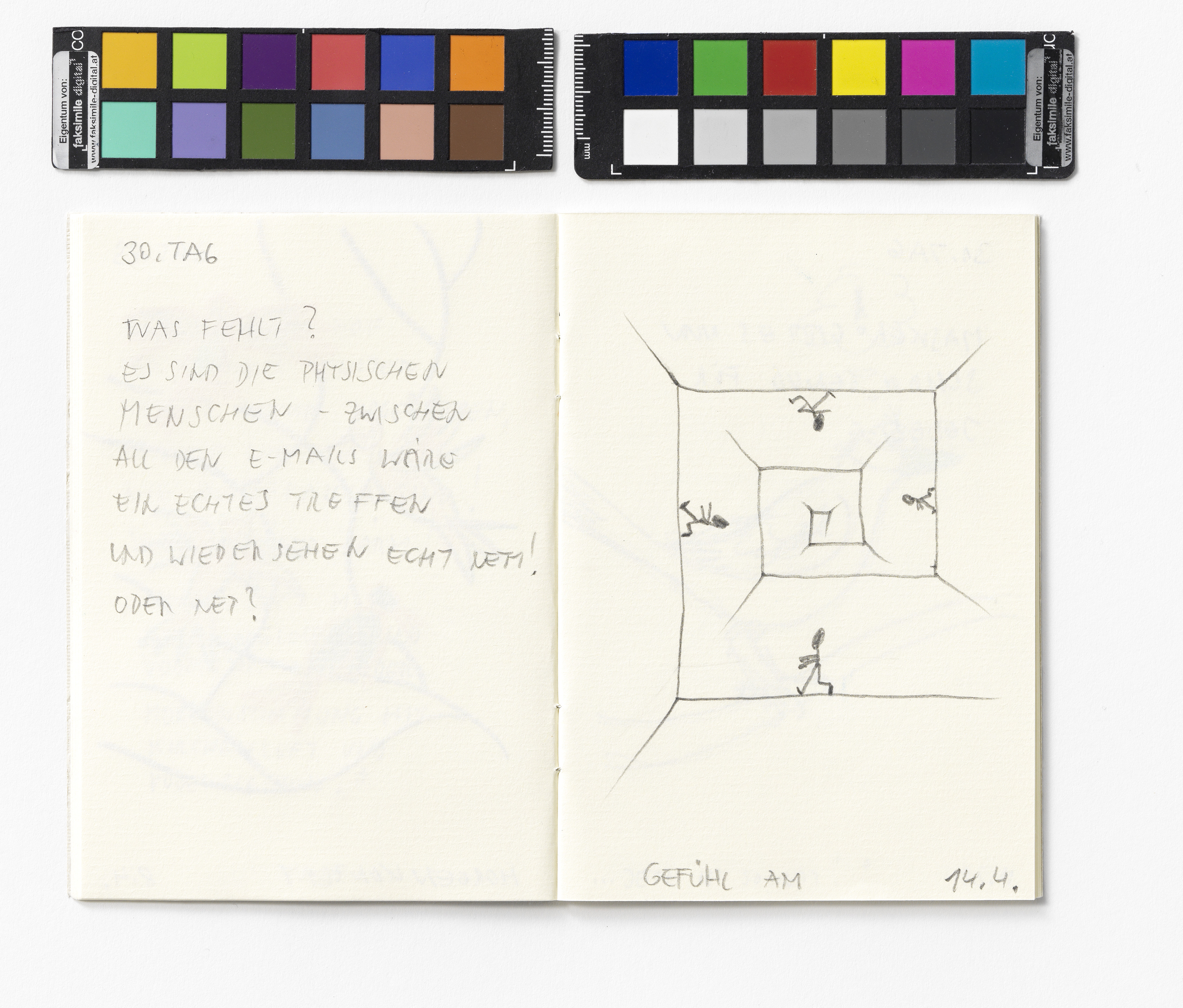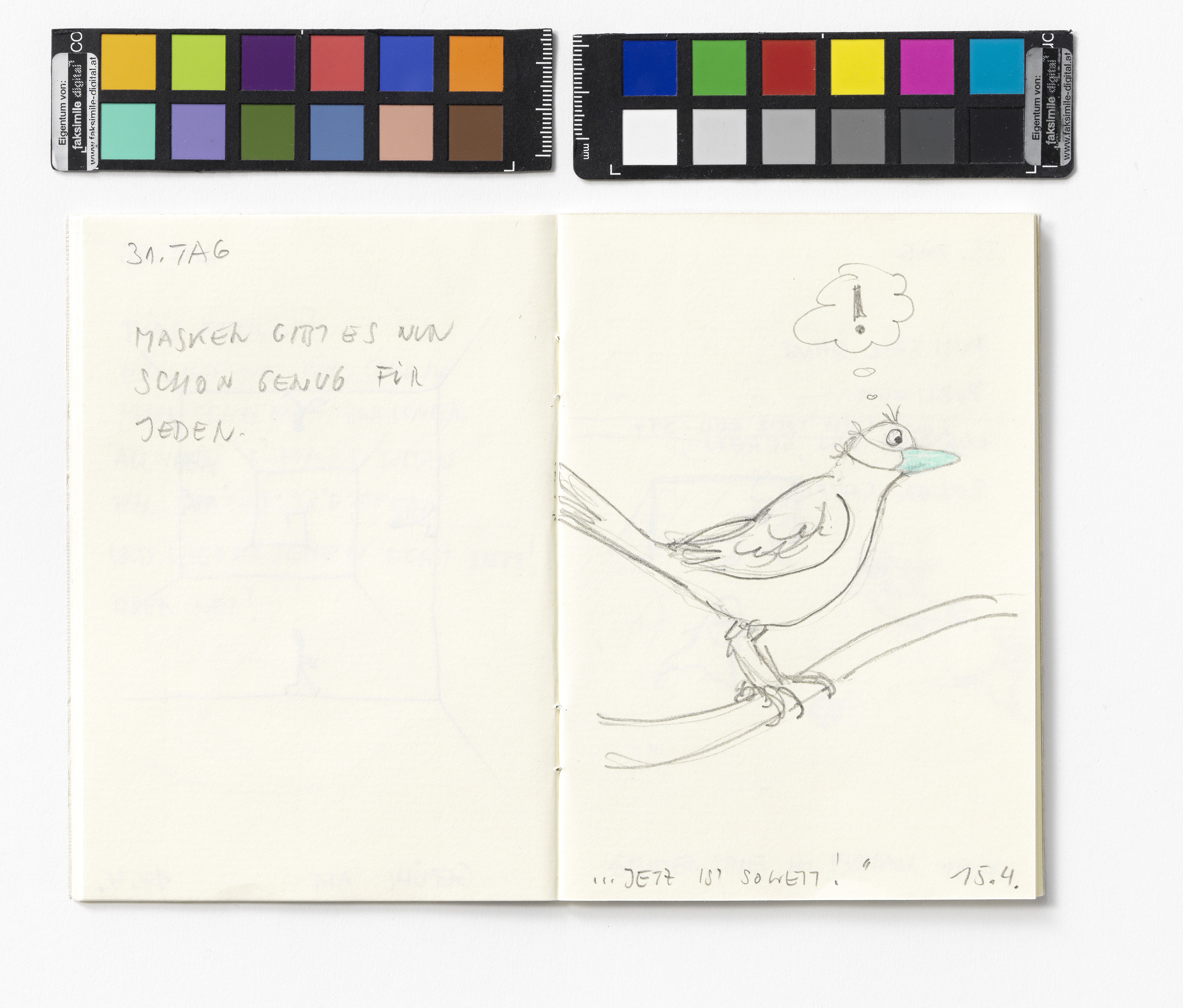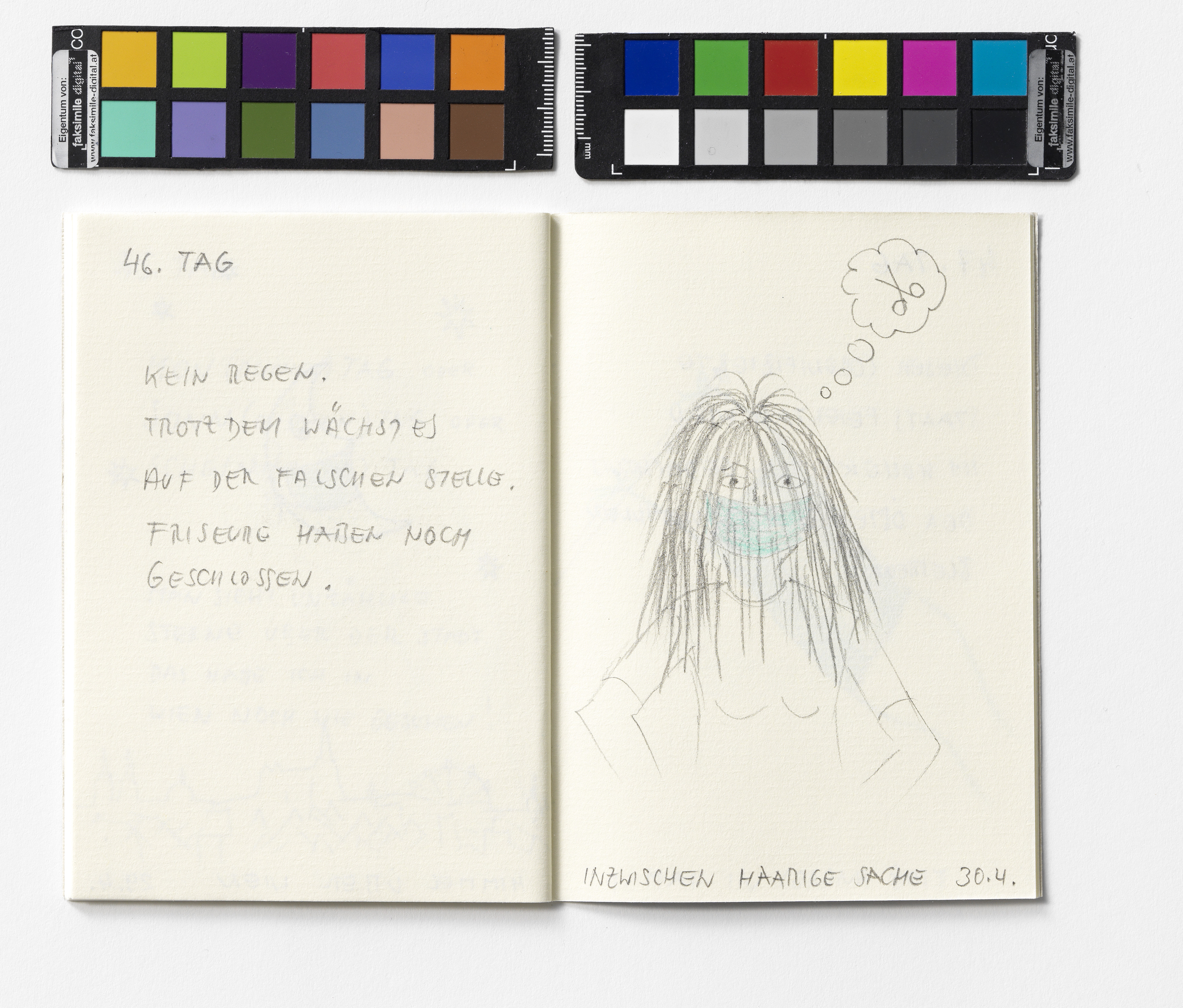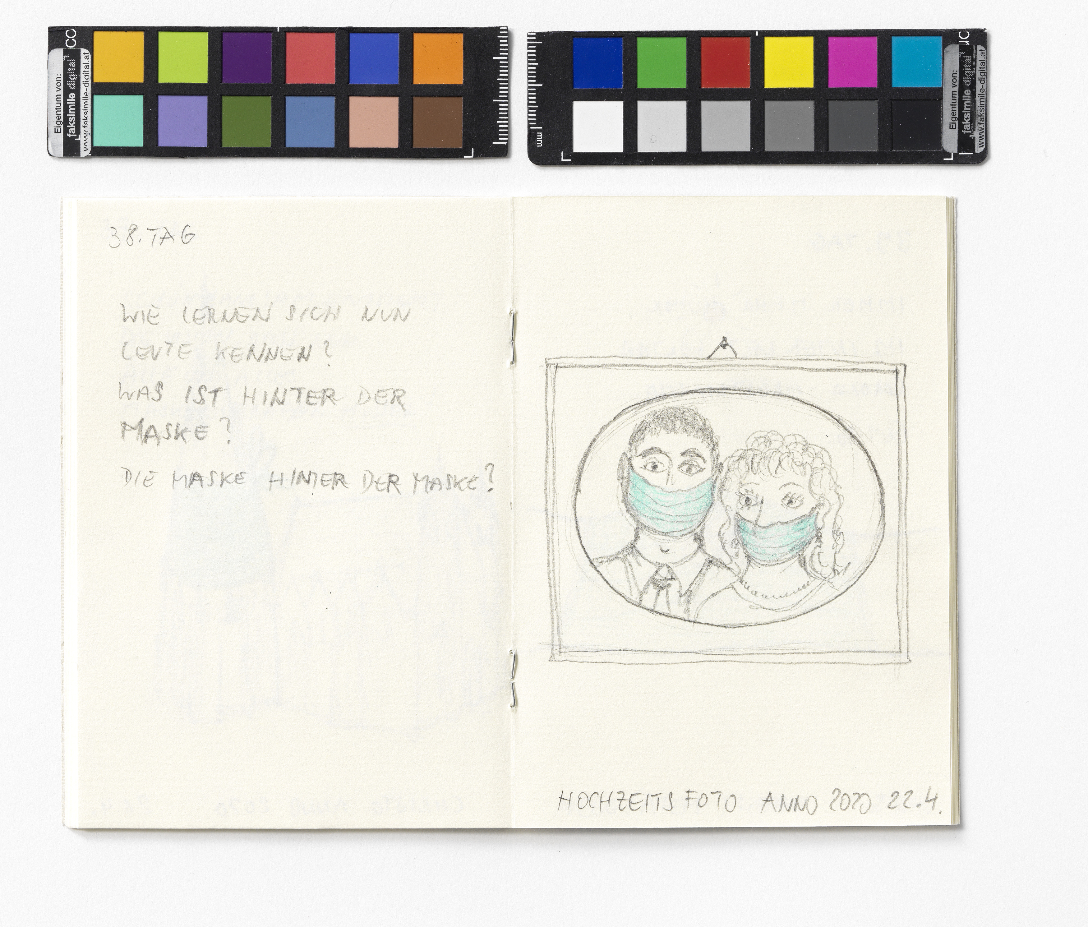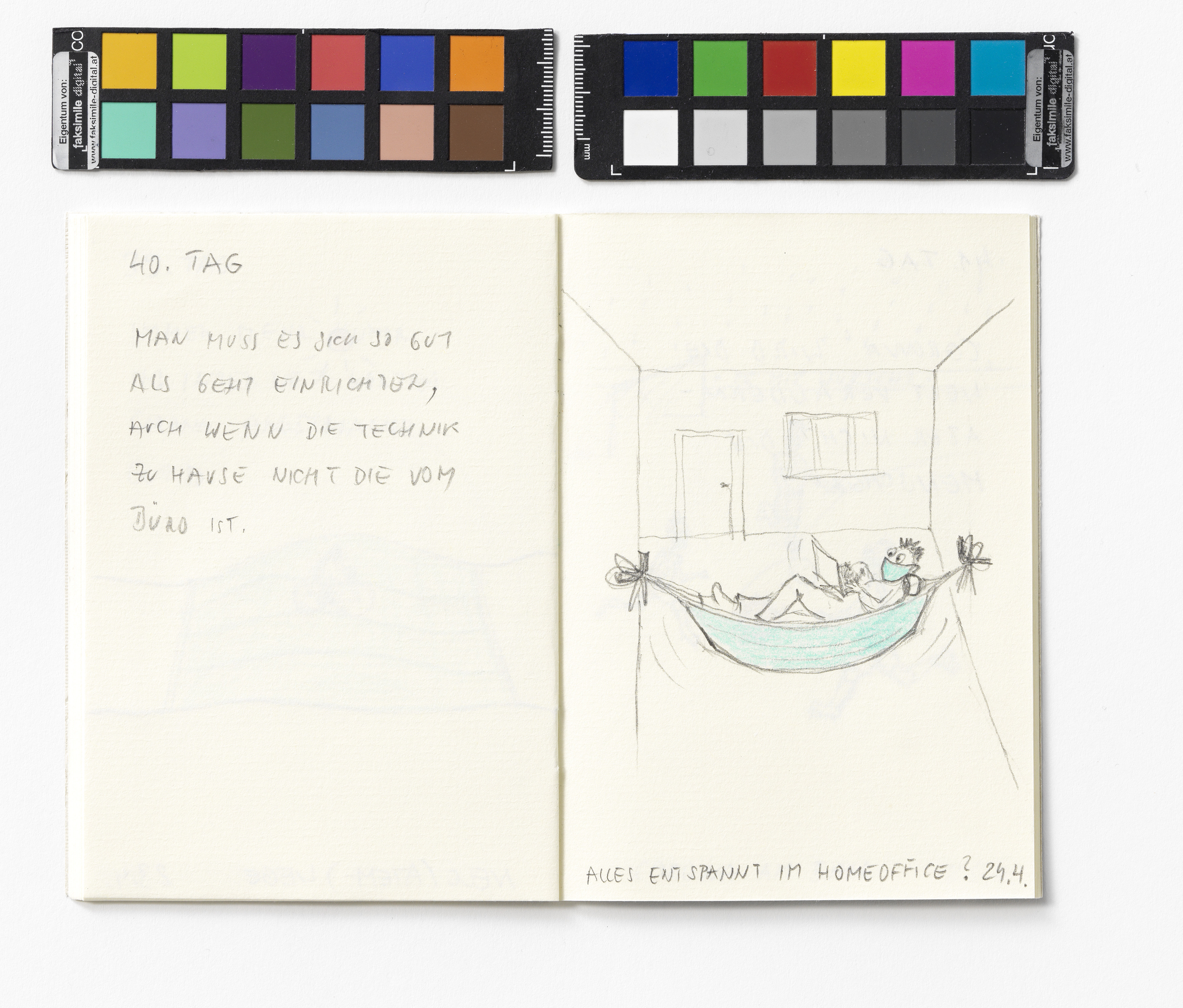 Heft mit 48 Seiten, das die Künstlerin (im Hauptberuf bis zu ihrer Pensionierung 2020 im Bundesministerium für Digitalisierung und Wirtschaftsstandort tätig) in den ersten 50 Tagen des Corona-Lockdowns als Tagebuch führte. Insgesamt fertigte sie 24 Zeichnungen und Kommentare auf je einer Doppelseite an. “Das Papier ist leider etwas dünn, ich konnte jedoch in der Krise kein besseres kaufen, weil ja alles zu war”, schrieb Stefanie Grüssl in einem E-Mail an das Wien Museum am 4. Juni 2020.