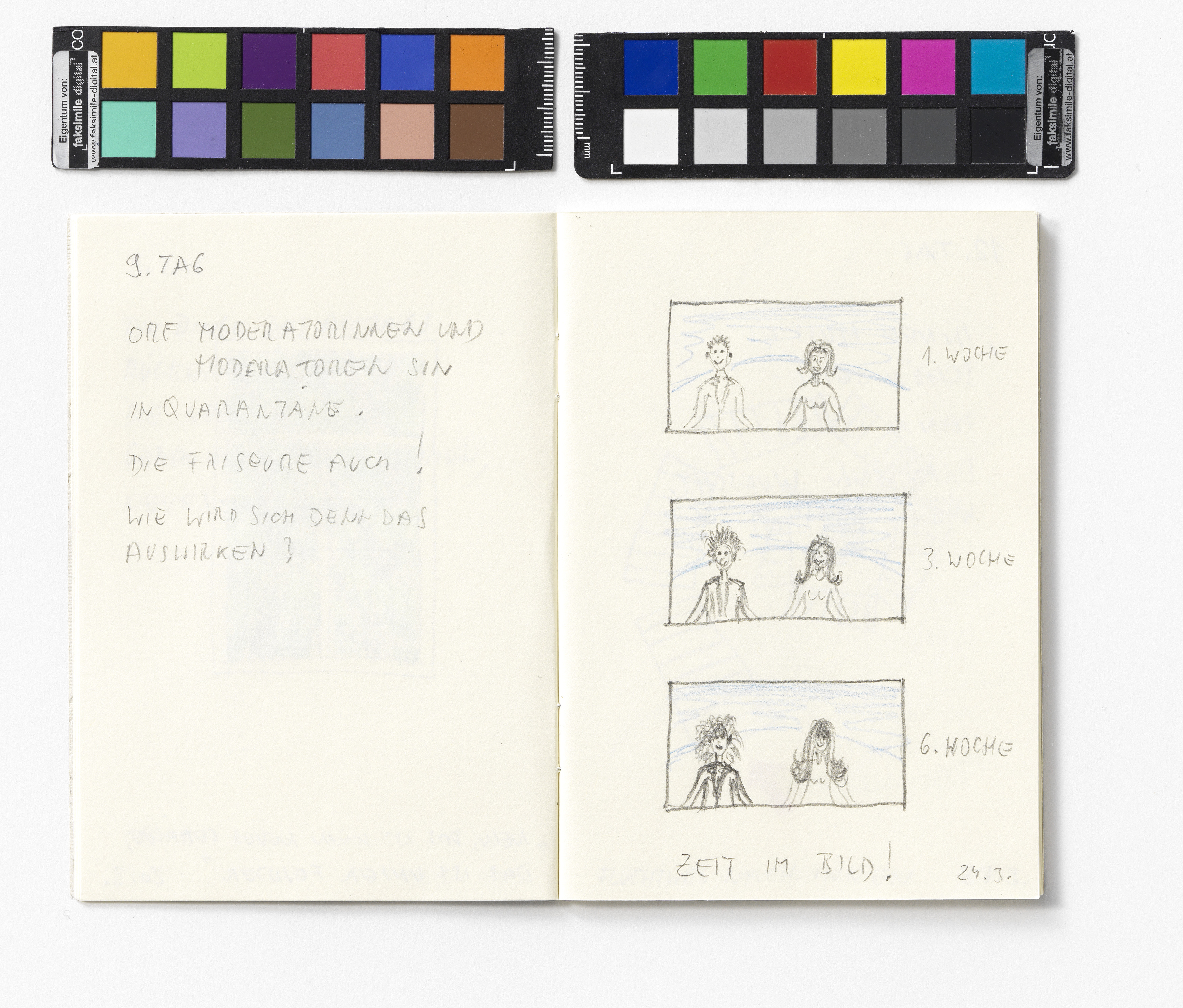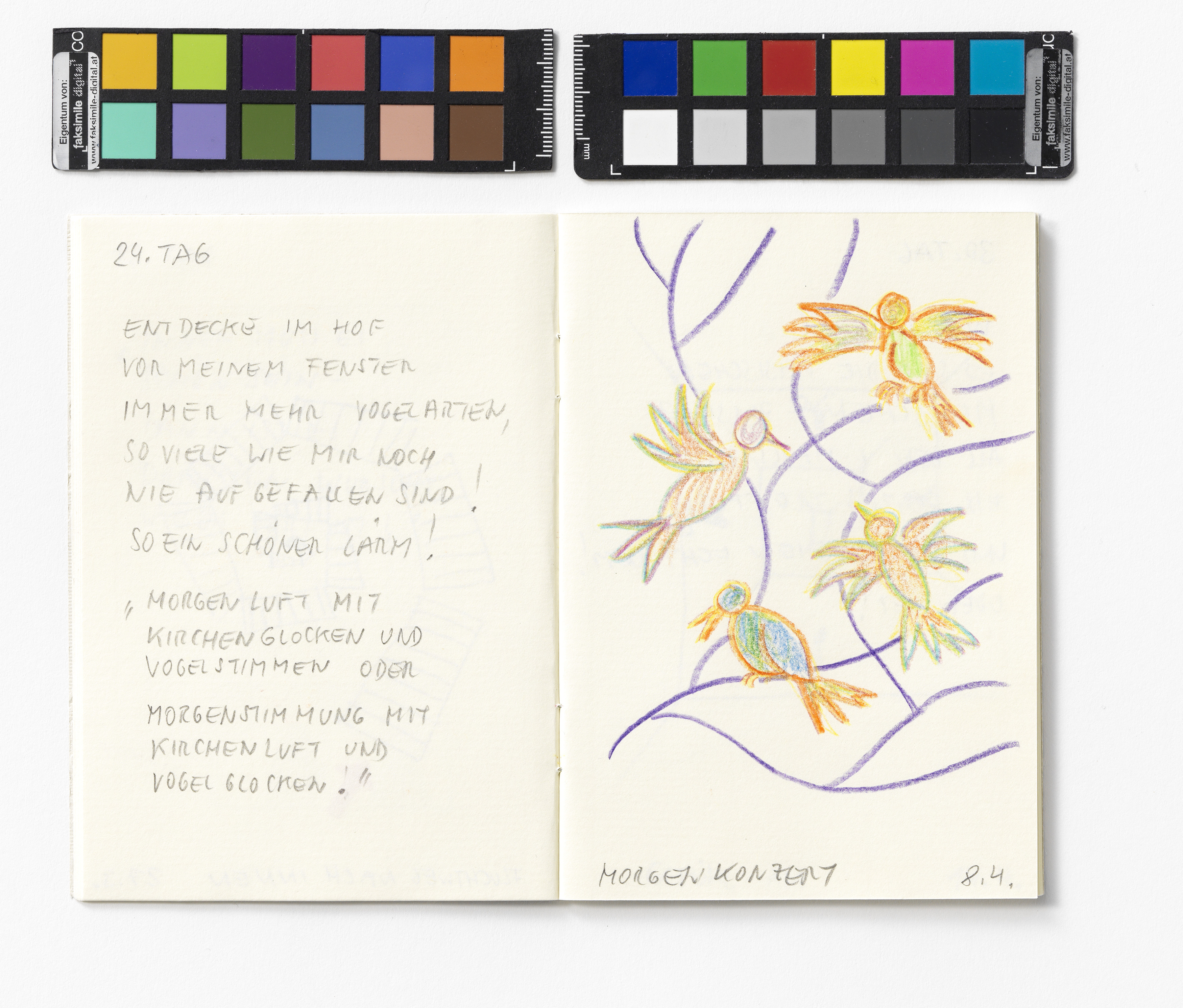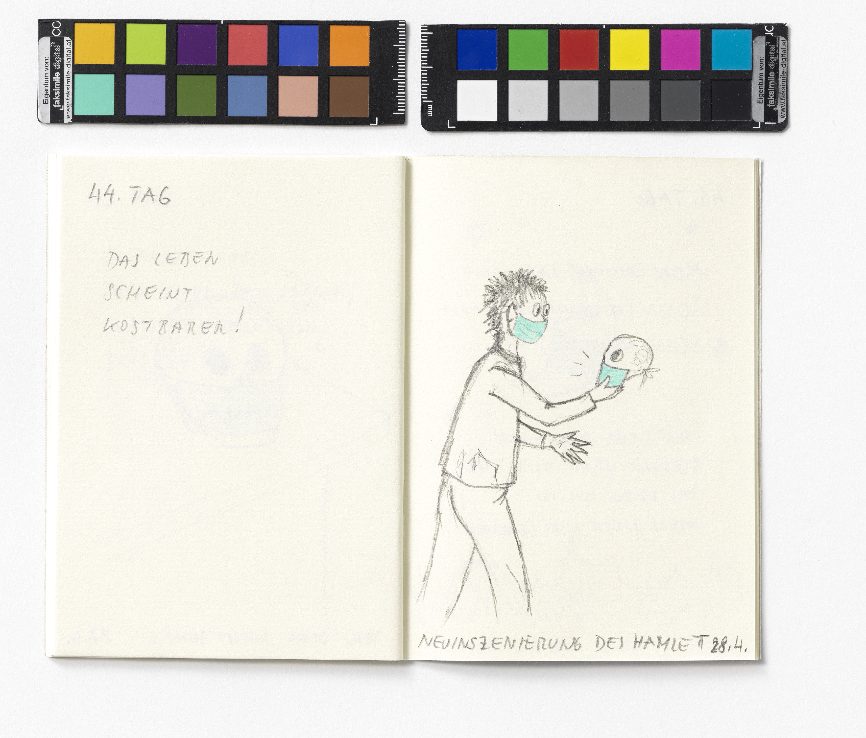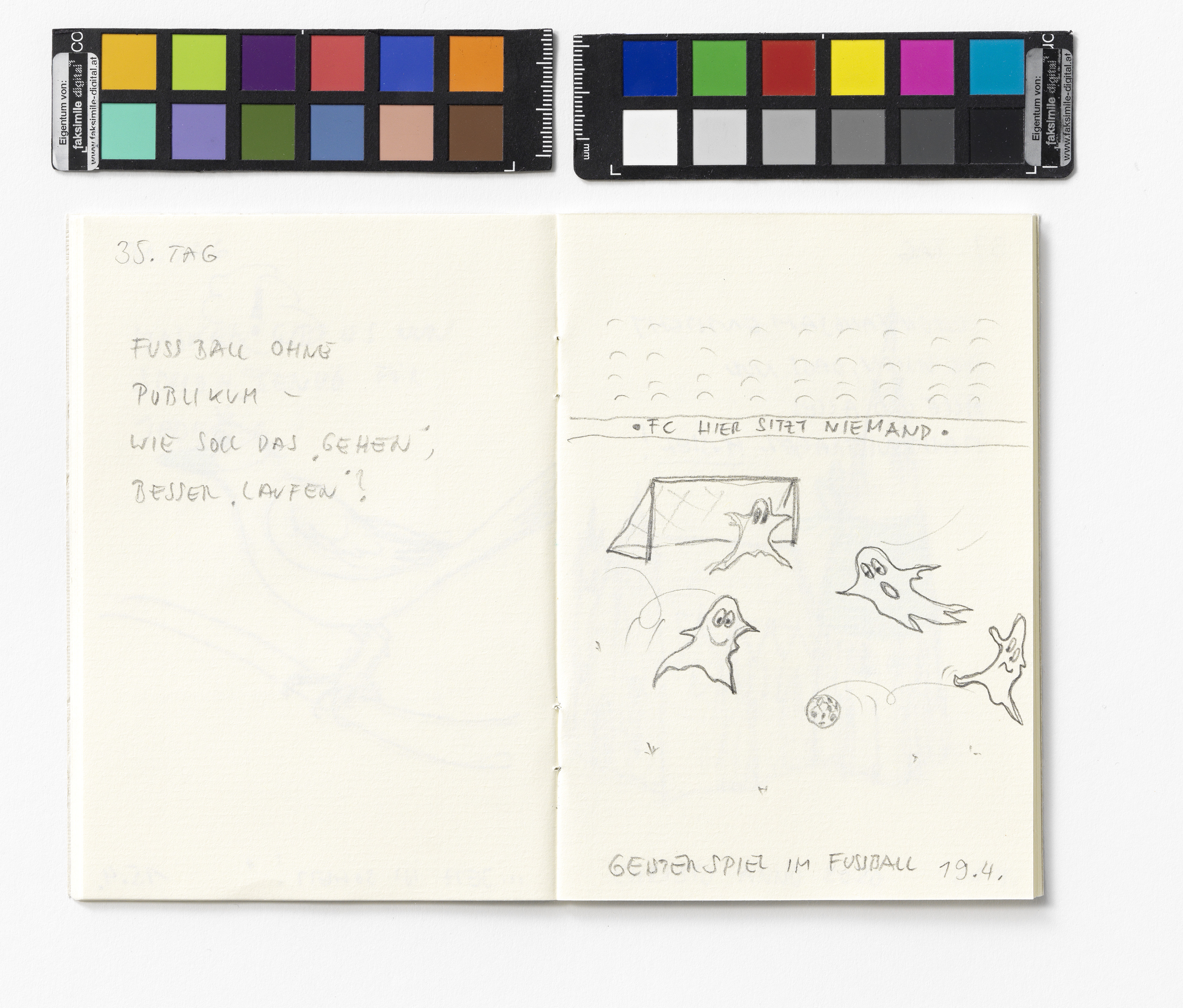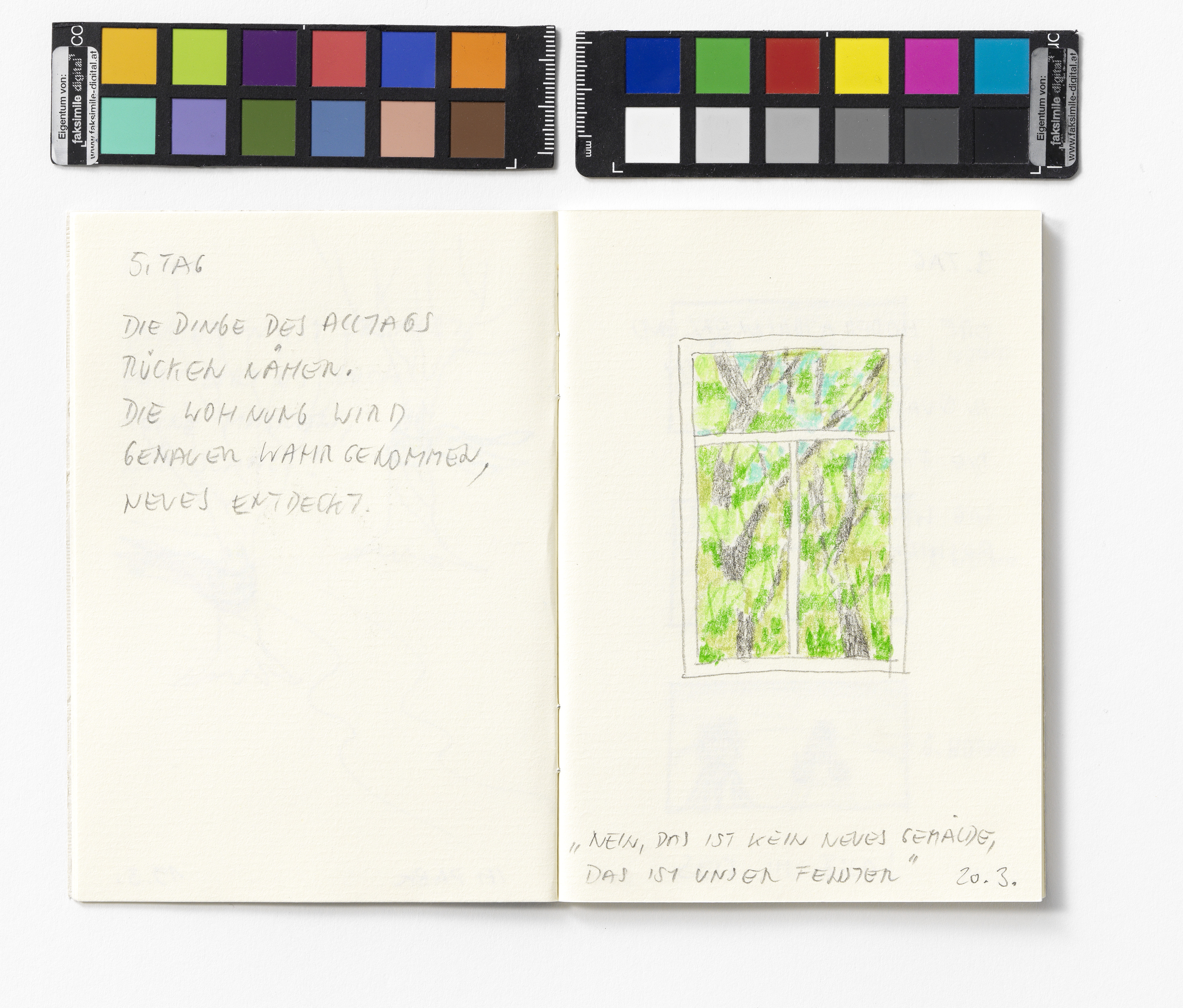 Heft mit 48 Seiten, das die Künstlerin (im Hauptberuf bis zu ihrer Pensionierung 2020 im Bundesministerium für Digitalisierung und Wirtschaftsstandort tätig) in den ersten 50 Tagen des Corona-Lockdowns als Tagebuch führte. Insgesamt fertigte sie 24 Zeichnungen und Kommentare auf je einer Doppelseite an. “Das Papier ist leider etwas dünn, ich konnte jedoch in der Krise kein besseres kaufen, weil ja alles zu war”, schrieb Stefanie Grüssl in einem E-Mail an das Wien Museum am 4. Juni 2020.