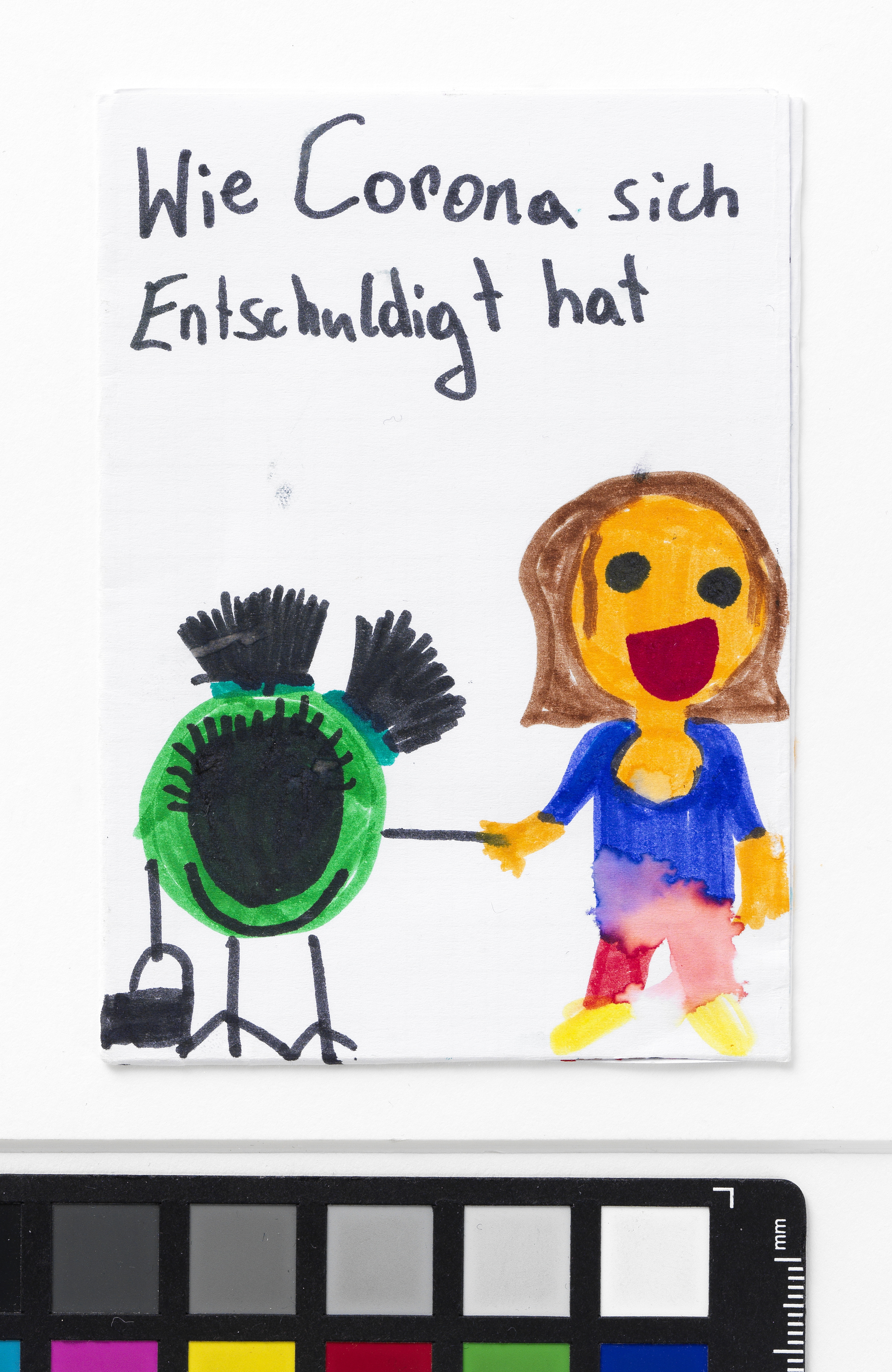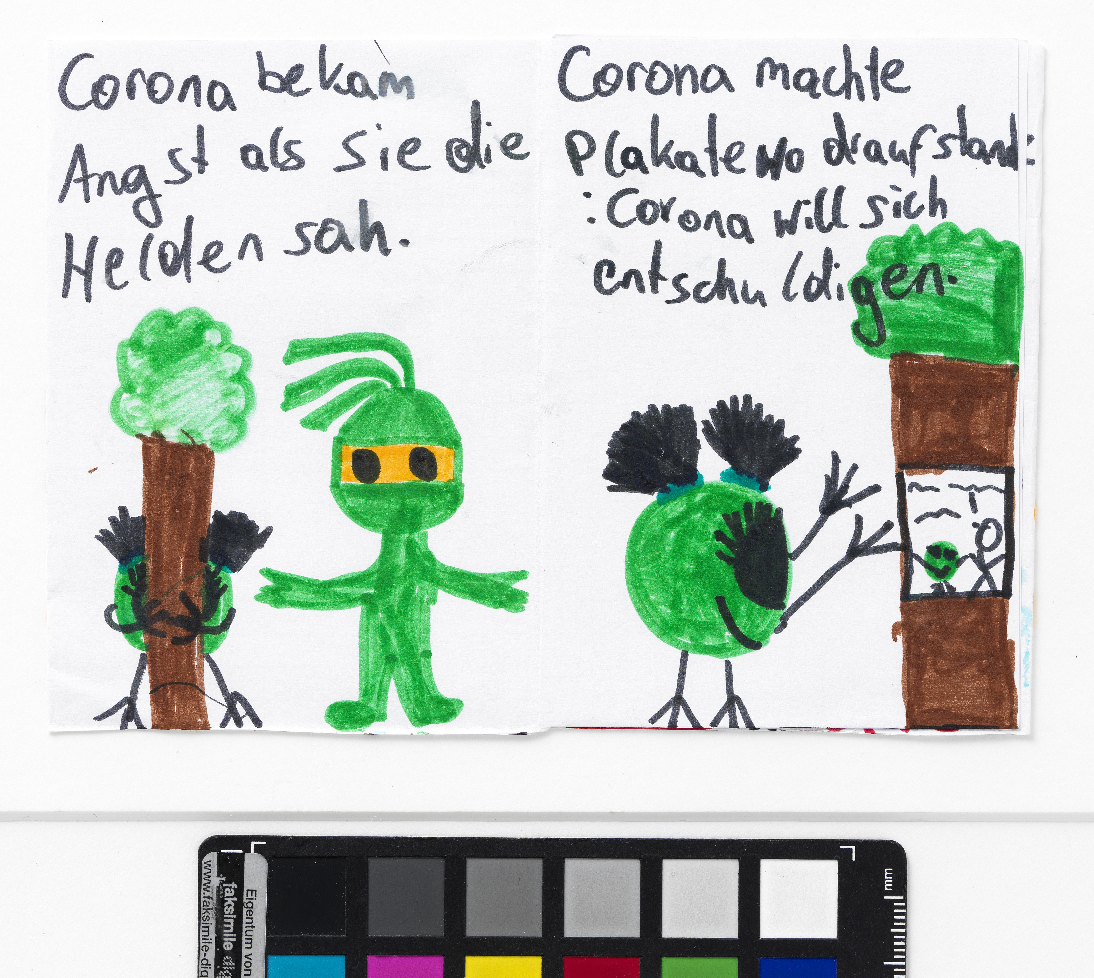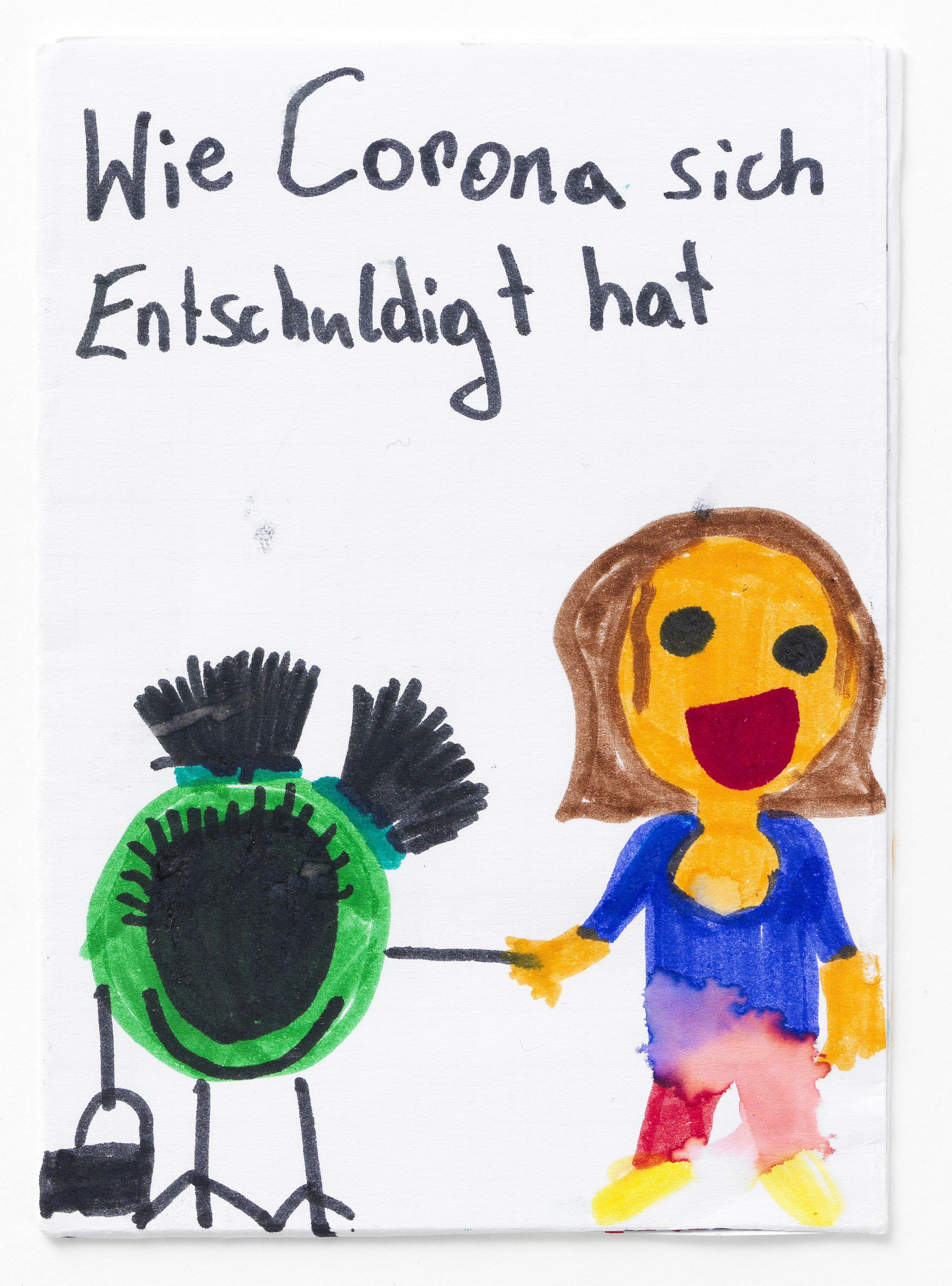 „Wie Corona sich entschuldigt hat“ ist eines von vier Bildheften über die Zeit des ersten Corona-Lockdowns im Frühjahr 2020, die die neunjährige Katerina Stavrou anfertigte, um die Corona-Krise bildlich zu dokumentieren. Sie wurde dazu von einer Home Schooling-Aufgabe, die ihre Schwester Sofia erhalten hatte (vgl. I.N. 310.248/1-3), inspiriert. Katerina Stavrou setzt sich in dieser mehrteiligen Geschichte mit ihrem veränderten Alltag während des ersten Lockdowns auseinander und gibt dabei auch dem Virus selbst ein Gesicht. „Die Bildgeschichte von Katerina hat selbstverständlich ein Happy End – was wir uns alle jetzt wünschen“, schrieb Oksana Stavrou, Katerinas Mutter, in einem E-Mail an das Wien Museum am 31. März 2020.