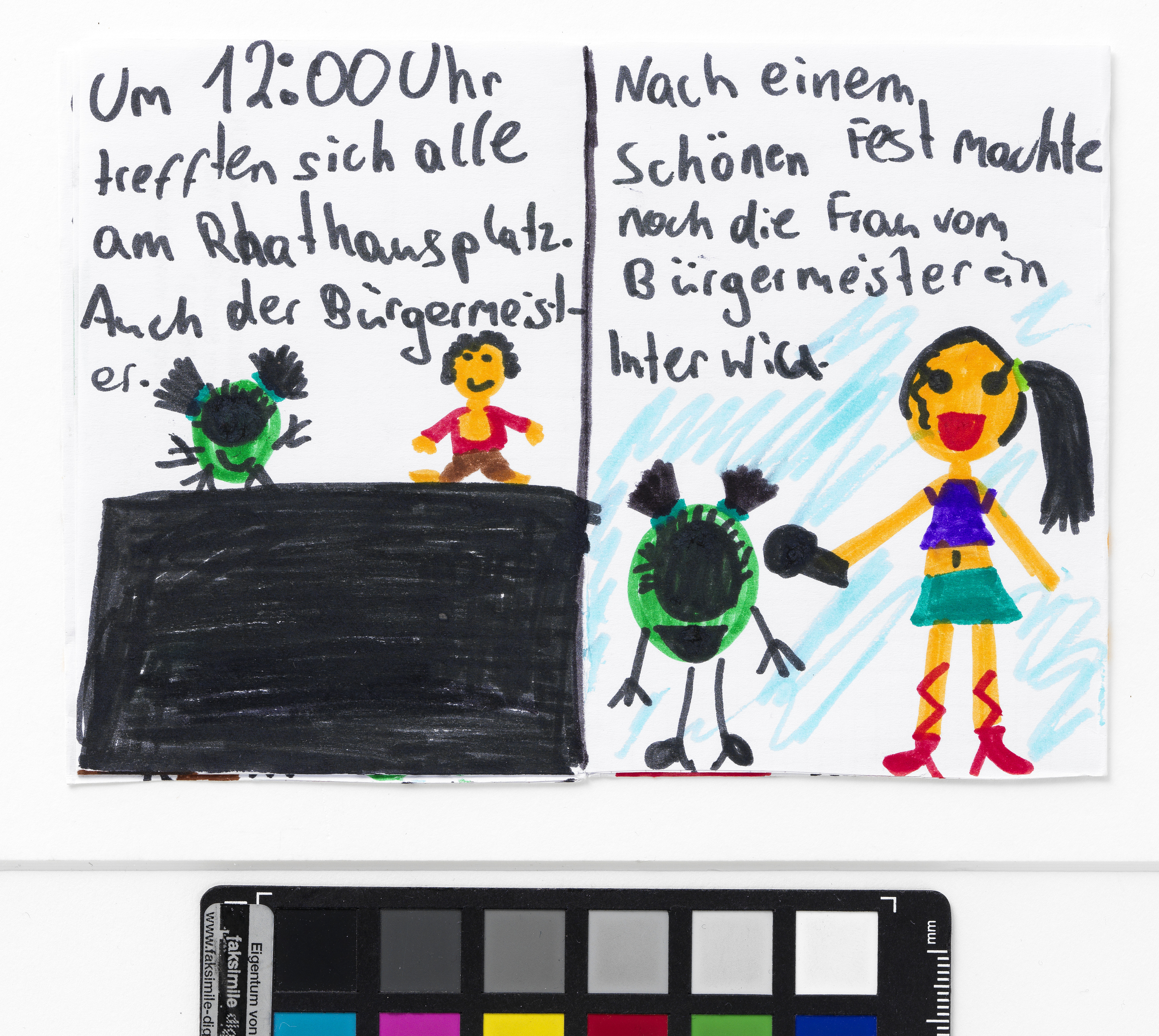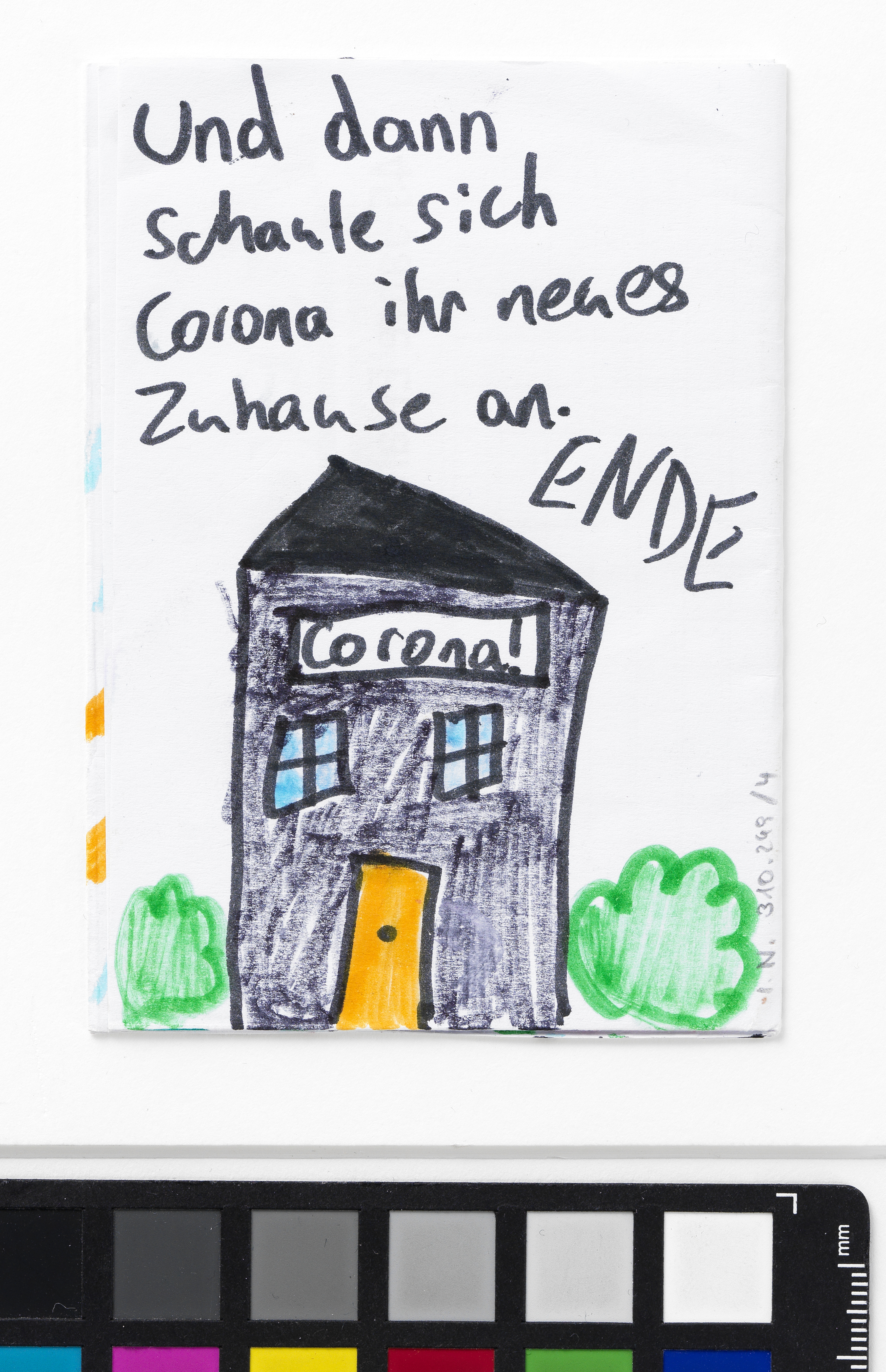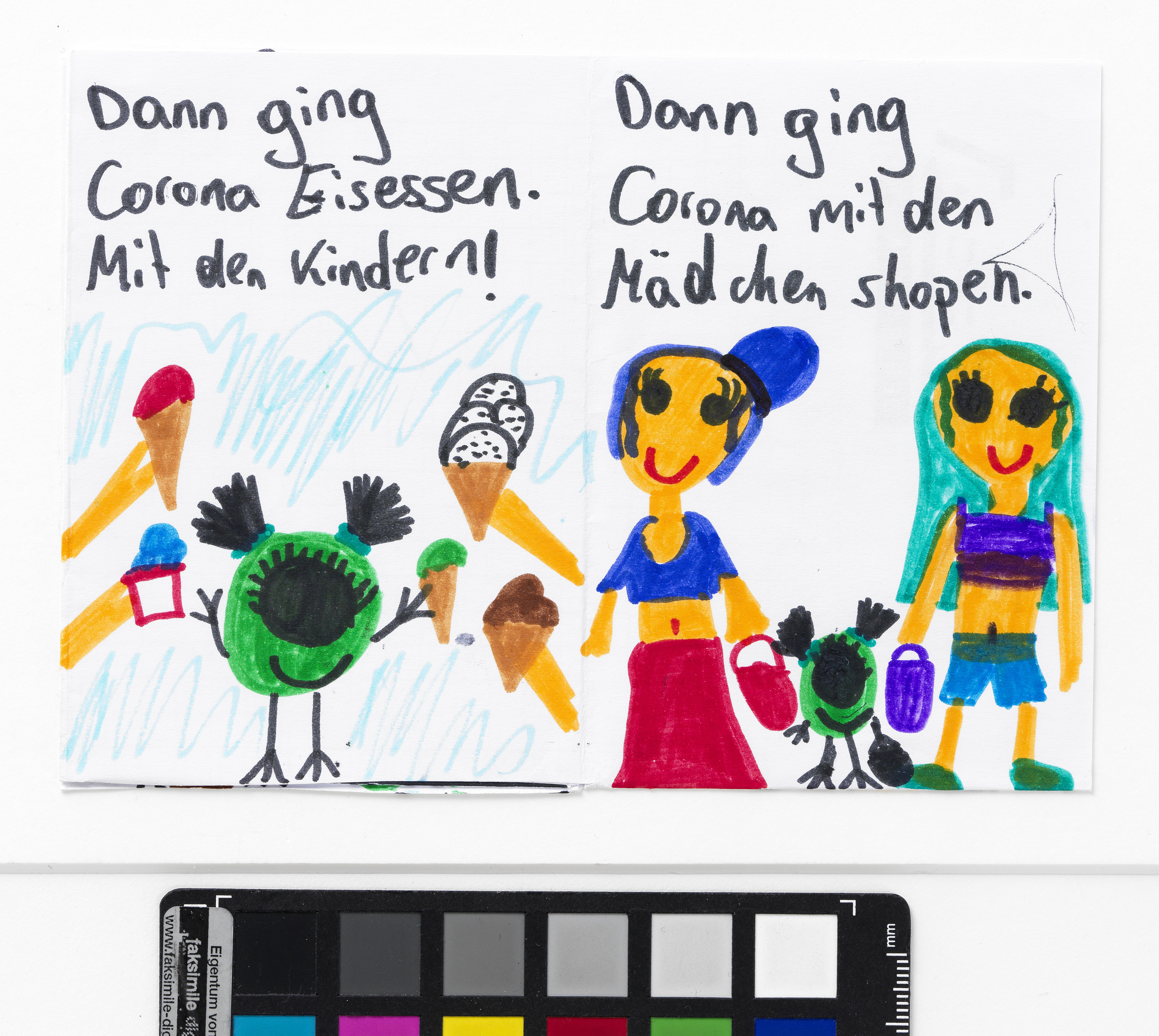 „Wie Corona sich entschuldigt hat“ ist eines von vier Bildheften über die Zeit des ersten Corona-Lockdowns im Frühjahr 2020, die die neunjährige Katerina Stavrou anfertigte, um die Corona-Krise bildlich zu dokumentieren. Sie wurde dazu von einer Home Schooling-Aufgabe, die ihre Schwester Sofia erhalten hatte (vgl. I.N. 310.248/1-3), inspiriert. Katerina Stavrou setzt sich in dieser mehrteiligen Geschichte mit ihrem veränderten Alltag während des ersten Lockdowns auseinander und gibt dabei auch dem Virus selbst ein Gesicht. „Die Bildgeschichte von Katerina hat selbstverständlich ein Happy End – was wir uns alle jetzt wünschen“, schrieb Oksana Stavrou, Katerinas Mutter, in einem E-Mail an das Wien Museum am 31. März 2020.