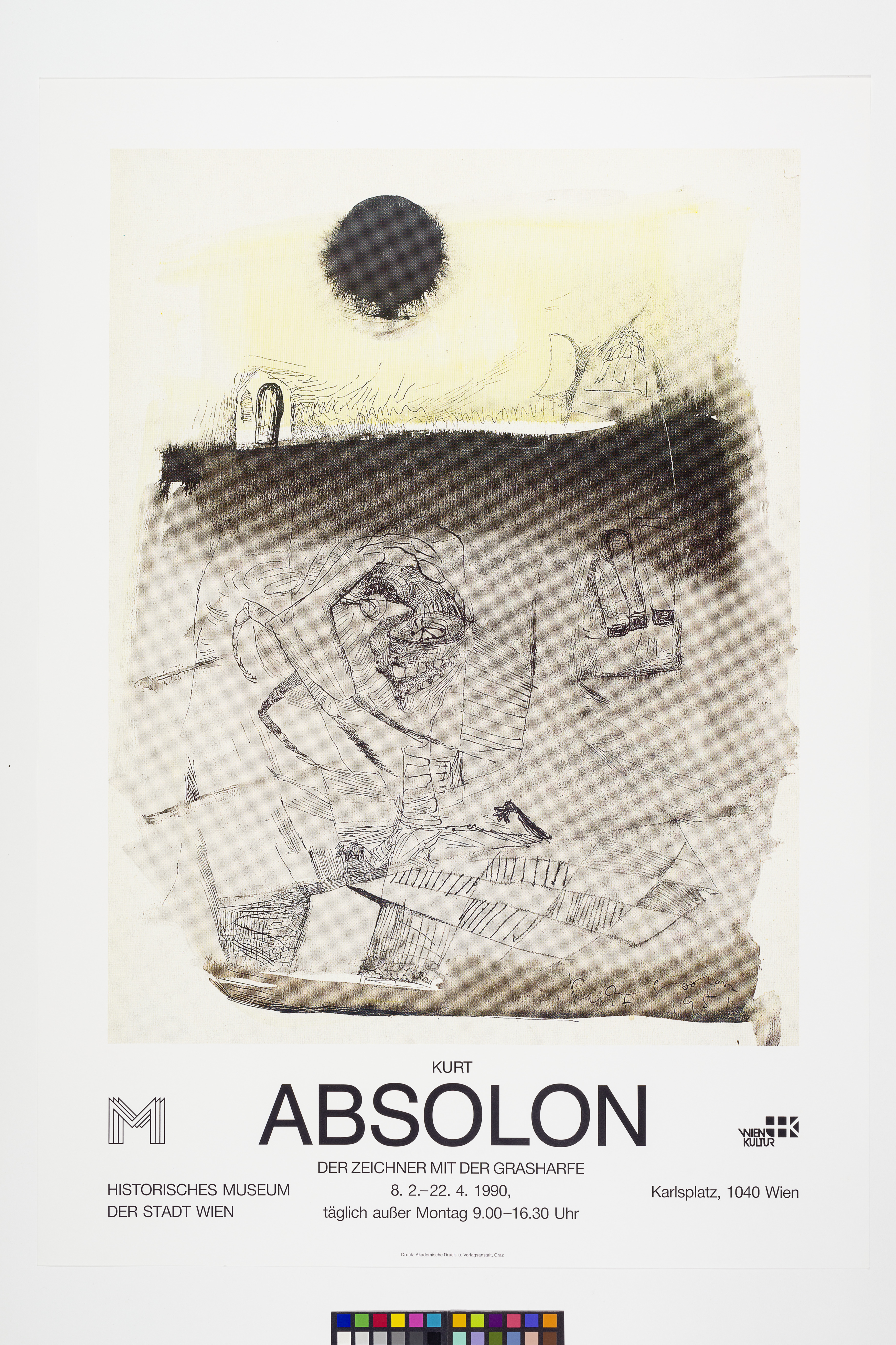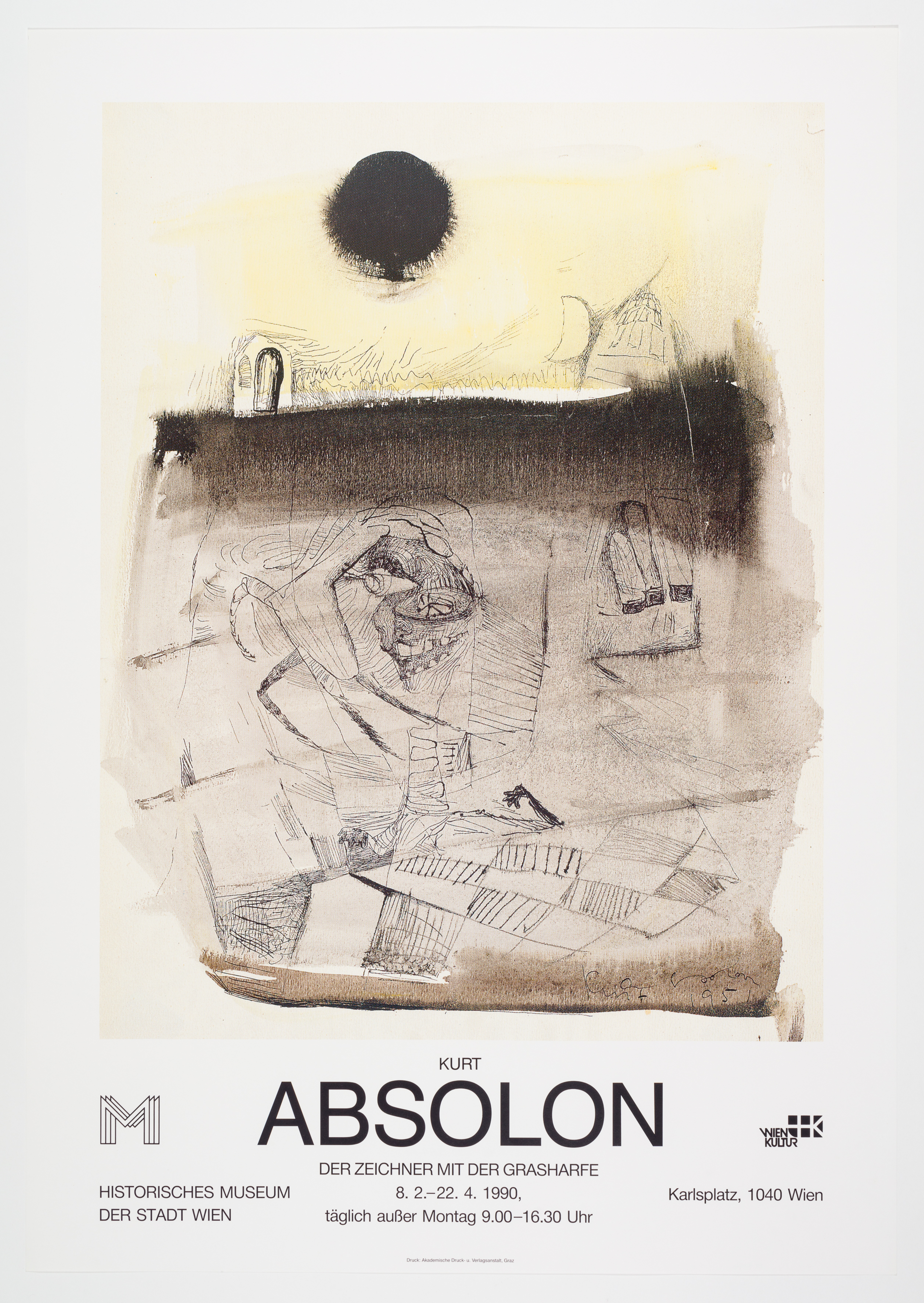 128. Sonderausstellung des Historischen Museums der Stadt Wien: "Kurt Absolon. Der Zeichner mit der Grasharfe", Plakat