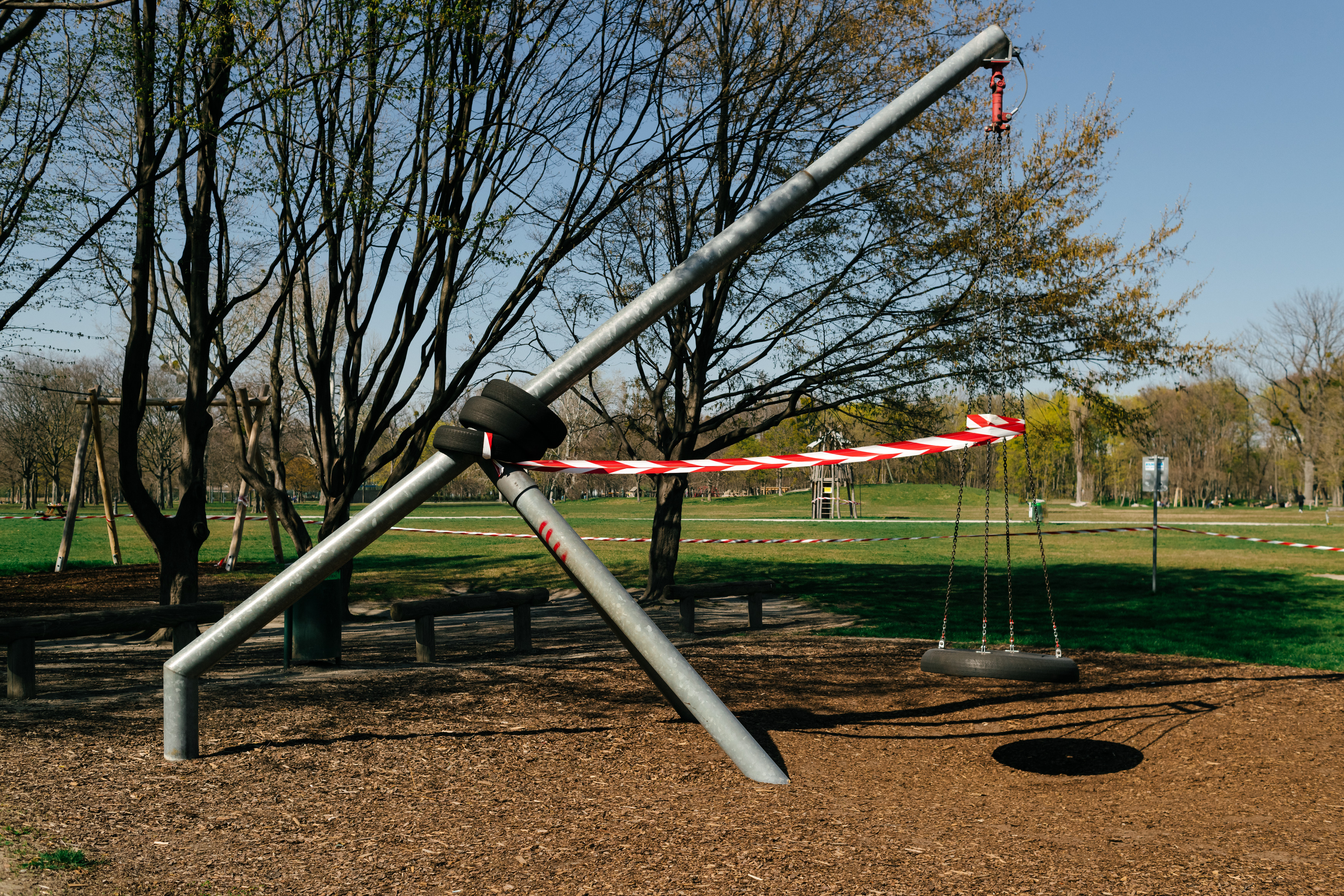 "Wien im Zeichen des Corona-Virus": Lockdown-bedingt abgesperrte Schaukel am Spielplatz auf der Jesuitenwiese im Prater