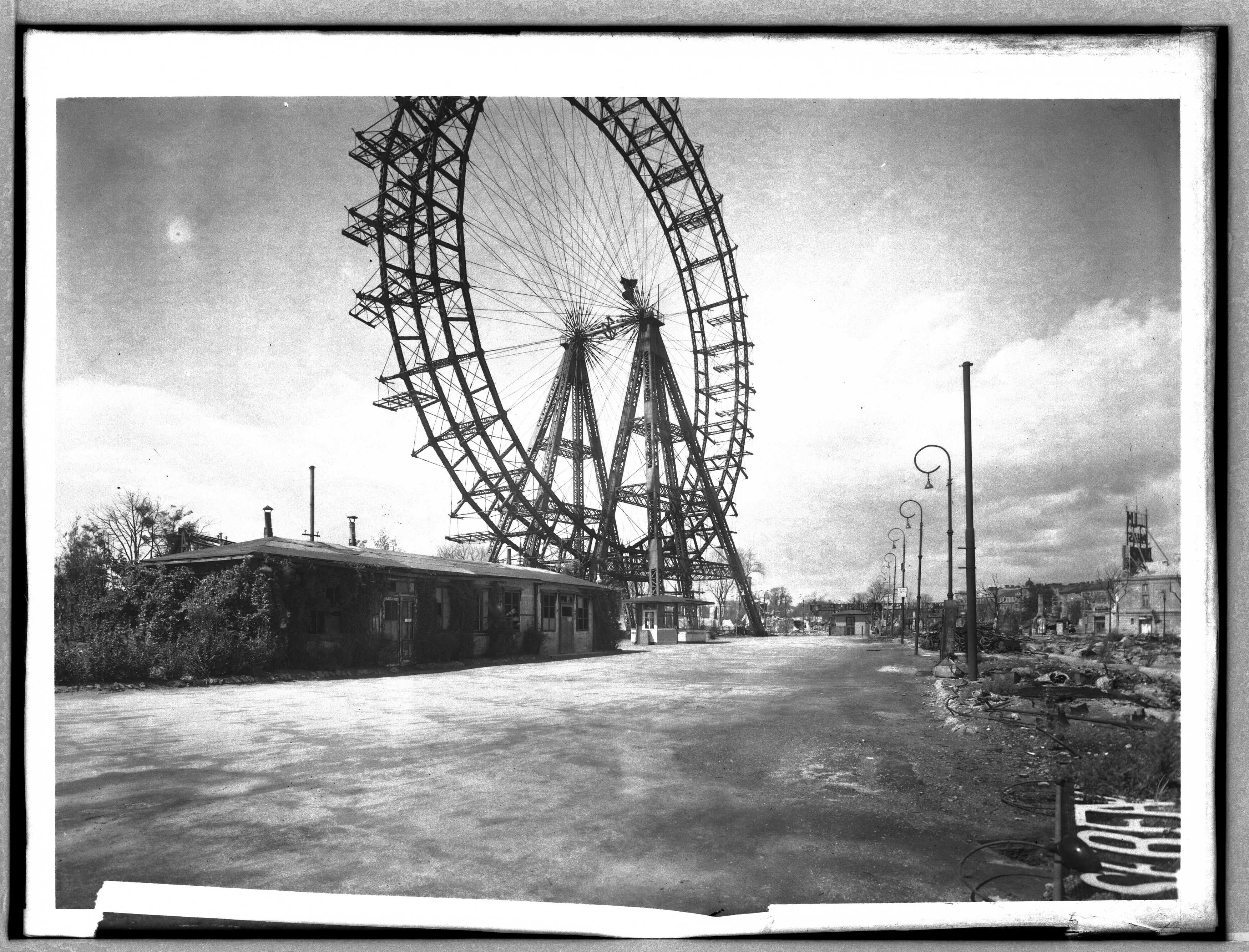 Kriegsschäden: Prater, Riesenrad und Filmpalast (rechts)