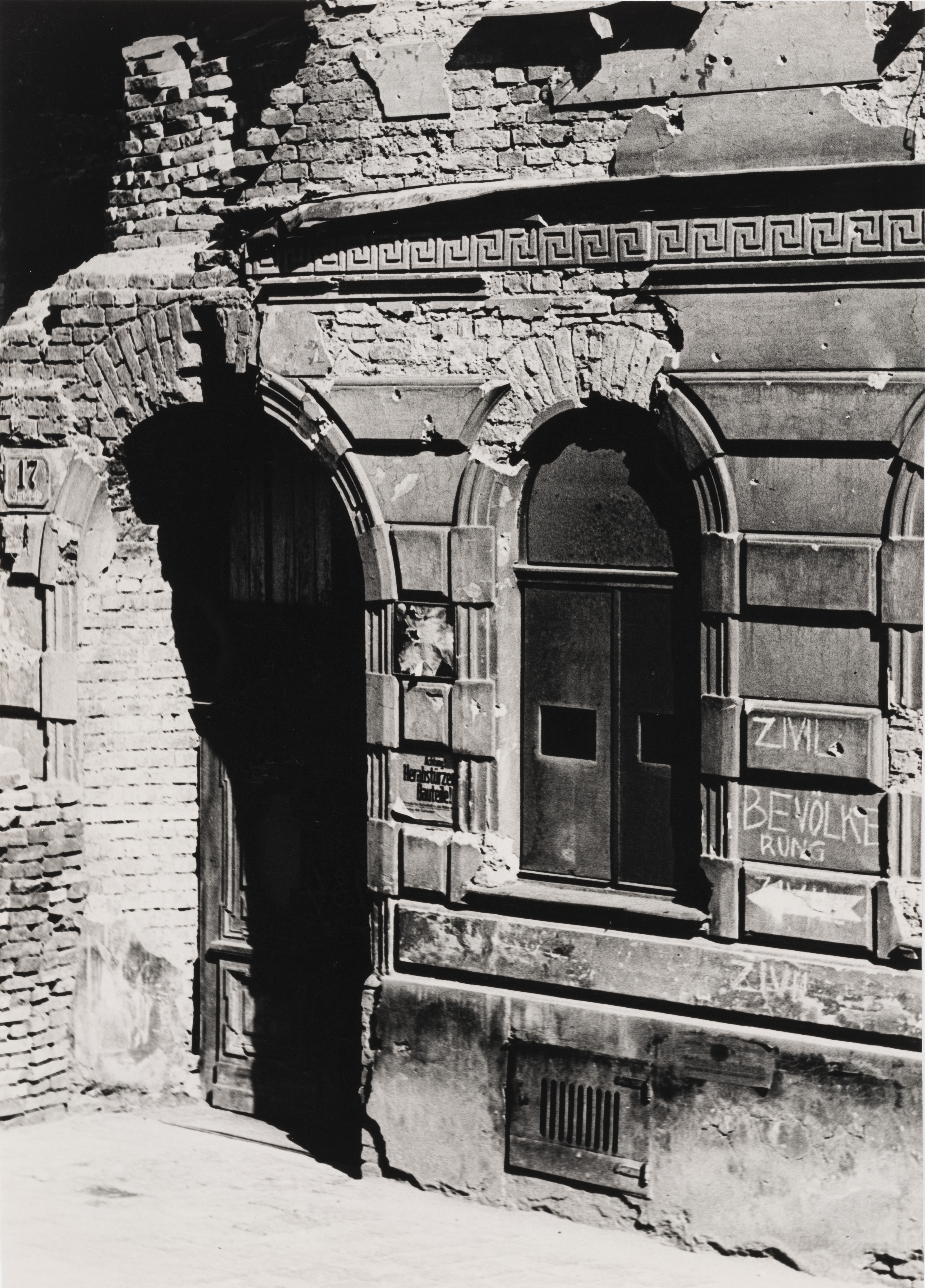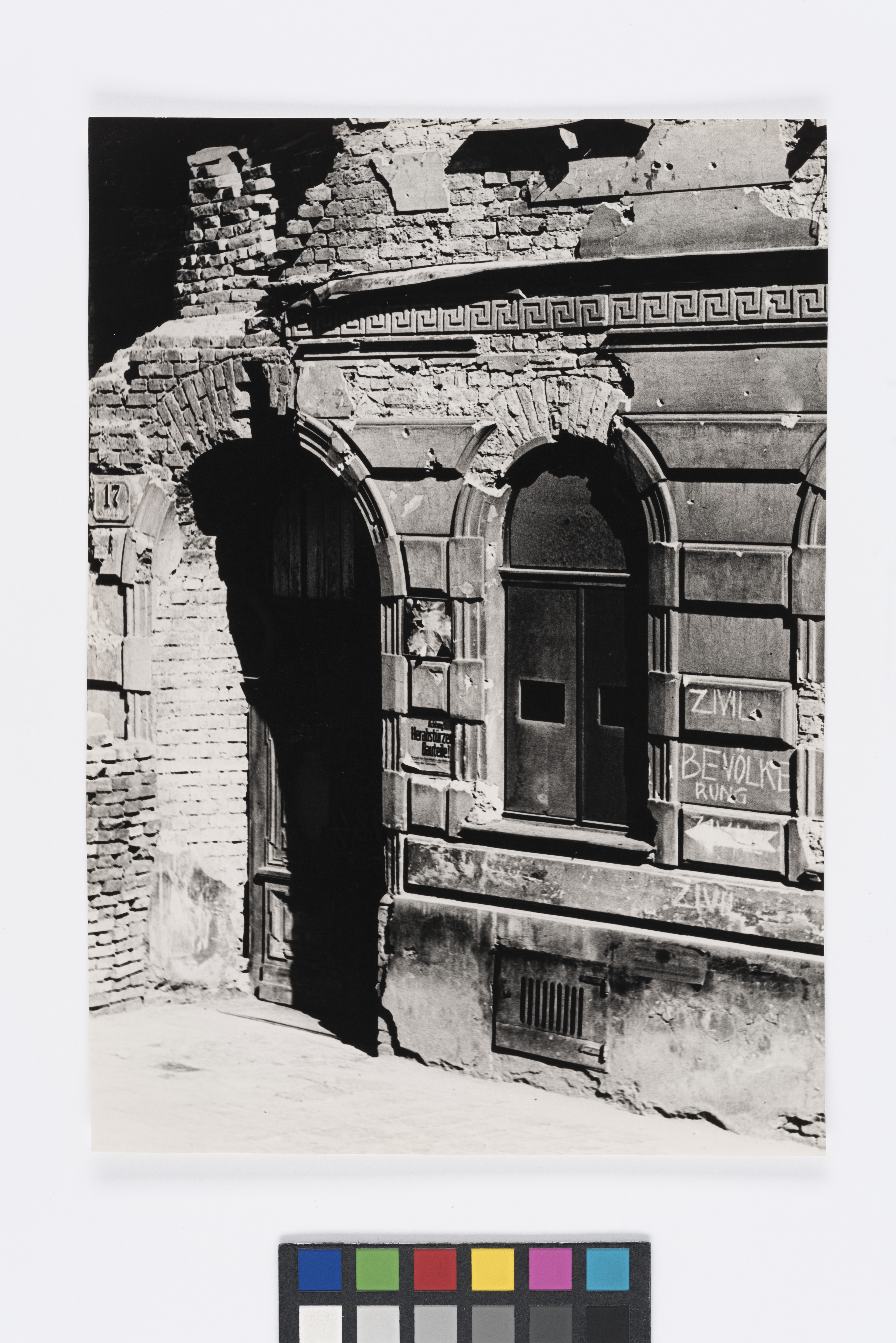 Kreideaufschrift "Zivilbevölkerung" auf Fassade eines kriegszerstörten Hauses in der Gerlgasse