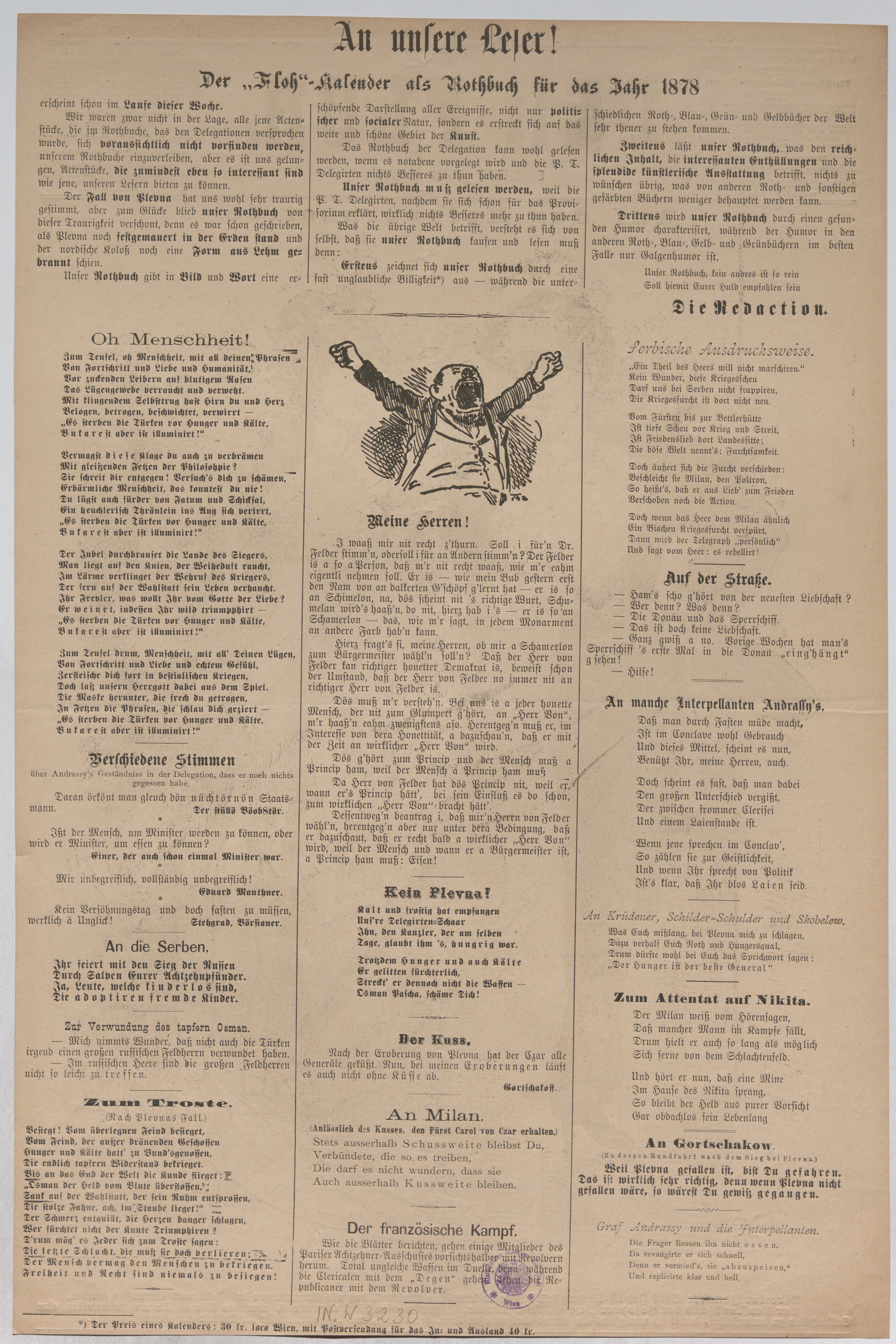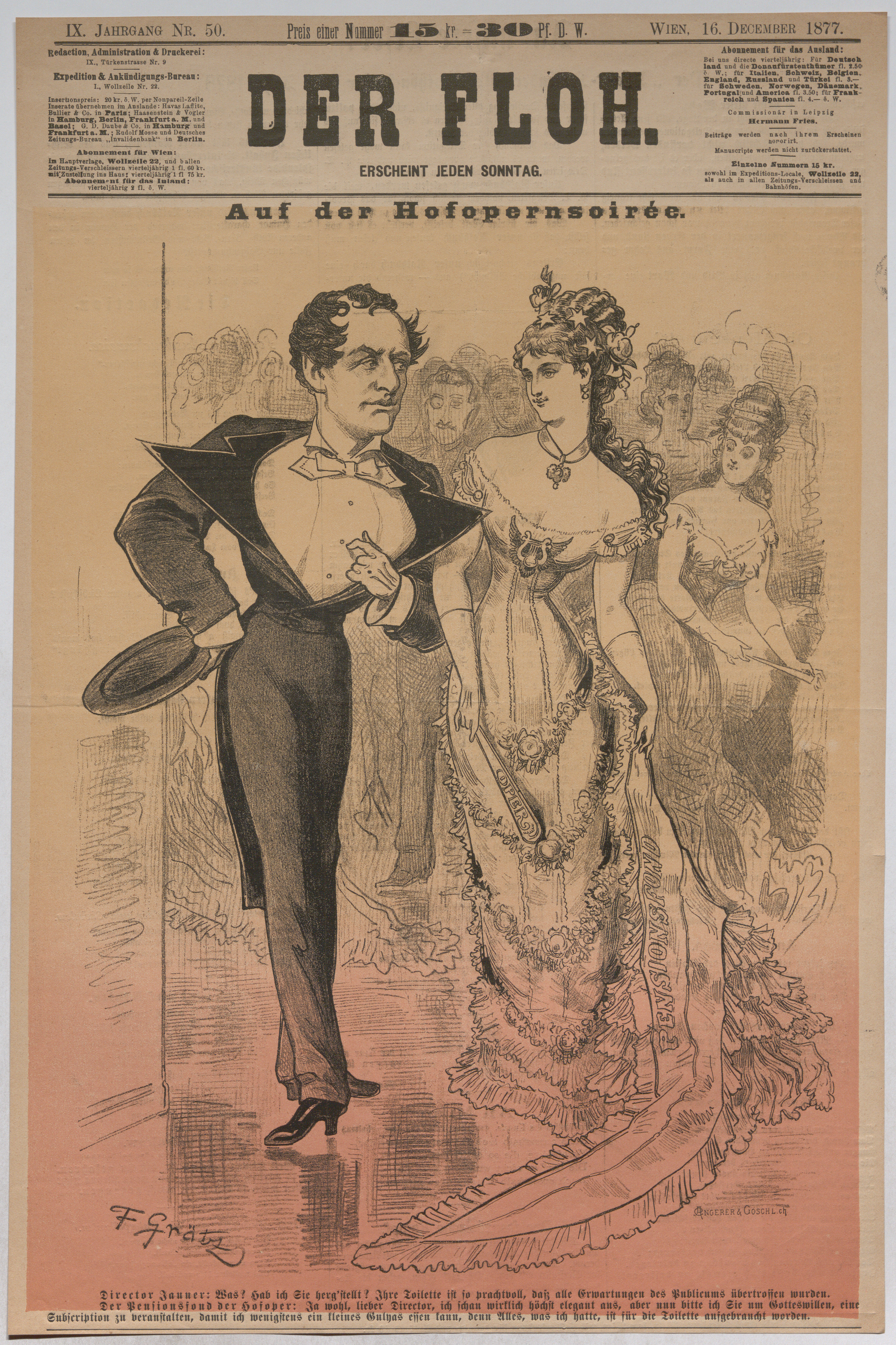 - Auf der Hofopernsoirée; Direktor Franz Jauner unterhält sich mit dem "Pensionsfond der Hofoper" (Titelblatt von "Der Floh")