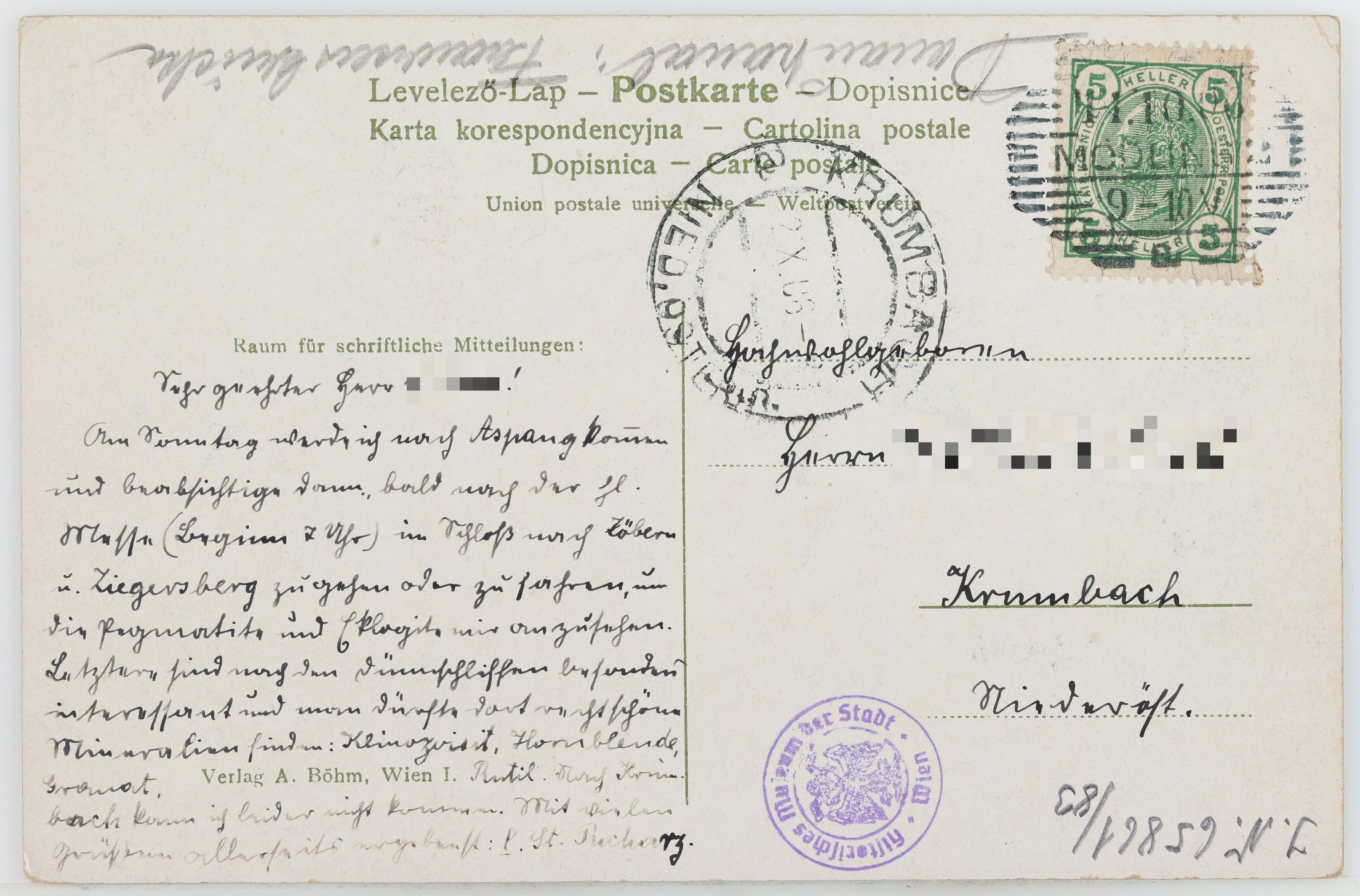 Am Sonntag werde ich nach Aspang kommen und beabsichtige dann bald nach der hl. Messe (Beginn 7 Uhr) im Schloß nach Zöbern und Ziegersberg zu gehen oder zu fahren, um die Pegmatite und Eklogite mir anzusehen. Letztere sind nach den Dünnschliffen besonders interessant und man dürfte dort recht schöne Mineralien finden: Klinozoisit, Hornblende, Granat, Rutil. Nach Krumbach kann ich leider nicht kommen. Mit vielen Grüßen allerseits ergebenst: P. St. RicharzTranskription / Übersetzung durch Ehrenamtliche im Rahmen der Crowdsourcing Aktion 2021/2022 (nicht überprüft durch das Wien Museum)