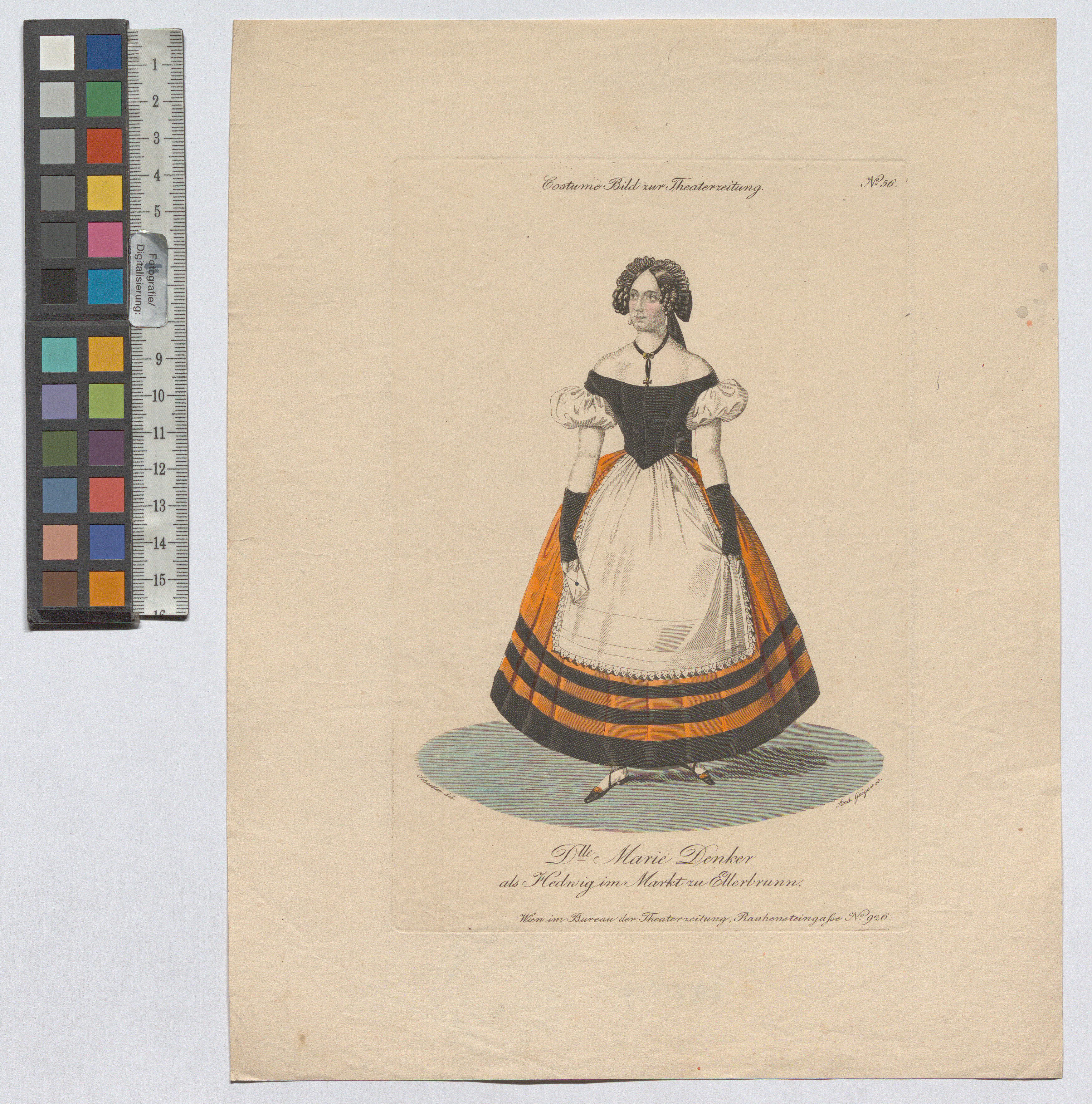 - Die Wiener Theaterzeitung erschien von 1806 bis 1860 unter verschiedenen Titeln („Wiener Theaterzeitung“, „Wiener allgemeine Theaterzeitung“, „Wiener allgemeine Theaterzeitung und Unterhaltungsblatt für Freunde der Kunst, Literatur und des geselligen Lebens“, etc.). Allgemein bekannt war sie als „Bäuerles Theaterzeitung“, benannt nach ihrem Gründer und Redakteur Adolf Bäuerle (1786-1859). Thematisch war die Zeitung nicht auf das Theater beschränkt, auch Mode, Musik und Literatur wurden behandelt. Das Theater bildete jedoch den inhaltlichen Schwerpunkt der Publikation und ab 1818 lagen dem Blatt Bildbeilagen mit Schauspielerinnen- und Schauspielerporträts, ab 1826 Szenenbilder als kolorierte Kupferstiche bei. Die verschiedenen Bildfolgen erschienen unter den Titeln „Gallerie drolliger und interessanter Scenen“, „Theatralische Bilder-Gallerie“, „Costume Bild zur Theaterzeitung“, „Modebilder zur Theaterzeitung“, „Satyrisches Bild“, „Rebus. Beilage zur Theaterzeitung“ und „Besondere Bilderbeylage zur Theaterzeitung“.