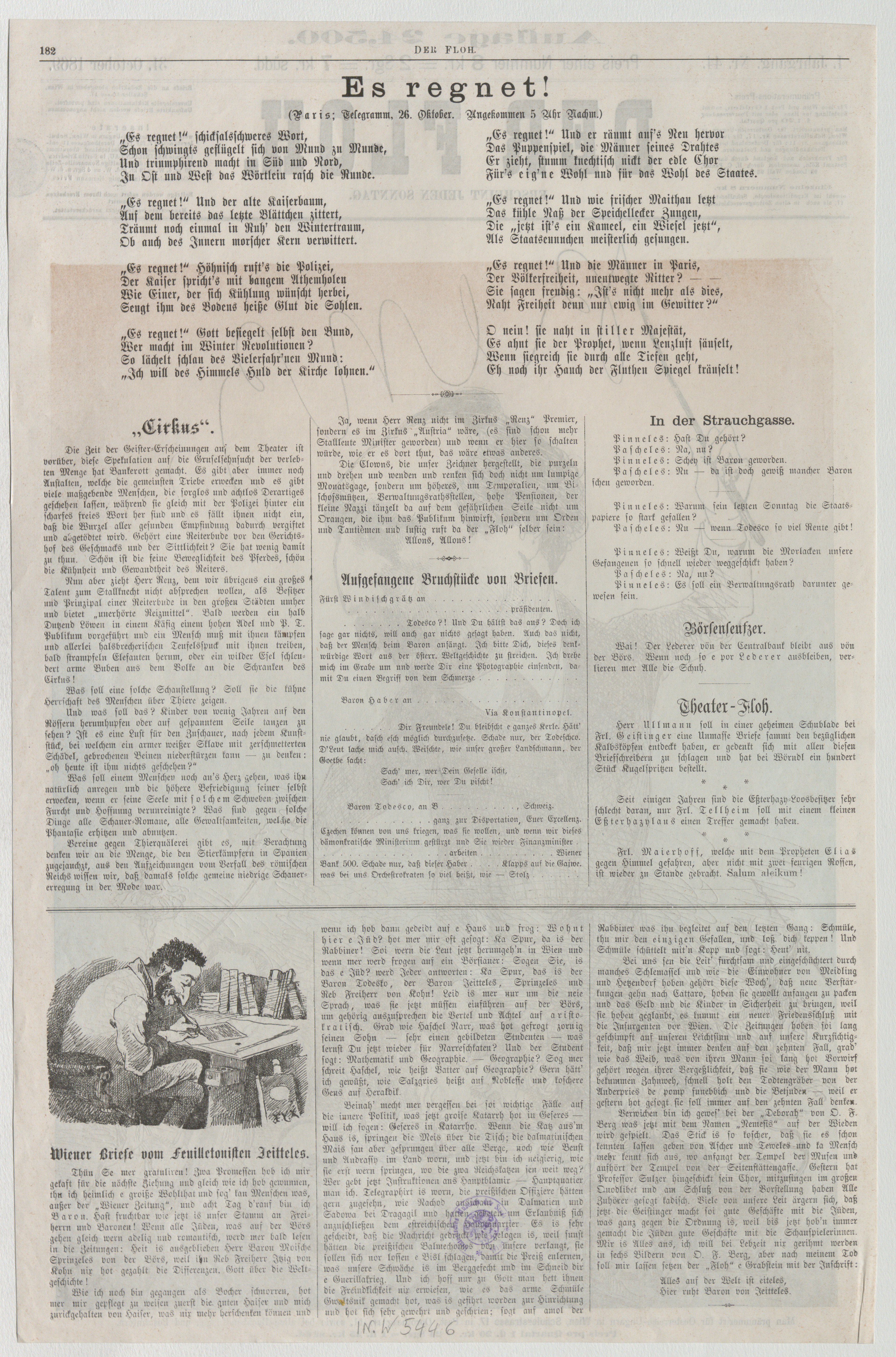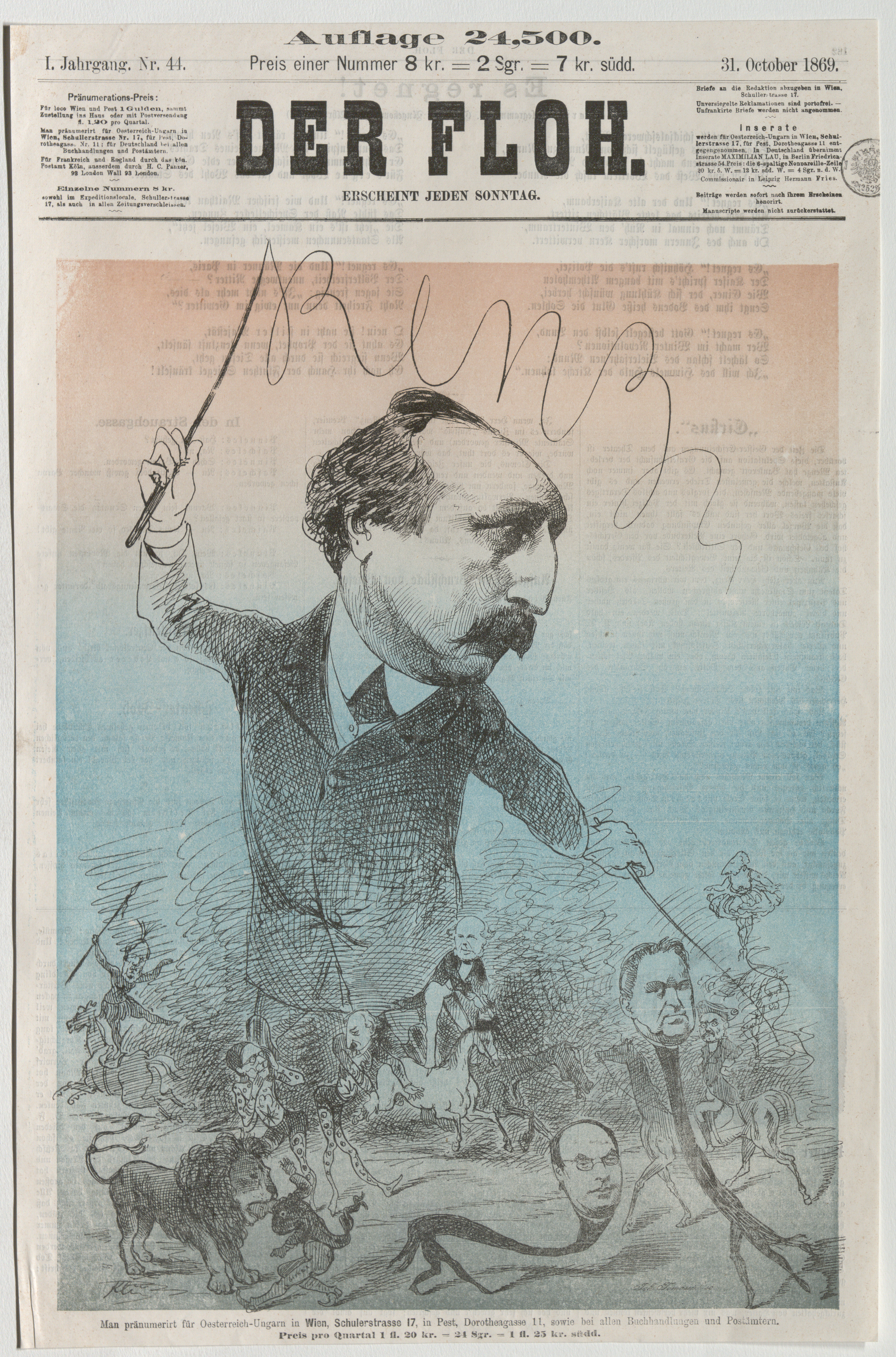 Zirkusdirektor Ernst Jakob Renz im Zirkus "Austria"; Beust, Giskra u. a. (Titelblatt von "Der Floh")