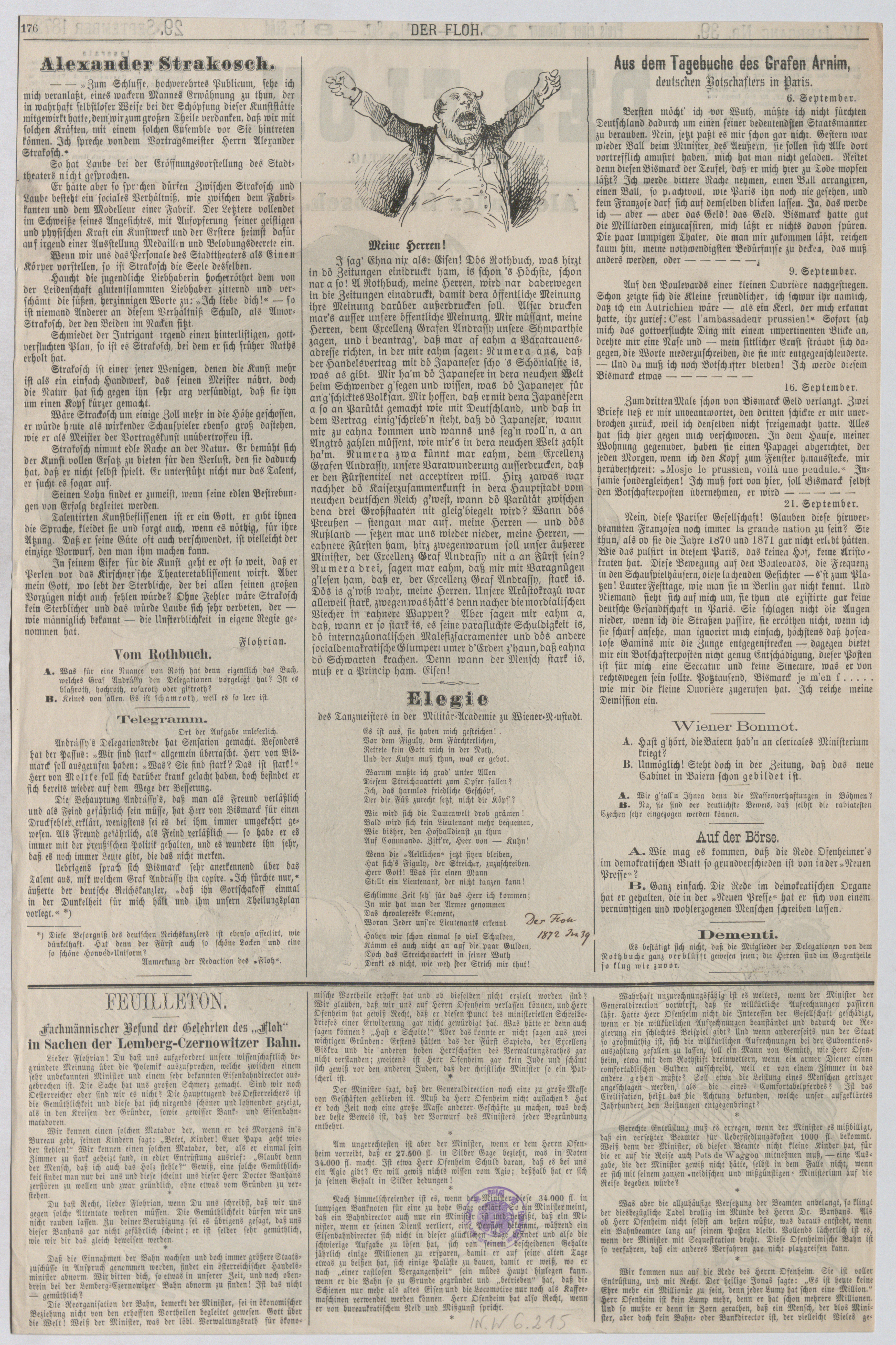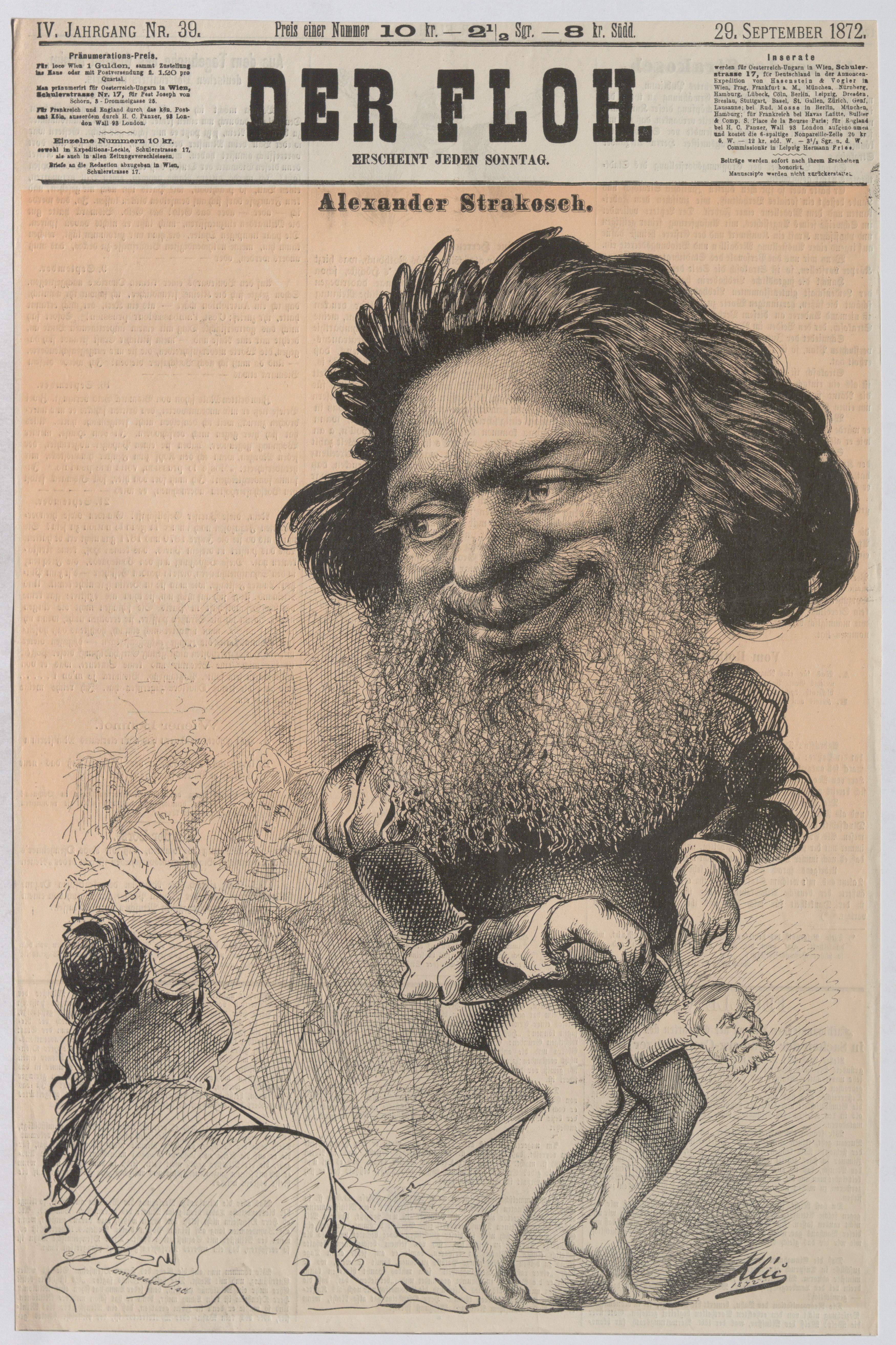 - Schauspieler und Rezitator Alexander Strakosch, Vortragsmeister des Stadttheaters, reitet auf einem Stock mit dem Kopf Heinrich Laubes (Titelblatt von "Der Floh")