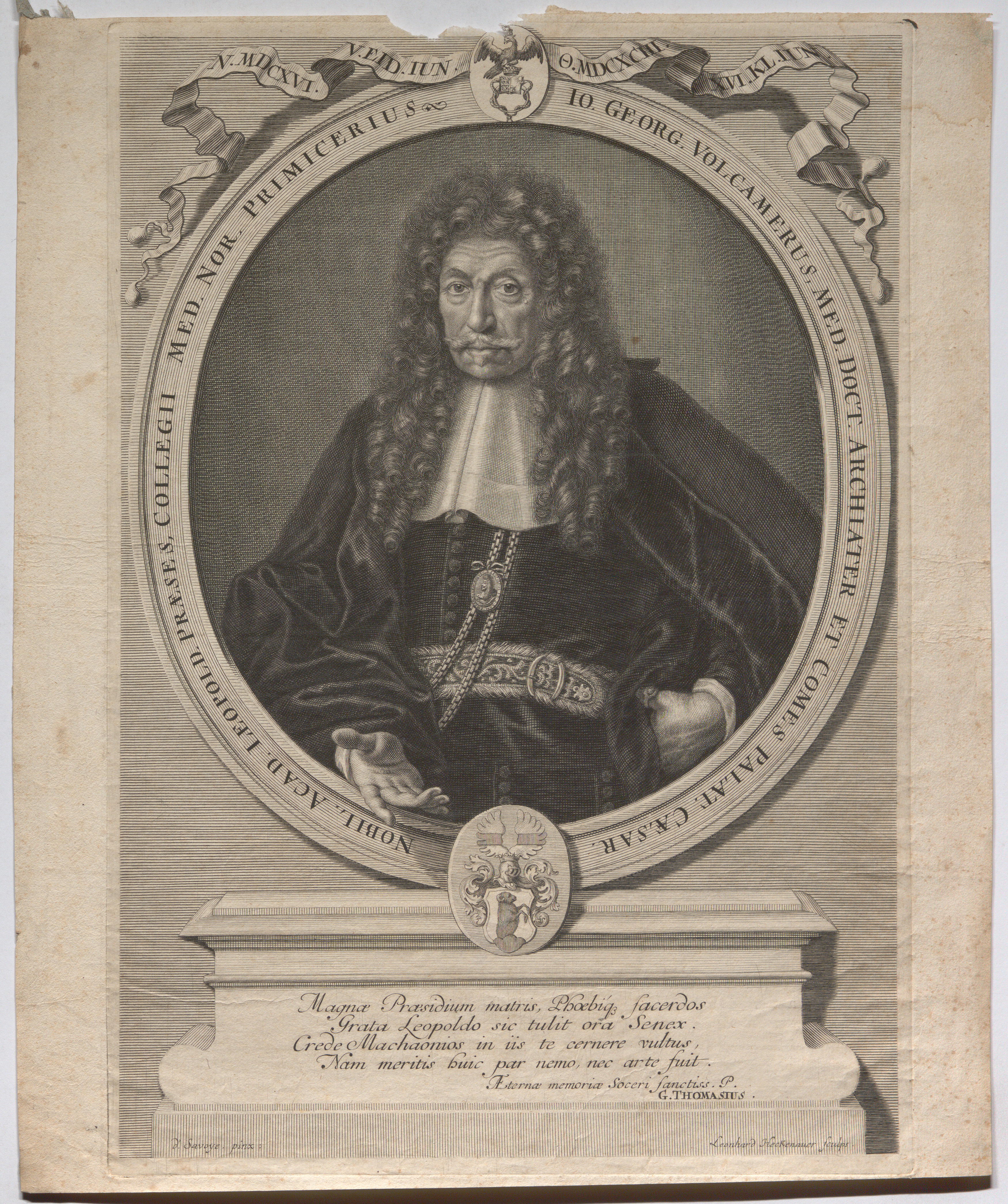 "NOBIL. ACAD. LEOPOLD. PRAESES, COLLEGII MED. NOR. PRIMICERIUS IO. GEORG. VOLCAMERUS, MED. DOCT: ARCHIATER ET COMES PALAT. CEASAR."