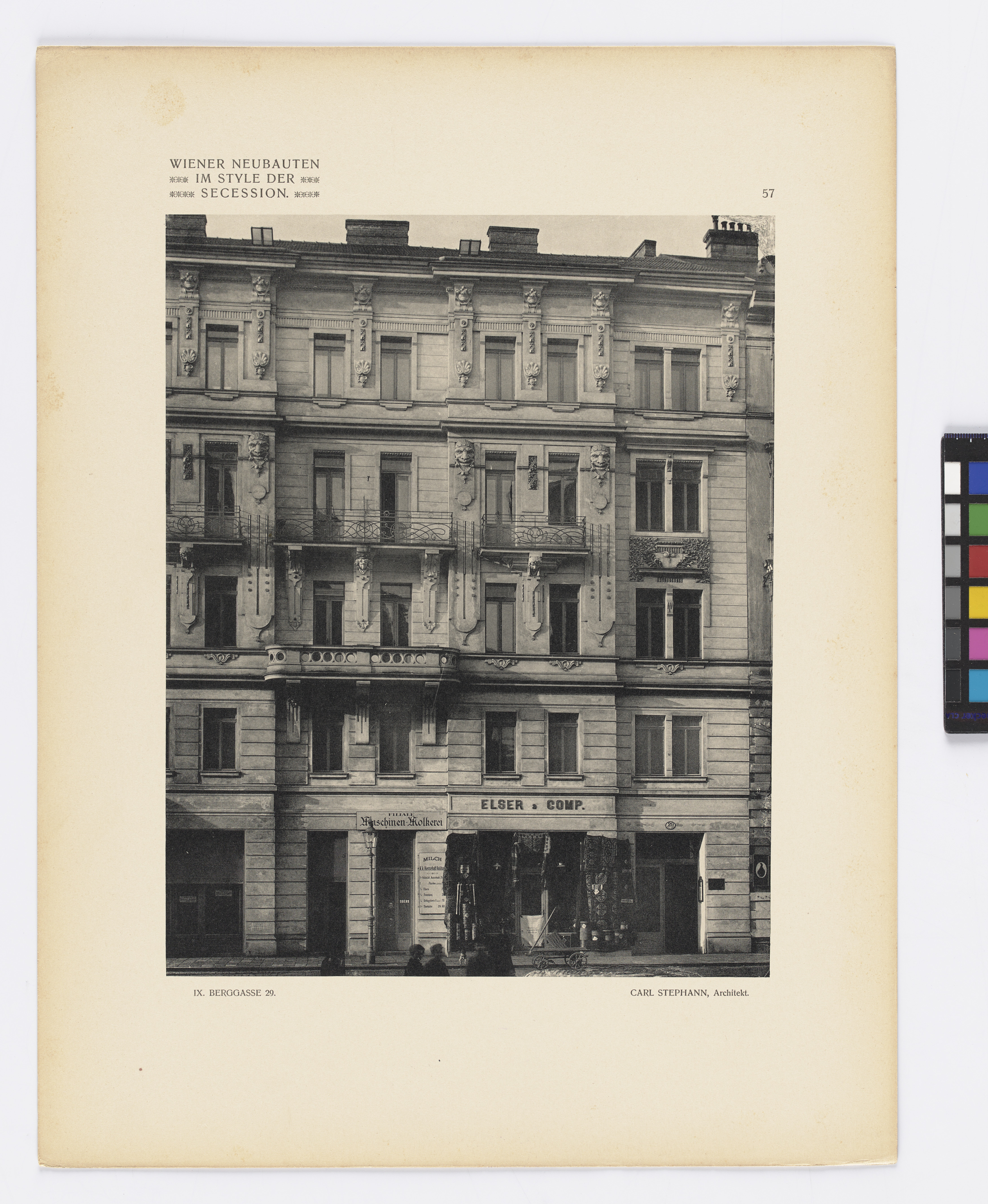 9., Berggasse 29 (Architekt Carl Stephann) (Blatt Nr. 57 aus: Wiener Neubauten im Style der Secession. Erste Serie. Facaden Details Hausthore Vestibule (2. Aufl.; Kunstverlag Anton Schroll, Wien 1907)