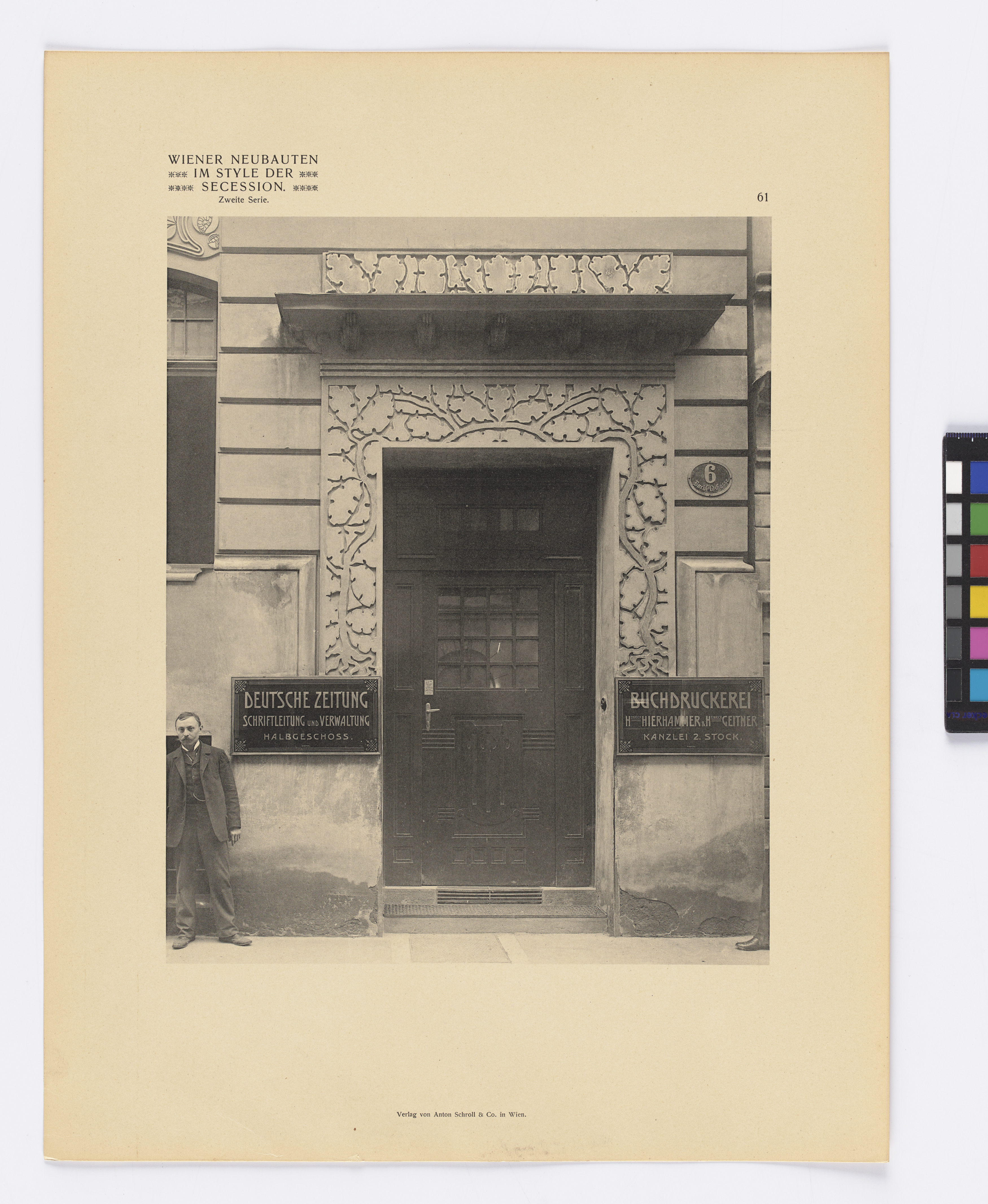 8., Buchfeldgasse 6, Architekt Joseph Urban (Blatt Nr. 61 aus: Wiener Neubauten im Style der Secession. Zweite Serie. Facaden Details Hausthore Vestibule (3. Aufl.; Kunstverlag Anton Schroll, Wien 1910)