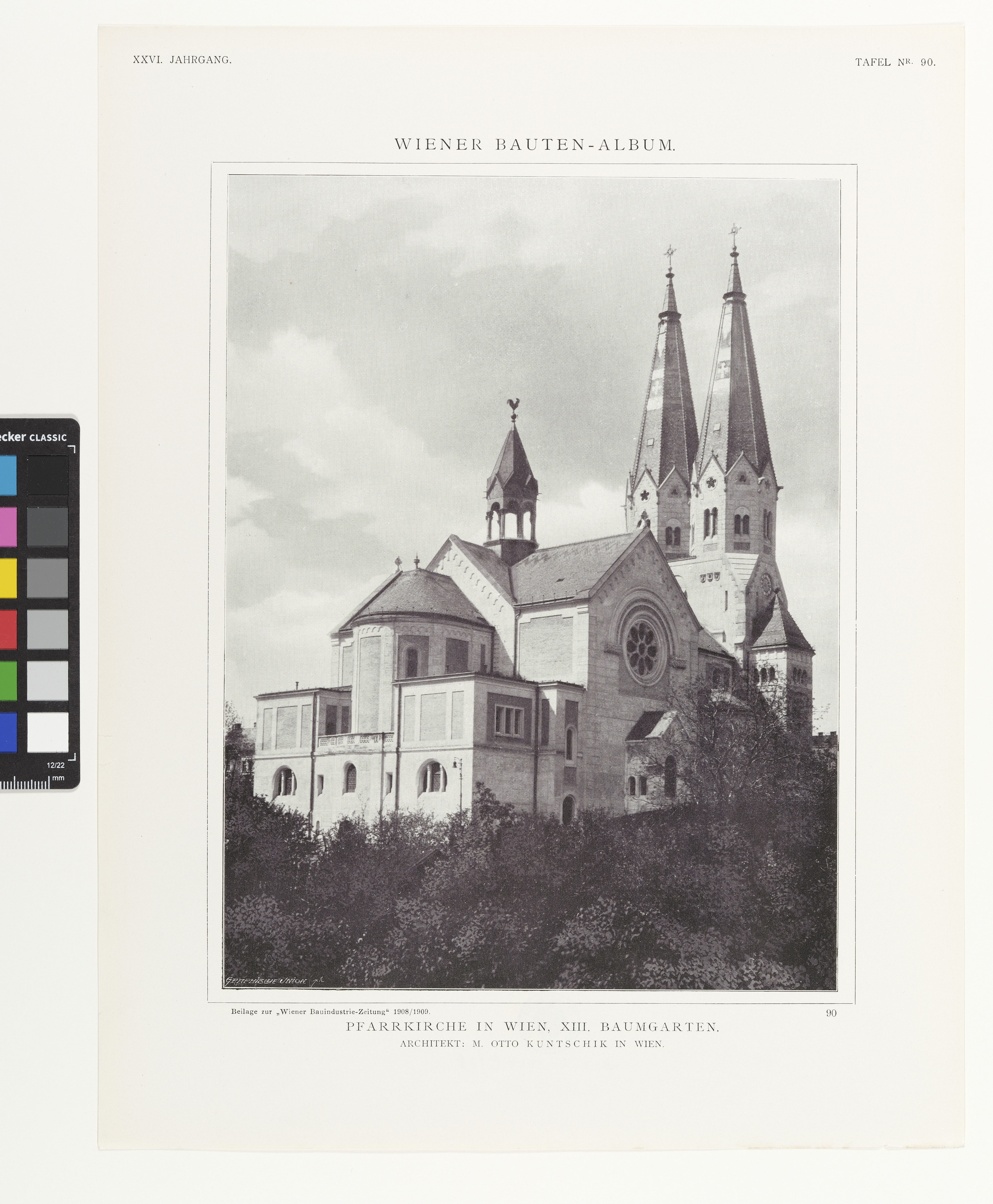 - XXVI. Jahrgang. Wiener Bauten-Album. Tafel Nr. 90. / Beilage zur „Wiener Bauindustrie-Zeitung“ 1908/1909. / Pfarrkirche in Wien, XIII. Baumgarten. / Architekt: M. Otto Kuntschik in Wien.