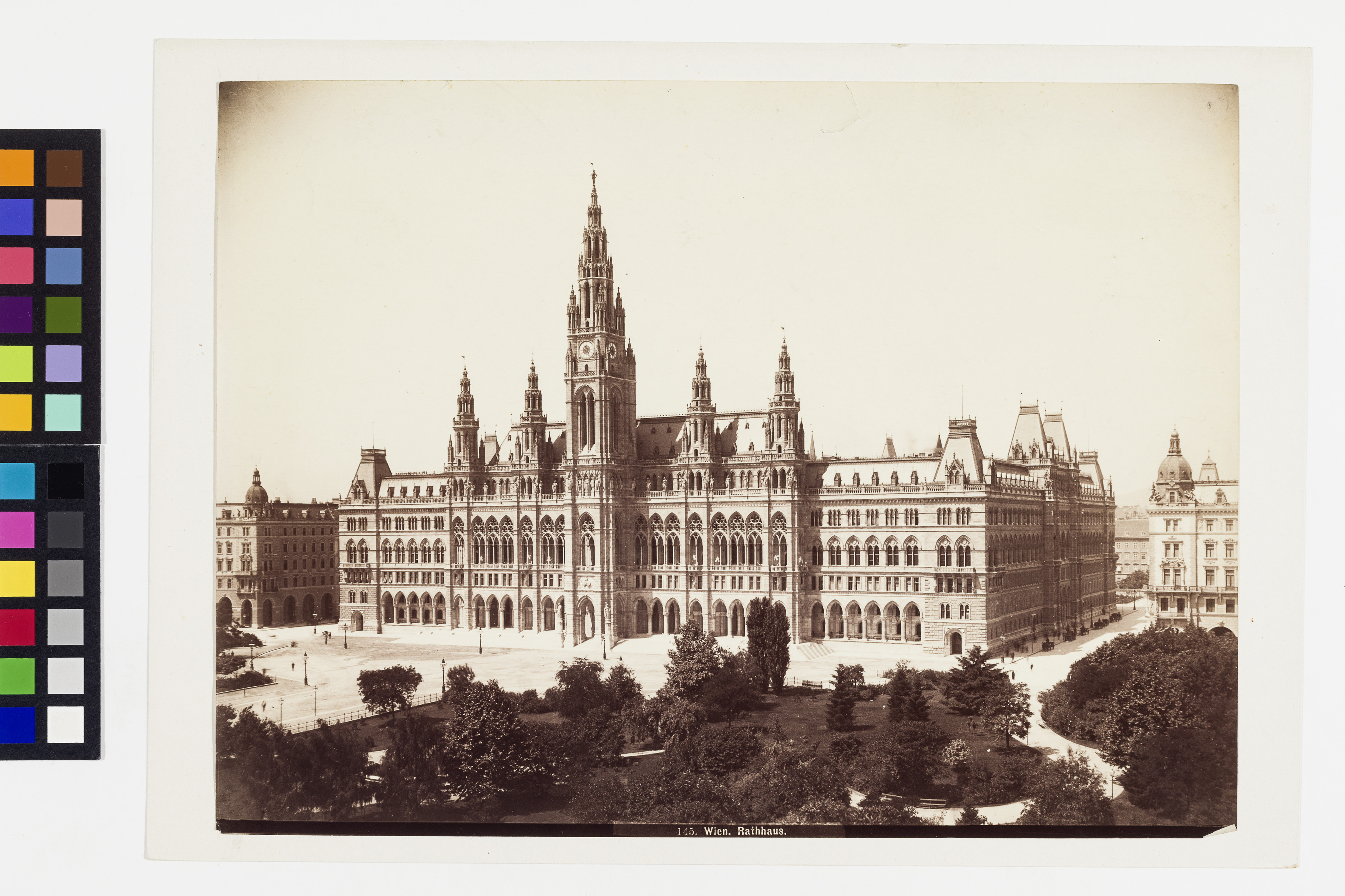 1., Rathausplatz 1 - Rathaus - Hauptfassade - erhöhter Blick vom Rathauspark