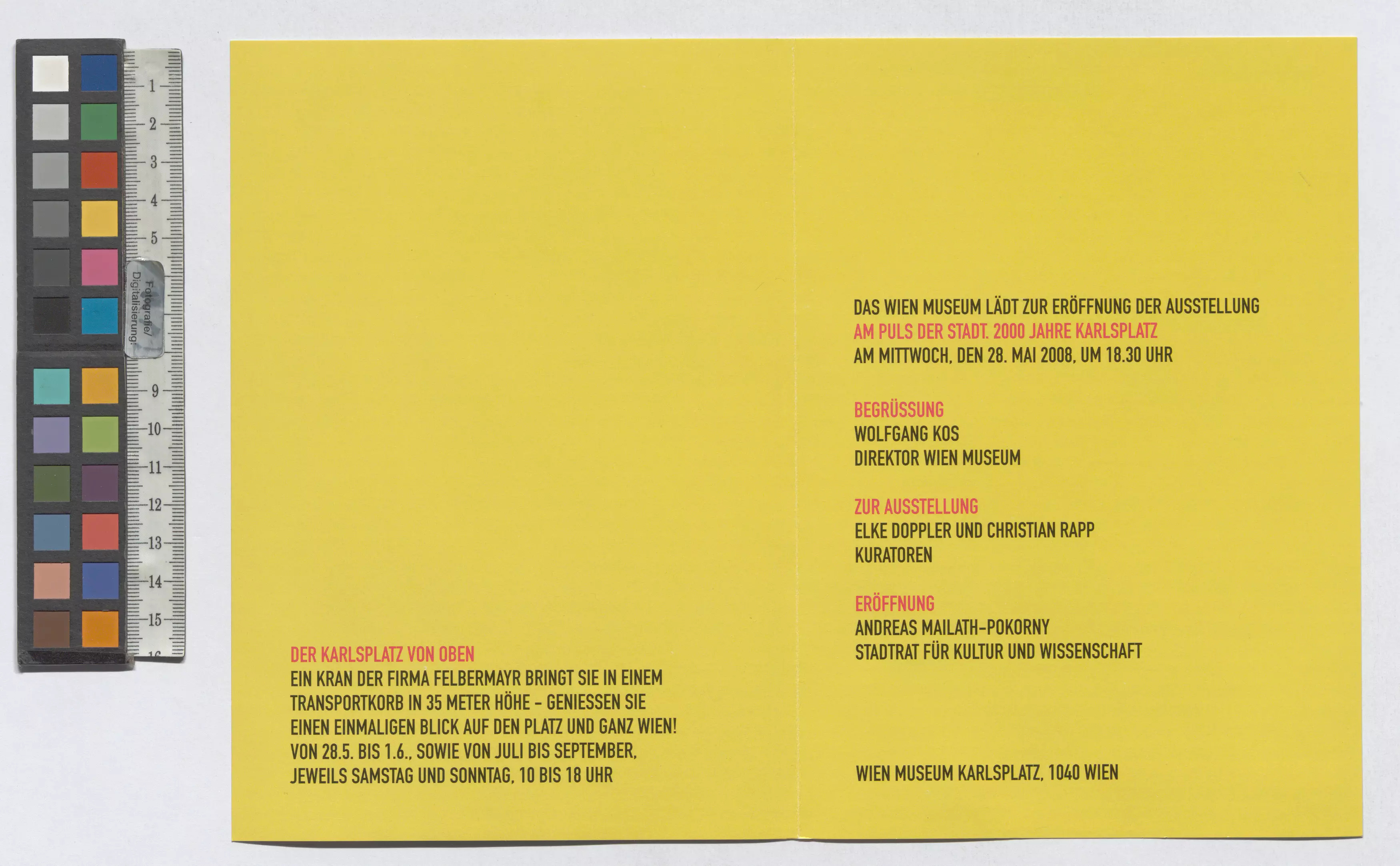 348. Sonderausstellung des Wien Museums: "Am Puls der Stadt. 2000 Jahre Karlsplatz", Einladung zur Eröffnung