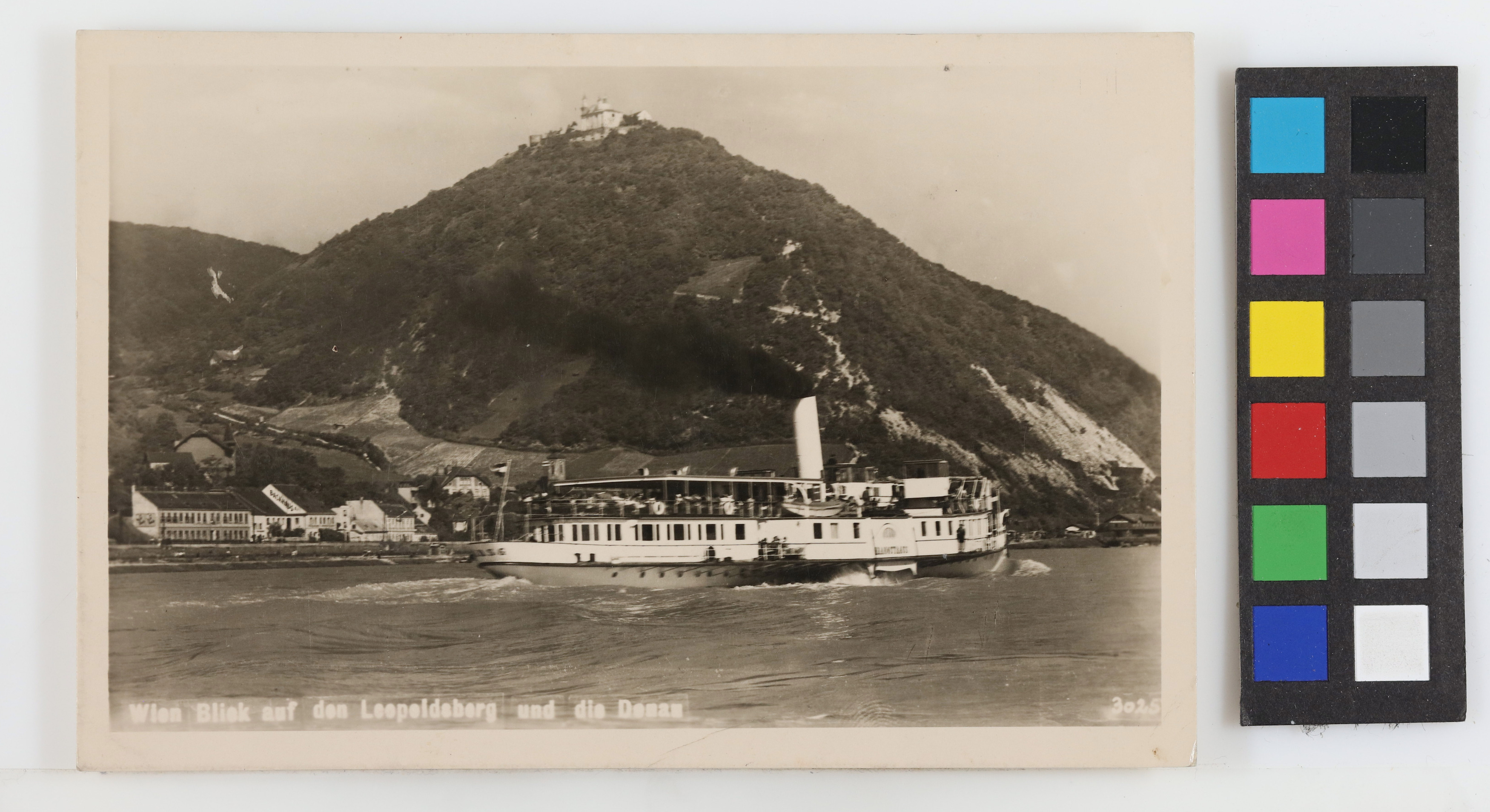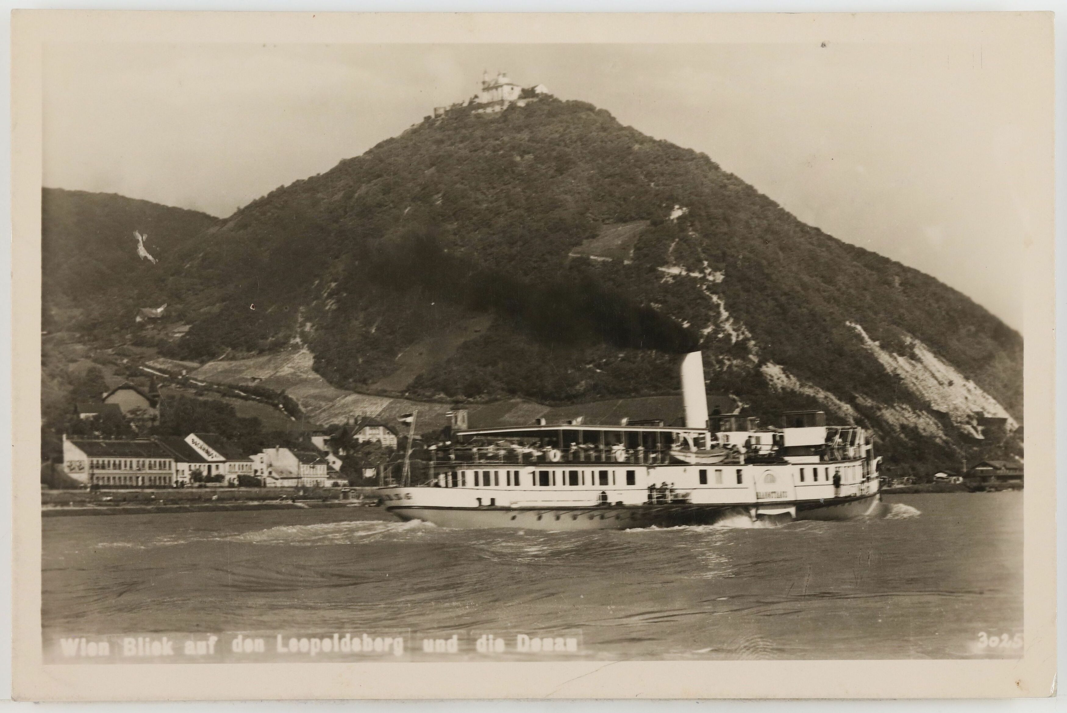 - 19., Leopoldsberg und Donauschiffe, Blick von Floridsdorf aus, Ansichtskarte