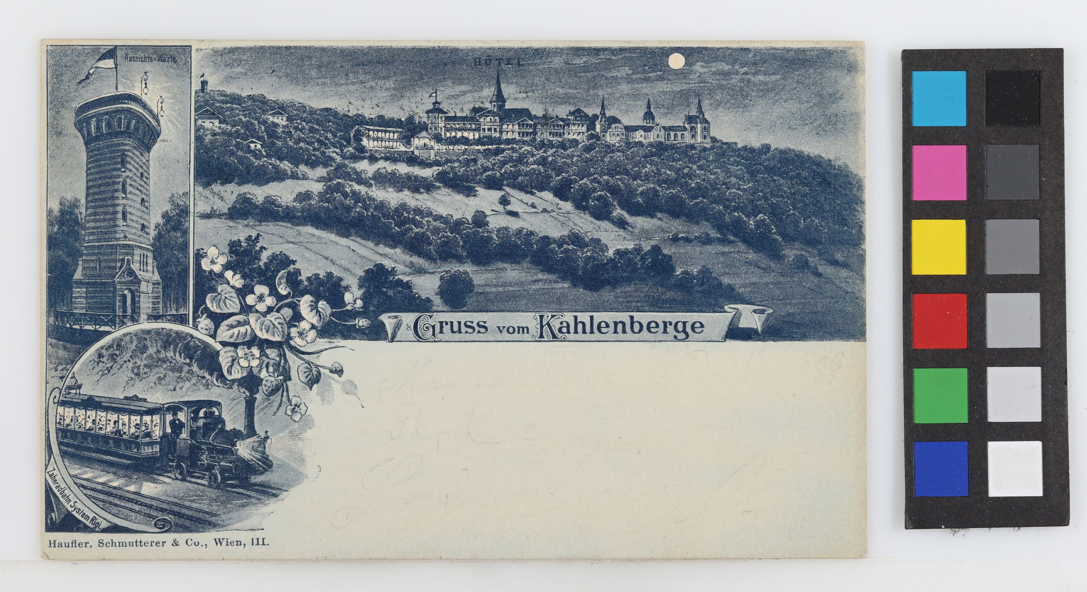 19., Kahlenberg - Mehrbildkarte: mit Kahlenberghotel, Stefanie-Warte und Zahnradbahn, bei Nacht, Ansichtskarte