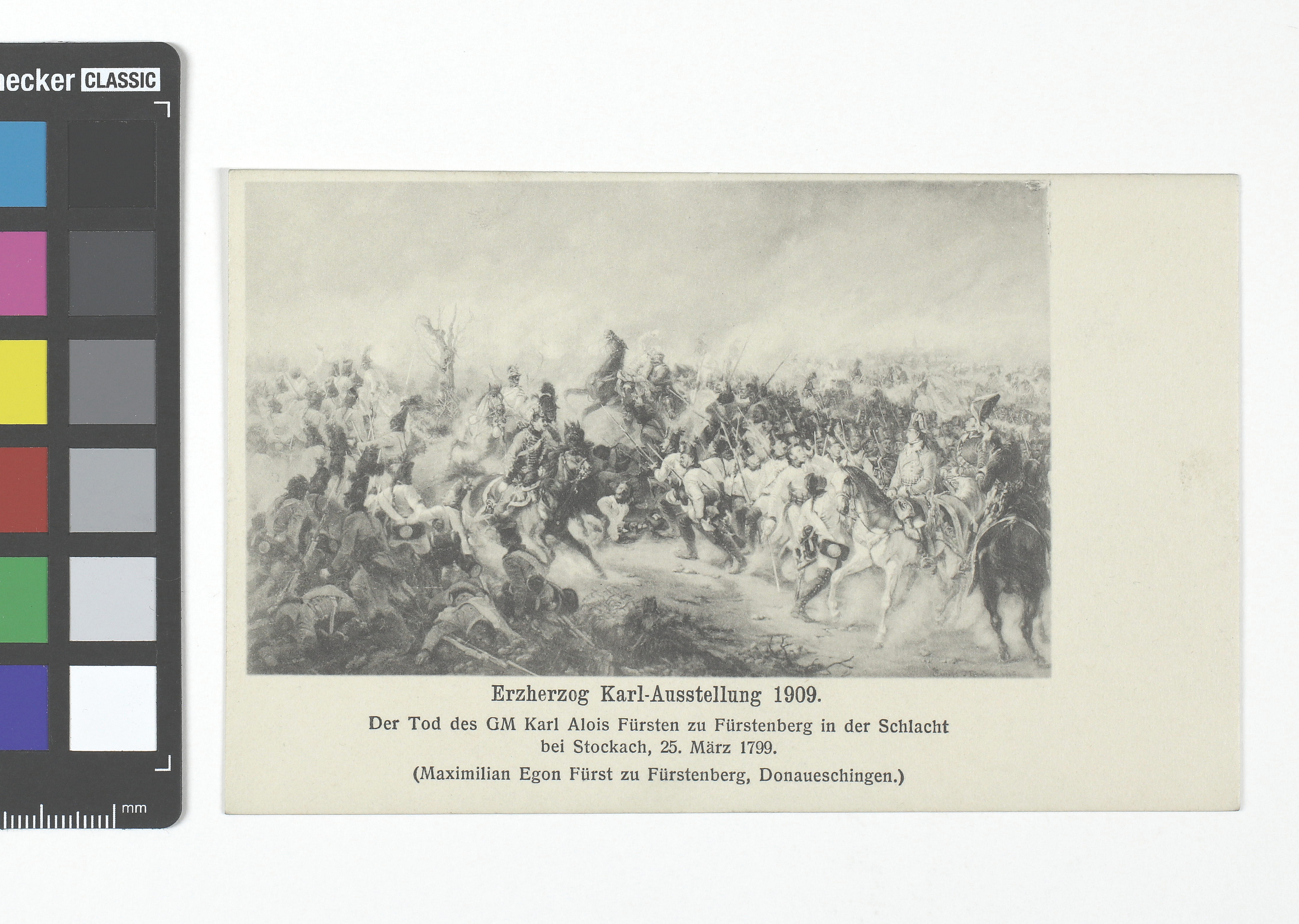 Ansichtskarte: "Erzherzog Karl-Ausstellung 1909. Der Tod des GM Karl Alois Fürsten zu Fürstenberg in der Schlacht bei Stockach, 25. März 1799. (Maximilian Egon Fürst zu Fürstenberg, Donaueschingen.)"