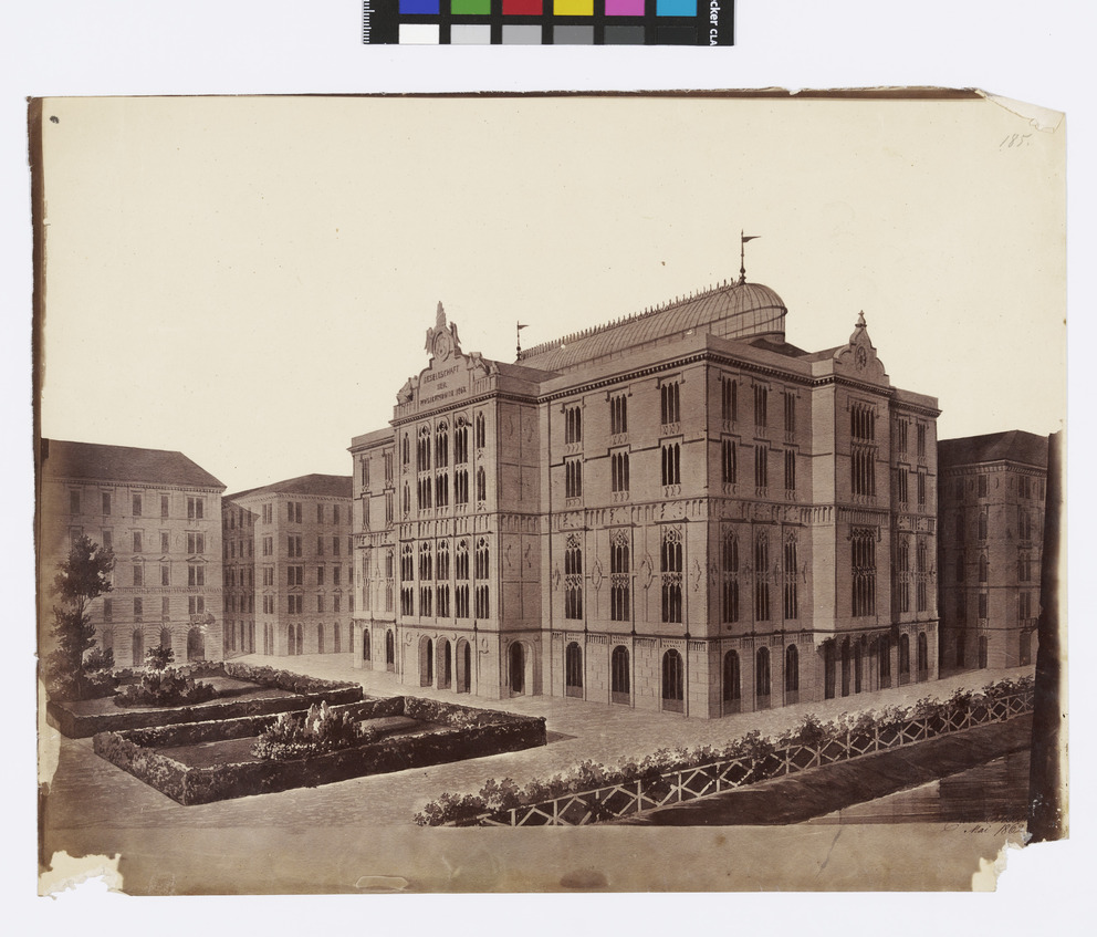 Entwurf für das Gebäude der Gesellschaft der Musikfreunde in Wien / Wiener Musikverein: Schrägansicht der Hauptfassade (Reproduktion)