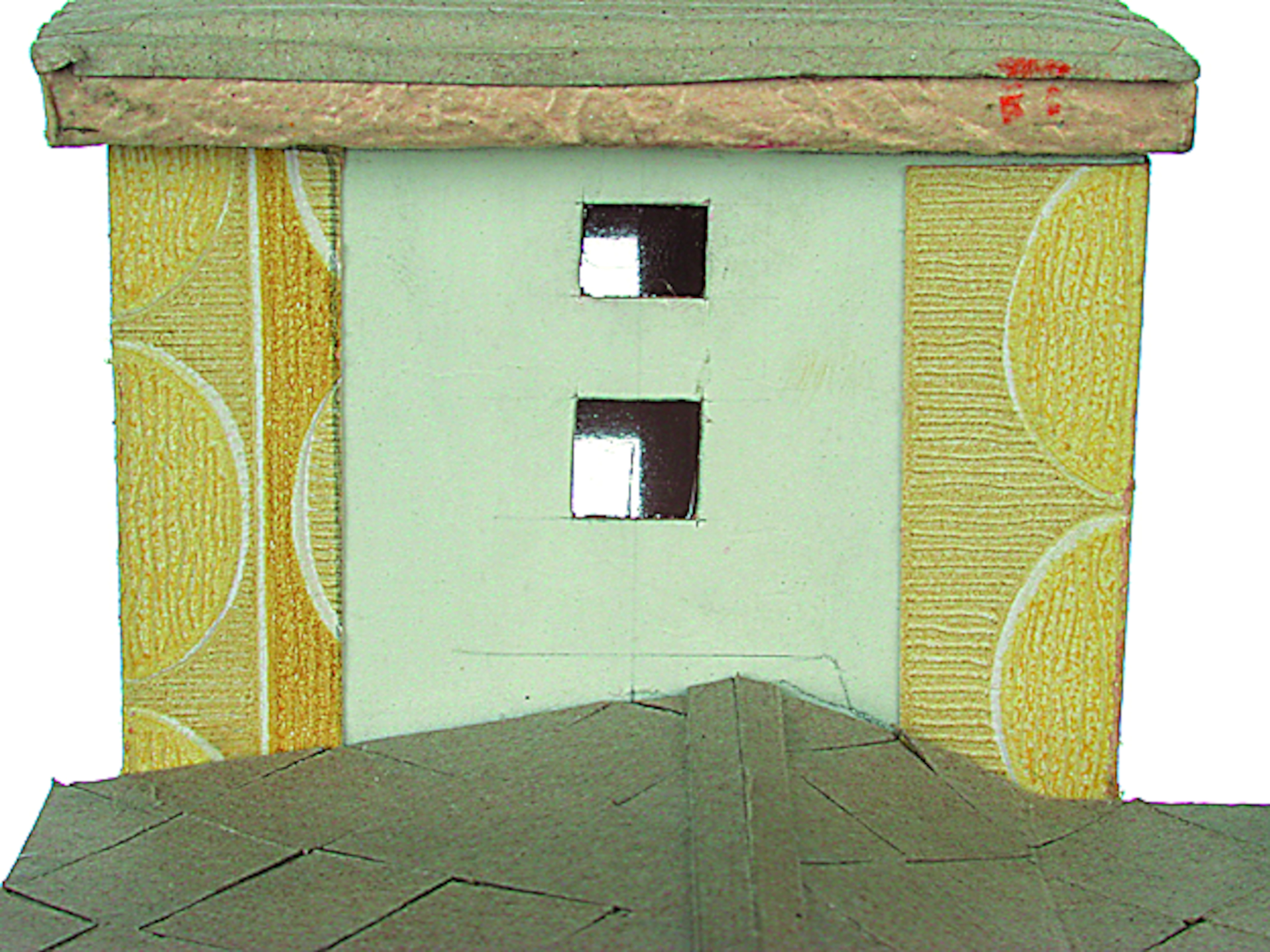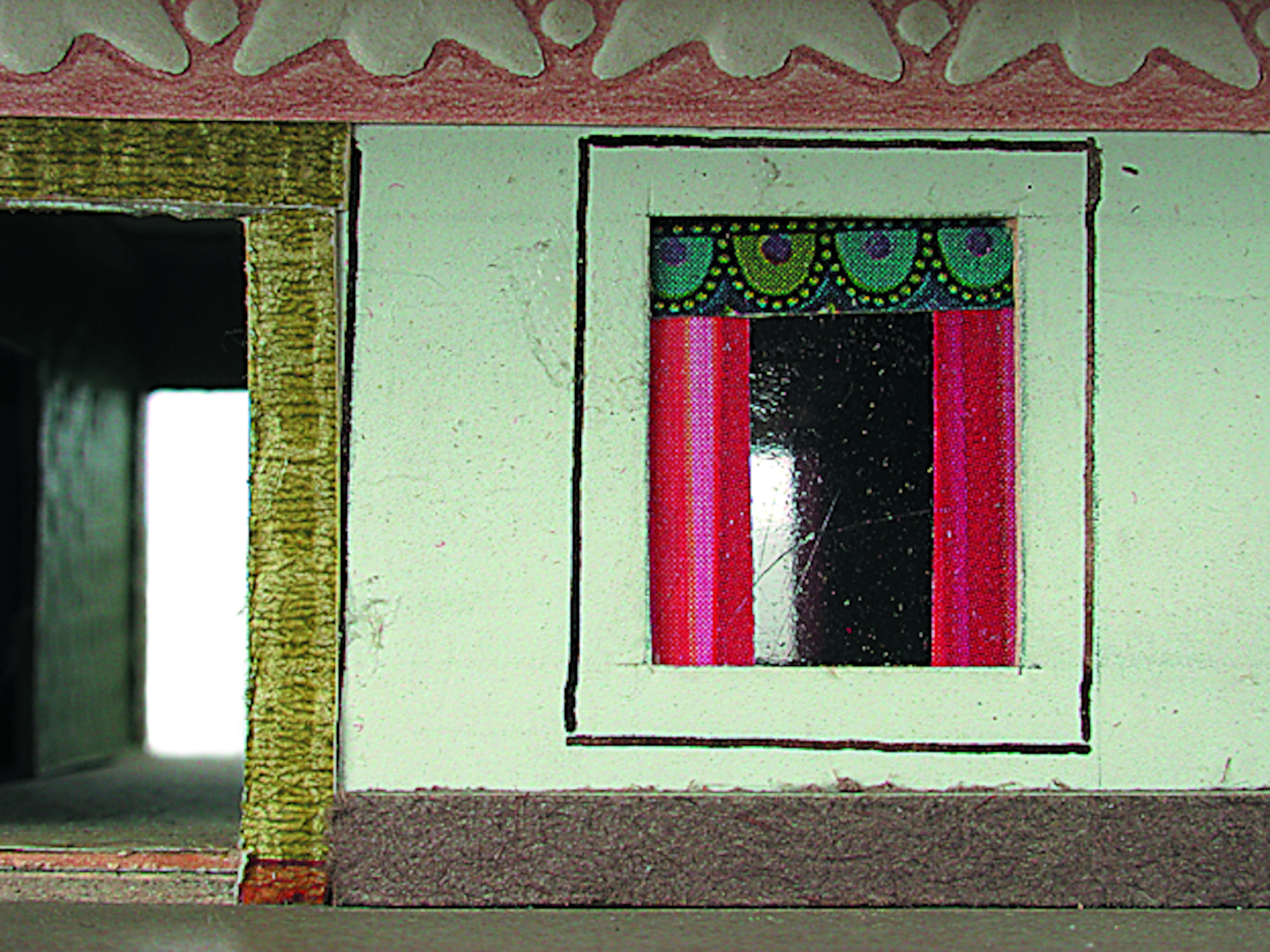 Anmerkung der Redaktion: Nicht von jedem Haus sind alle einzelnen verwendeten Materialien dokumentiert. Tatsächlich verbaute der Bastler auch Zigarettenschachteln, Spinnenpapier, Pappmaschee, Tapetenreste, Bunt- und Silberpapiere, Stoffe, Synthetikfasern, d-c-fix-Folien, Schriftproben, Zeitungsschnipsel und ausgewertete Illustrierte, Kartonagen, Holzabfälle aller Art, Uhu, Holzleim und Tapetenkleister.