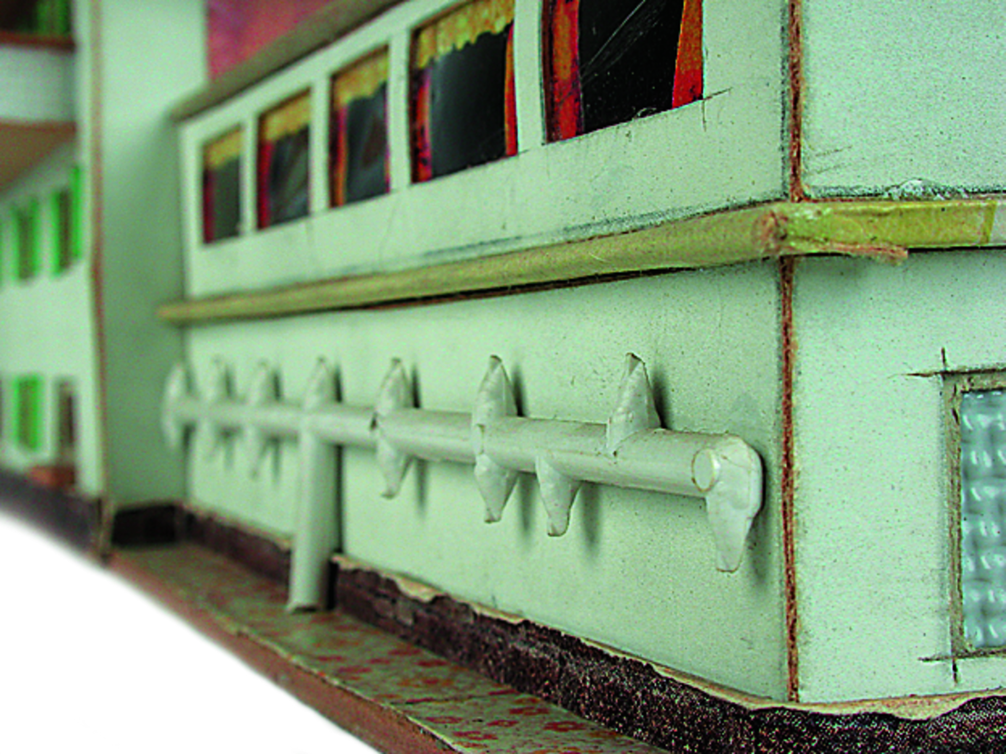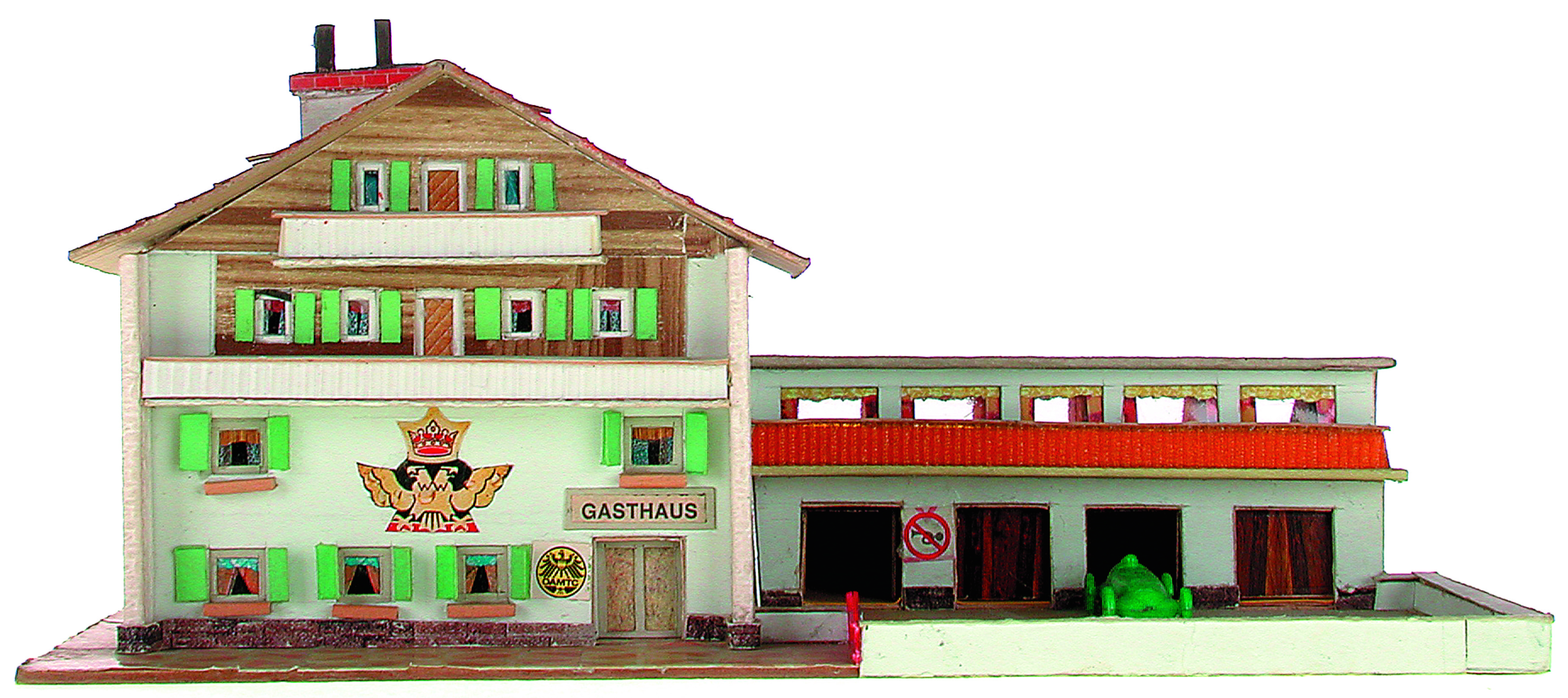 Anmerkung der Redaktion: Nicht von jedem Haus sind alle einzelnen verwendeten Materialien dokumentiert. Tatsächlich verbaute der Bastler auch Zigarettenschachteln, Spinnenpapier, Pappmaschee, Tapetenreste, Bunt- und Silberpapiere, Stoffe, Synthetikfasern, d-c-fix-Folien, Schriftproben, Zeitungsschnipsel und ausgewertete Illustrierte, Kartonagen, Holzabfälle aller Art, Uhu, Holzleim und Tapetenkleister.