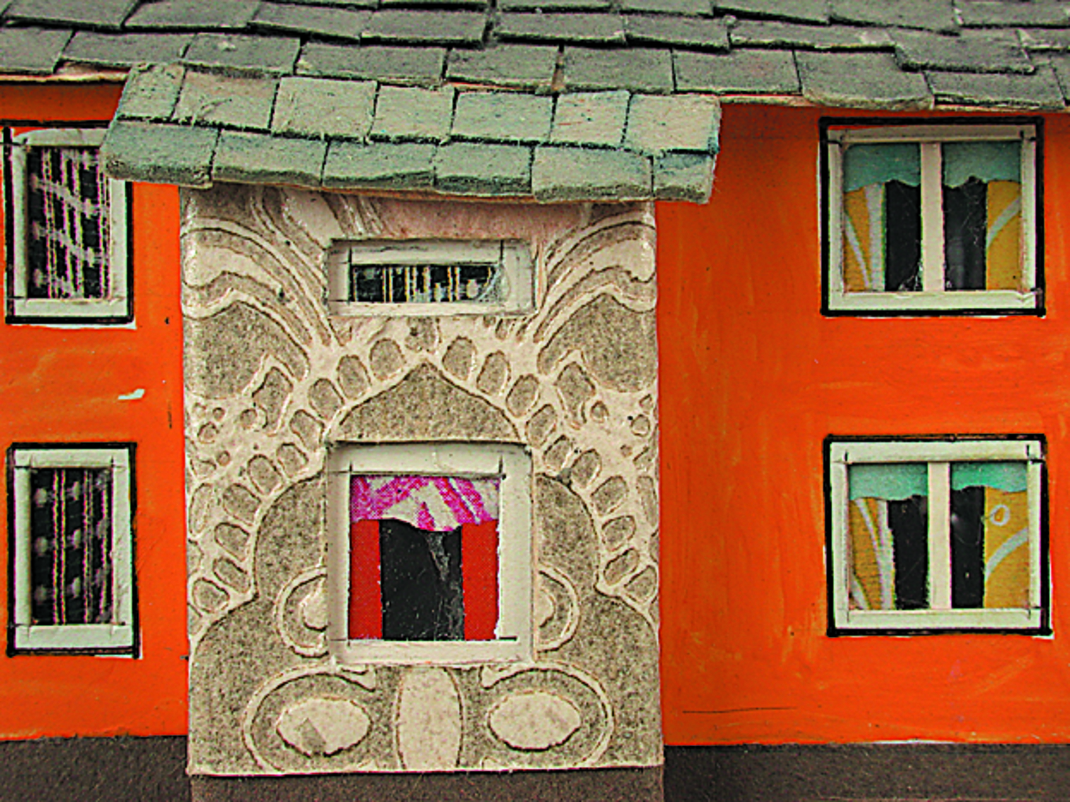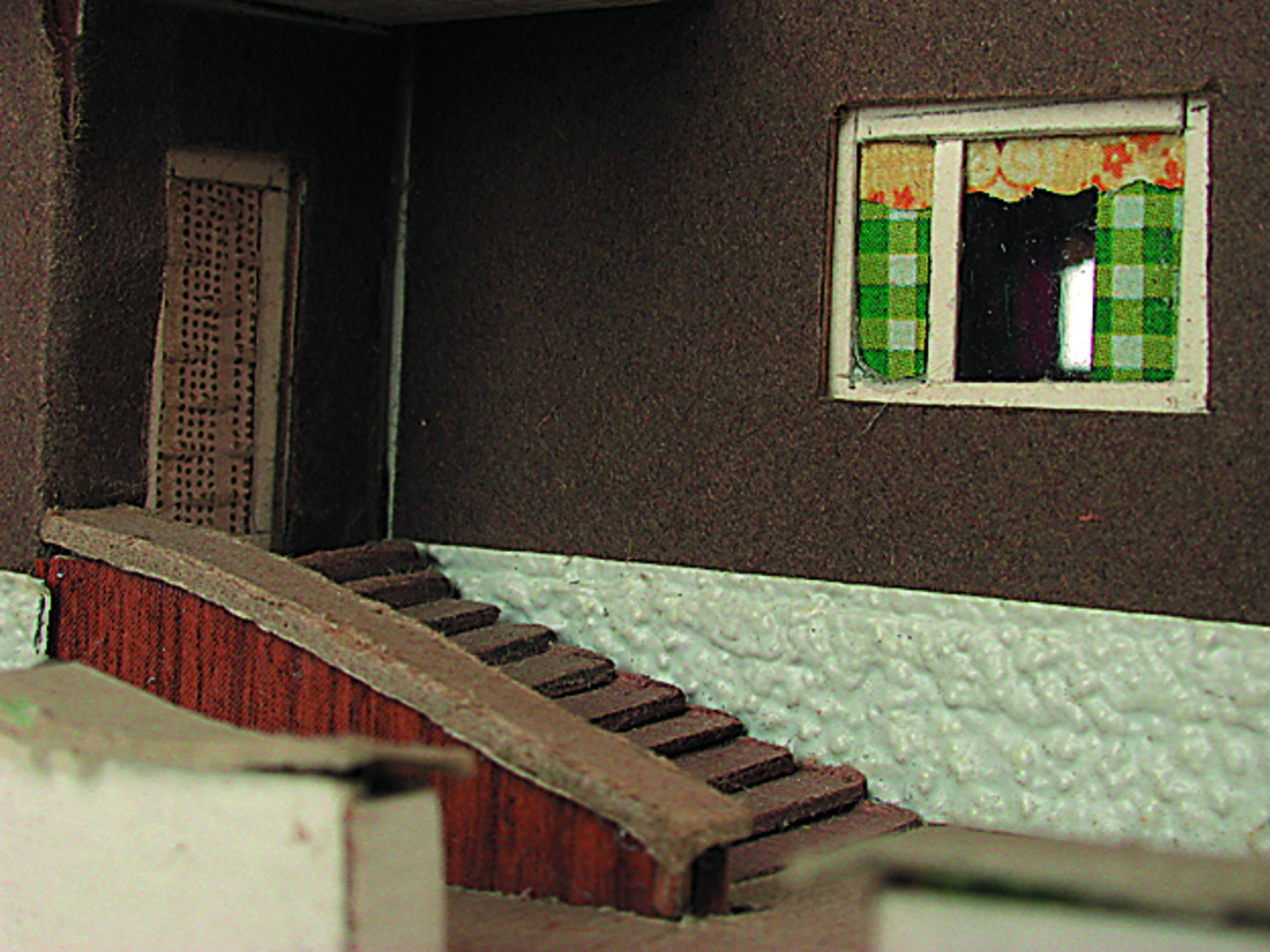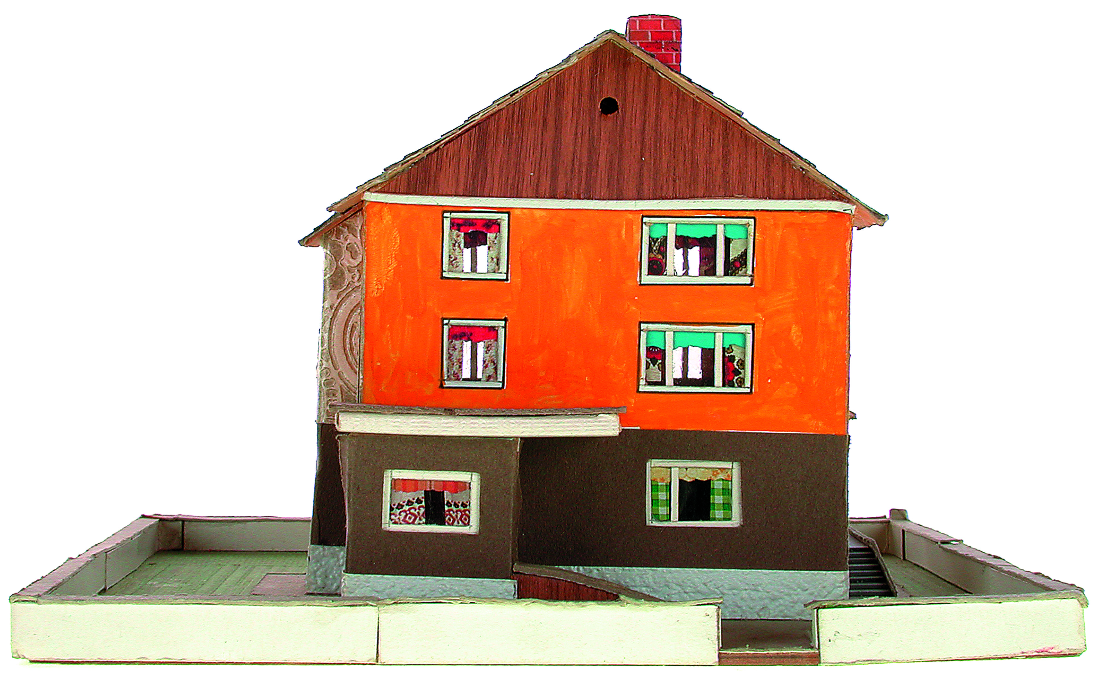 Anmerkung der Redaktion: Nicht von jedem Haus sind alle einzelnen verwendeten Materialien dokumentiert. Tatsächlich verbaute der Bastler auch Zigarettenschachteln, Spinnenpapier, Pappmaschee, Tapetenreste, Bunt- und Silberpapiere, Stoffe, Synthetikfasern, d-c-fix-Folien, Schriftproben, Zeitungsschnipsel und ausgewertete Illustrierte, Kartonagen, Holzabfälle aller Art, Uhu, Holzleim und Tapetenkleister.