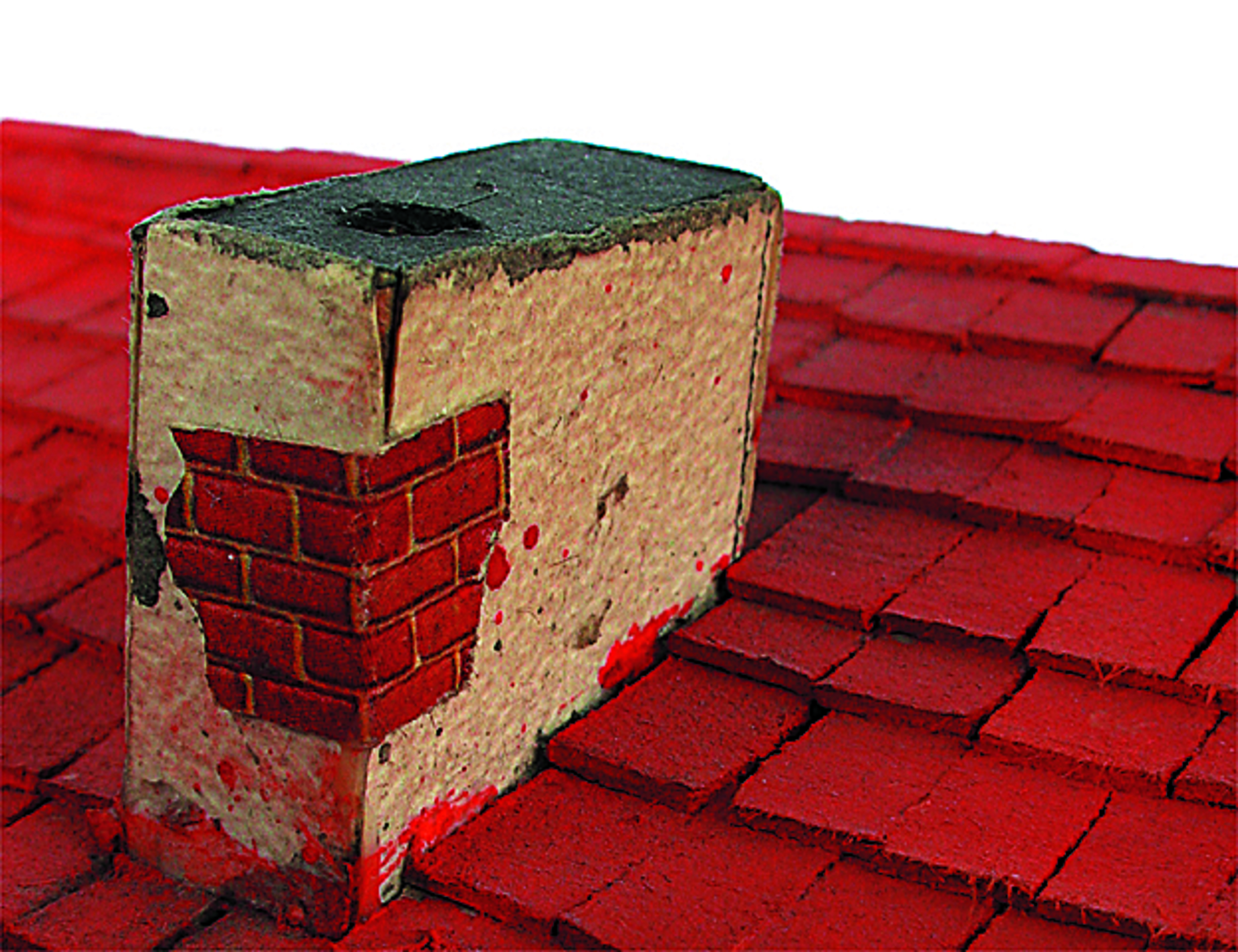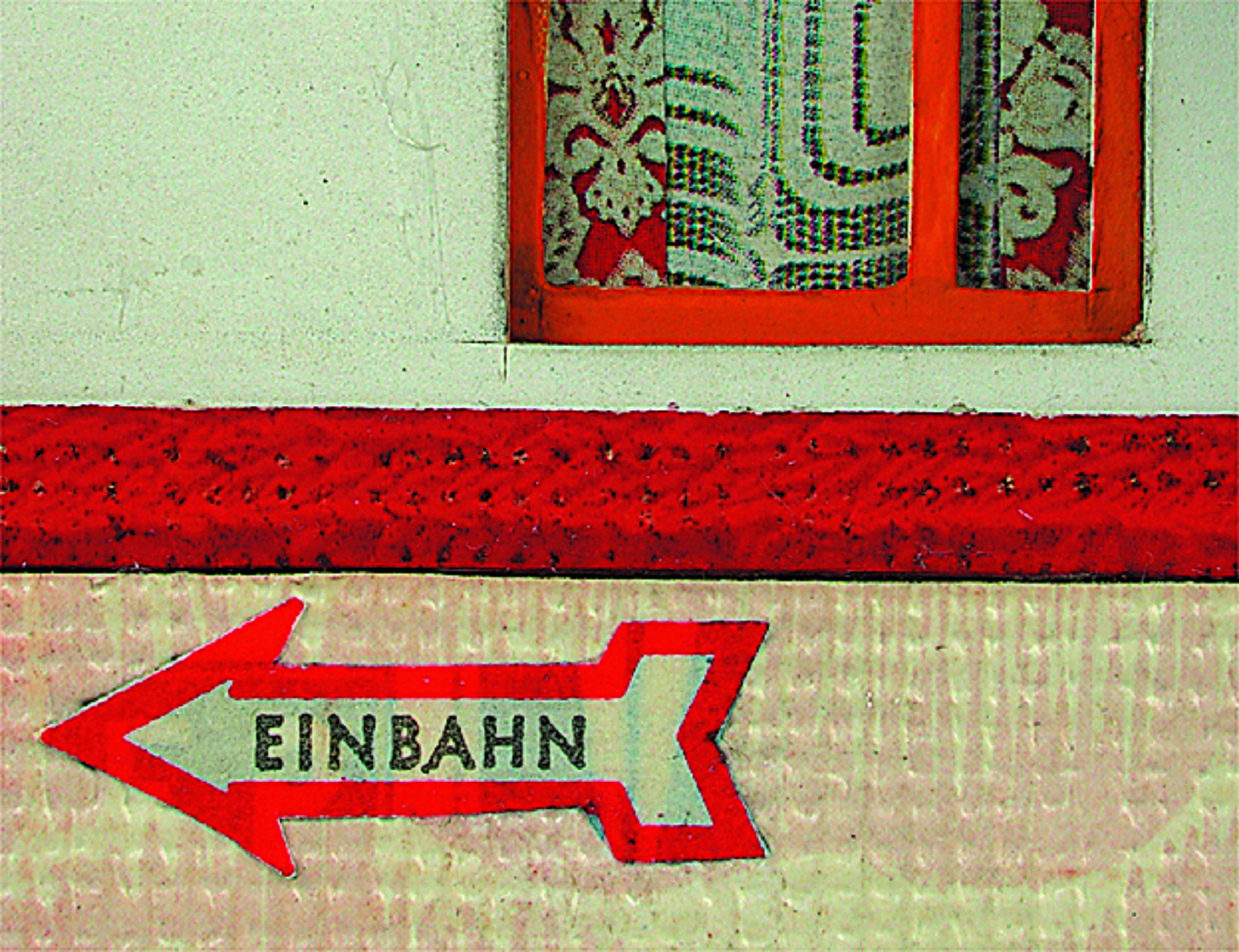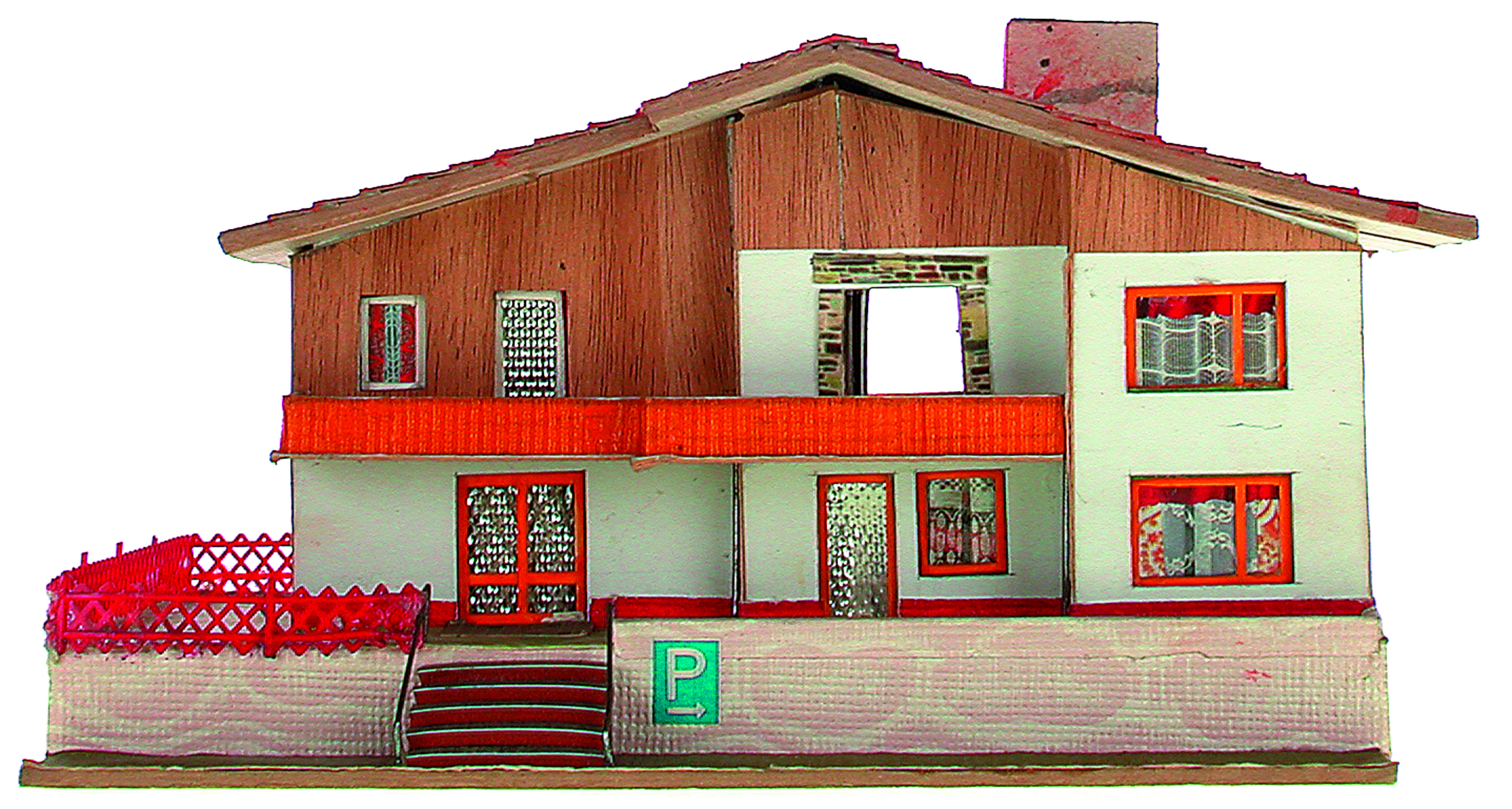 Anmerkung der Redaktion: Nicht von jedem Haus sind alle einzelnen verwendeten Materialien dokumentiert. Tatsächlich verbaute der Bastler auch Zigarettenschachteln, Spinnenpapier, Pappmaschee, Tapetenreste, Bunt- und Silberpapiere, Stoffe, Synthetikfasern, d-c-fix-Folien, Schriftproben, Zeitungsschnipsel und ausgewertete Illustrierte, Kartonagen, Holzabfälle aller Art, Uhu, Holzleim und Tapetenkleister.