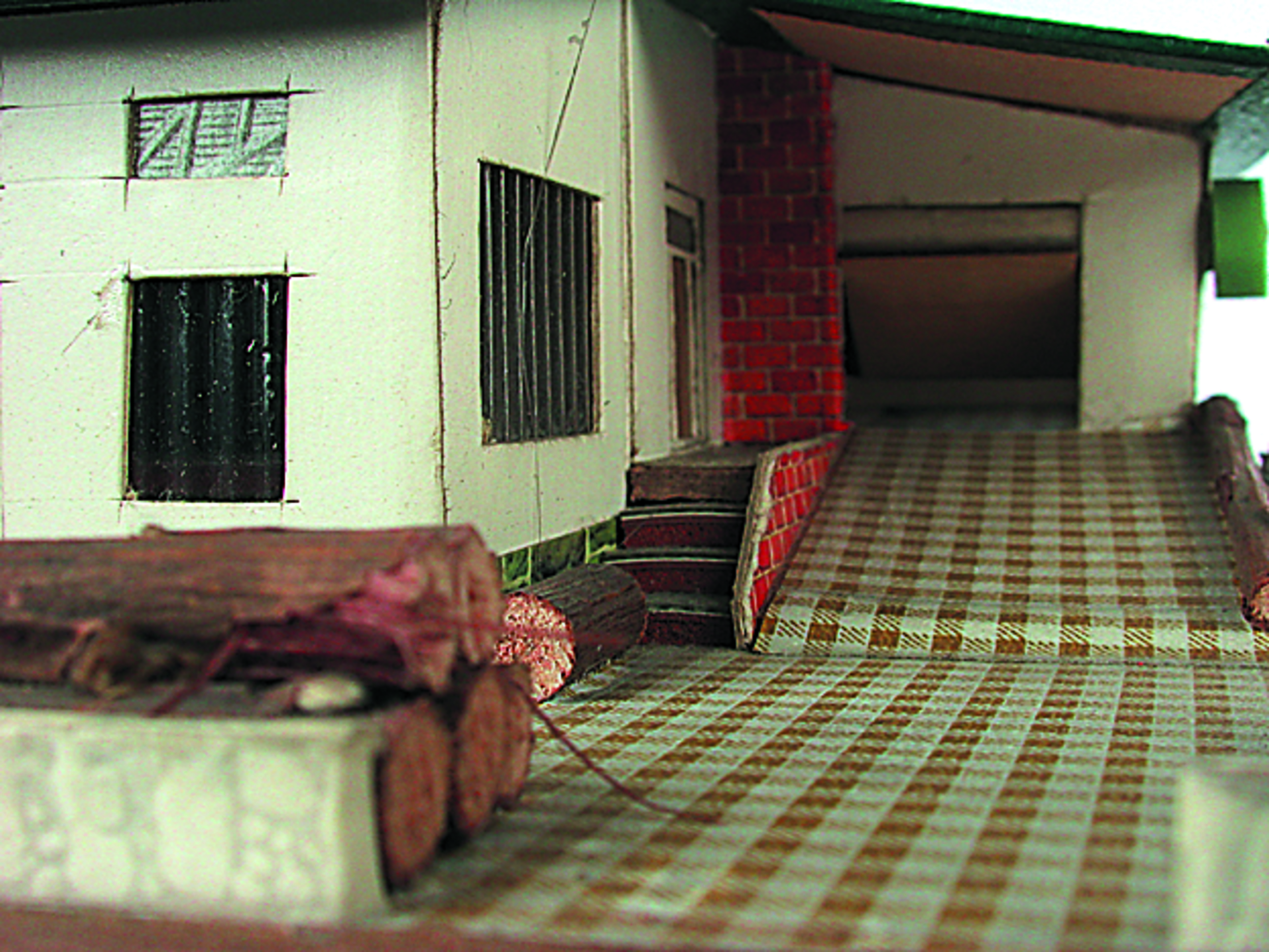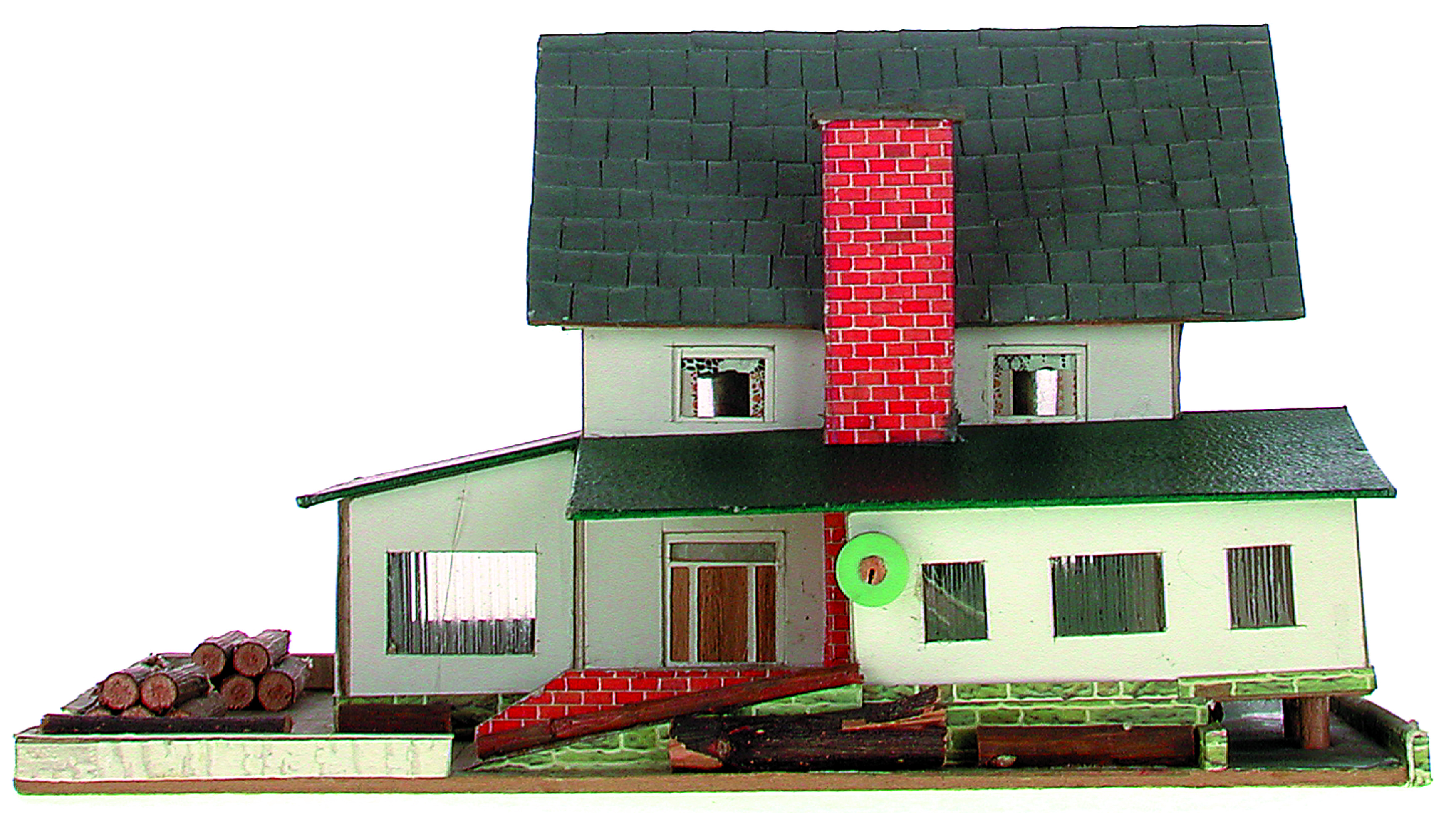 Anmerkung der Redaktion: Nicht von jedem Haus sind alle einzelnen verwendeten Materialien dokumentiert. Tatsächlich verbaute der Bastler auch Zigarettenschachteln, Spinnenpapier, Pappmaschee, Tapetenreste, Bunt- und Silberpapiere, Stoffe, Synthetikfasern, d-c-fix-Folien, Schriftproben, Zeitungsschnipsel und ausgewertete Illustrierte, Kartonagen, Holzabfälle aller Art, Uhu, Holzleim und Tapetenkleister.
