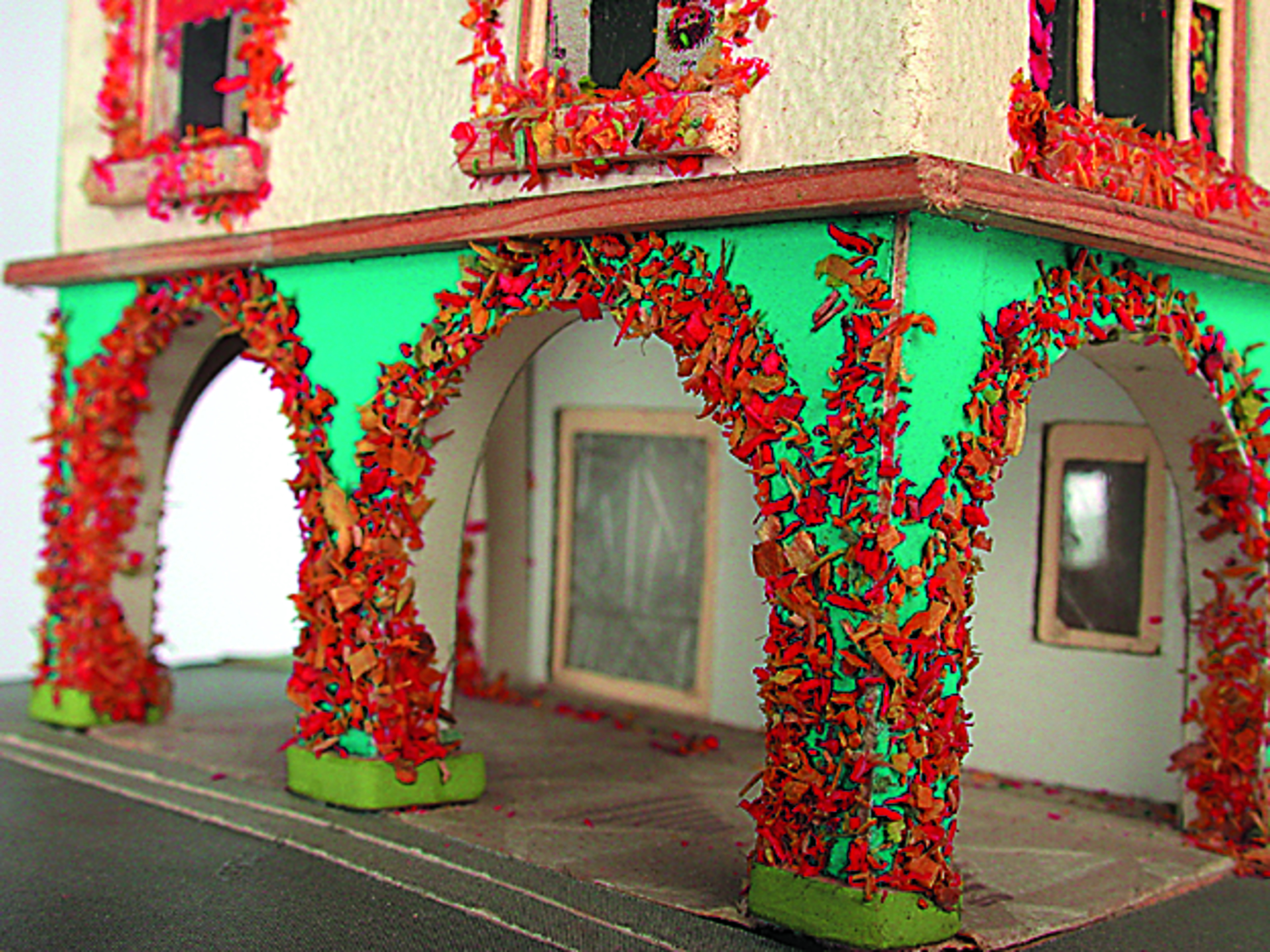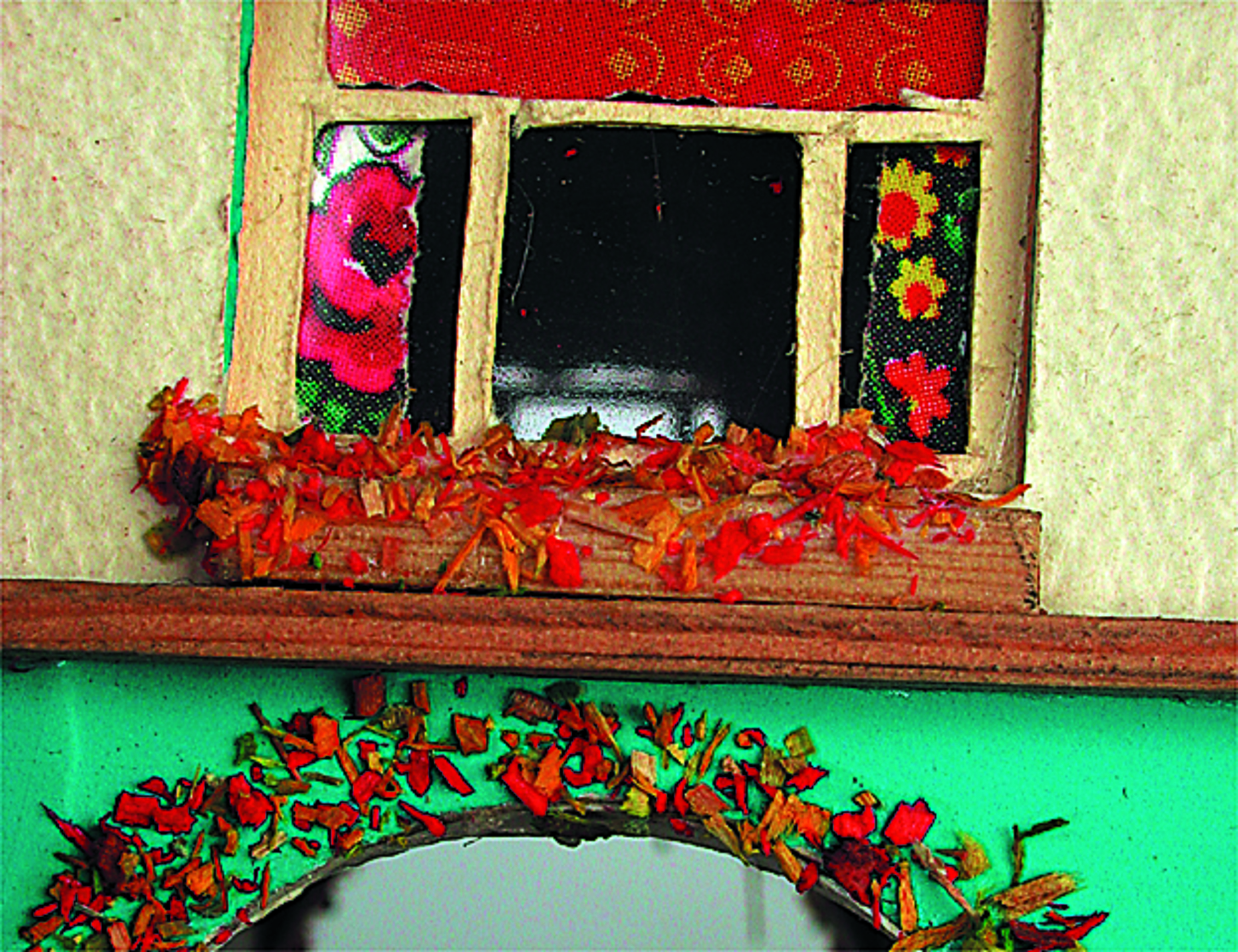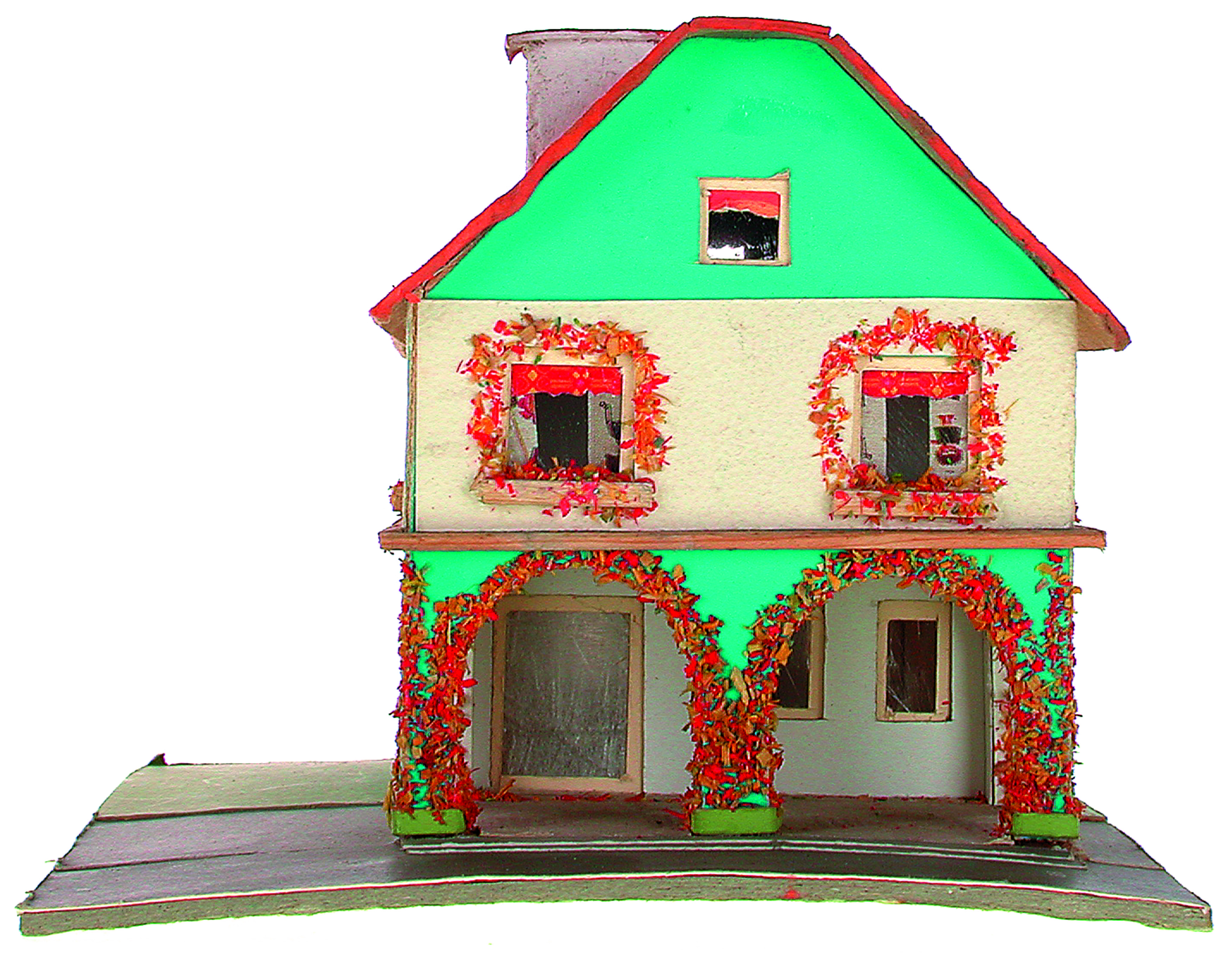 Anmerkung der Redaktion: Nicht von jedem Haus sind alle einzelnen verwendeten Materialien dokumentiert. Tatsächlich verbaute der Bastler auch Zigarettenschachteln, Spinnenpapier, Pappmaschee, Tapetenreste, Bunt- und Silberpapiere, Stoffe, Synthetikfasern, d-c-fix-Folien, Schriftproben, Zeitungsschnipsel und ausgewertete Illustrierte, Kartonagen, Holzabfälle aller Art, Uhu, Holzleim und Tapetenkleister.