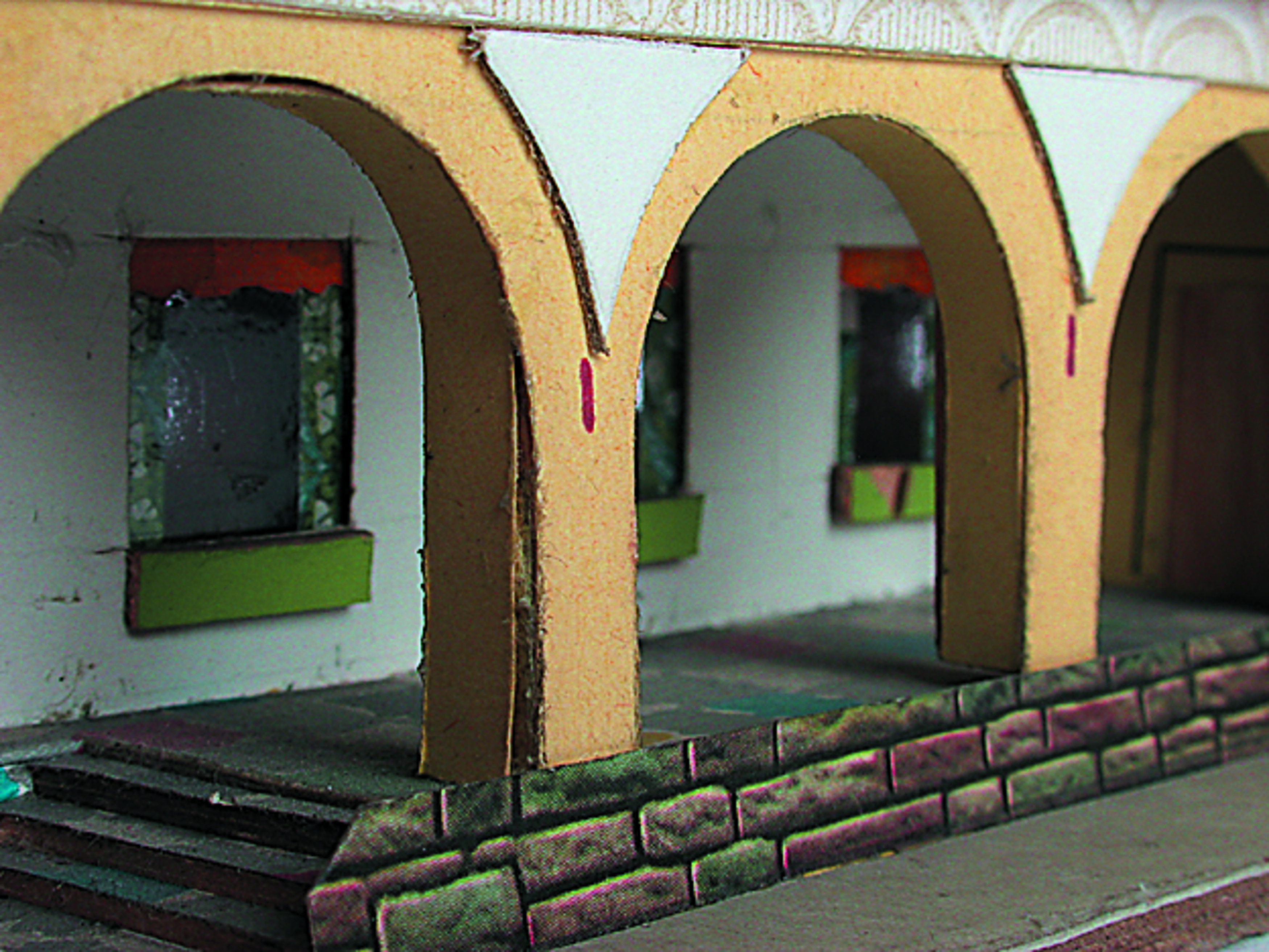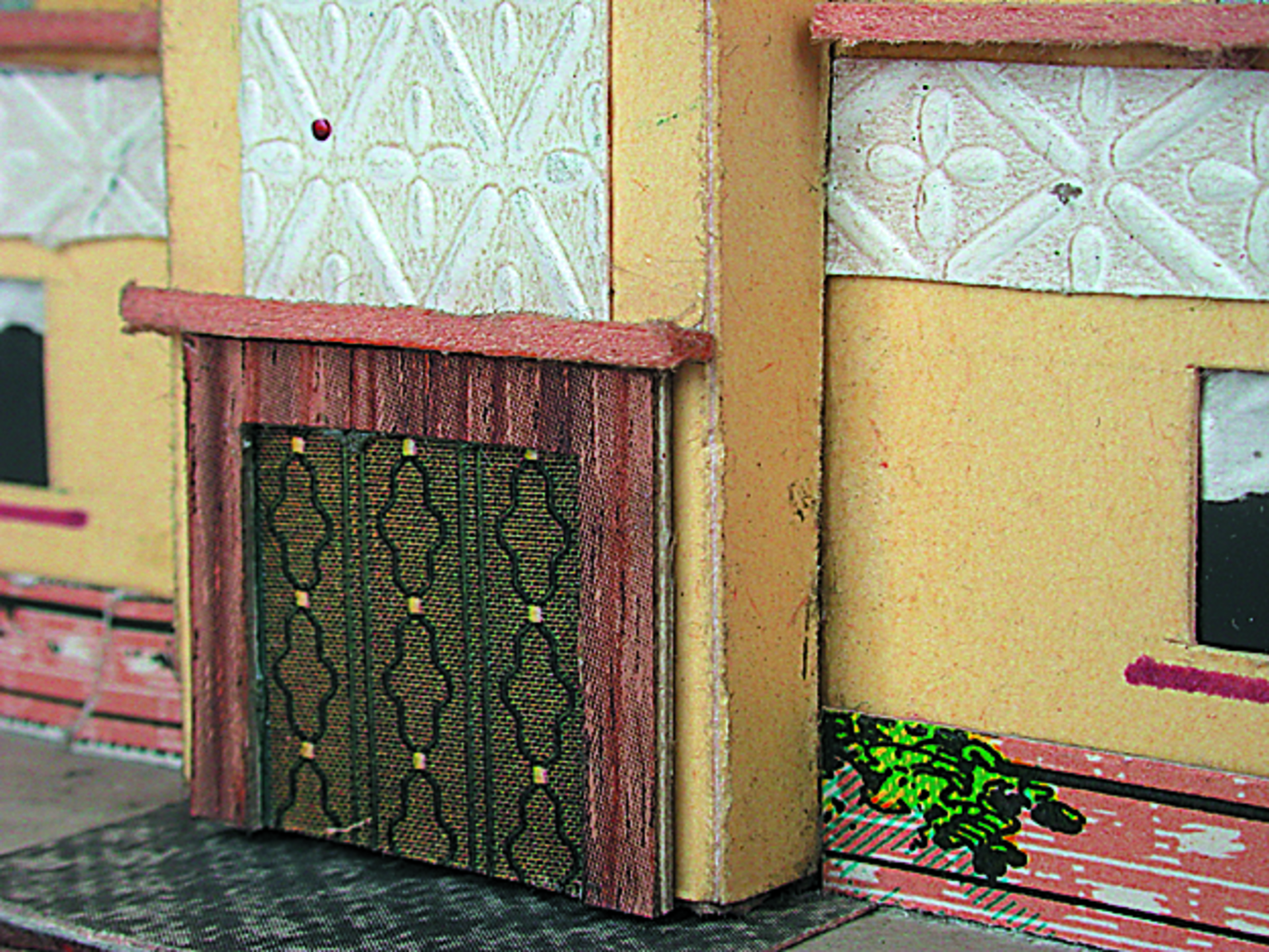 Anmerkung der Redaktion: Nicht von jedem Haus sind alle einzelnen verwendeten Materialien dokumentiert. Tatsächlich verbaute der Bastler auch Zigarettenschachteln, Spinnenpapier, Pappmaschee, Tapetenreste, Bunt- und Silberpapiere, Stoffe, Synthetikfasern, d-c-fix-Folien, Schriftproben, Zeitungsschnipsel und ausgewertete Illustrierte, Kartonagen, Holzabfälle aller Art, Uhu, Holzleim und Tapetenkleister.
