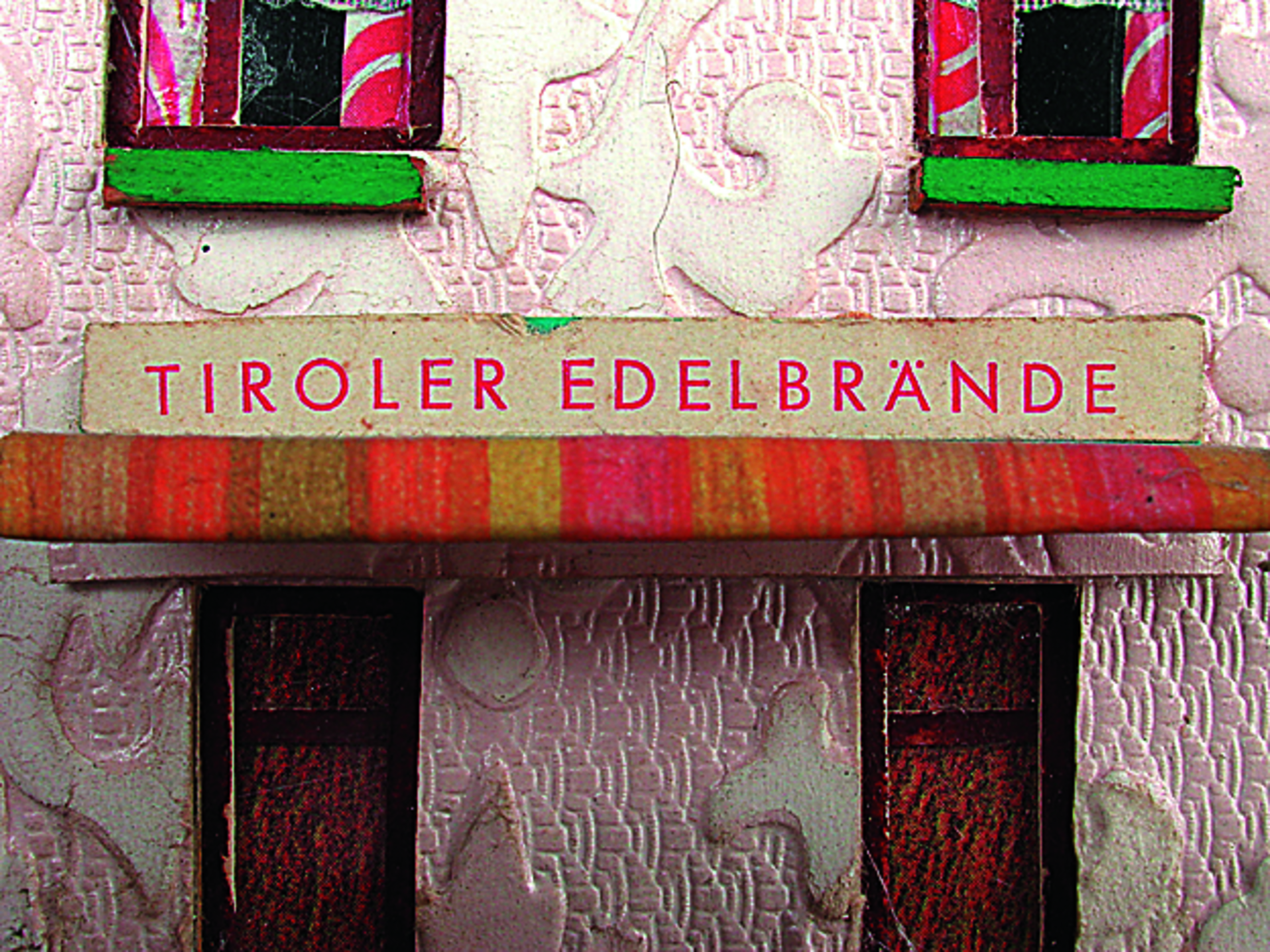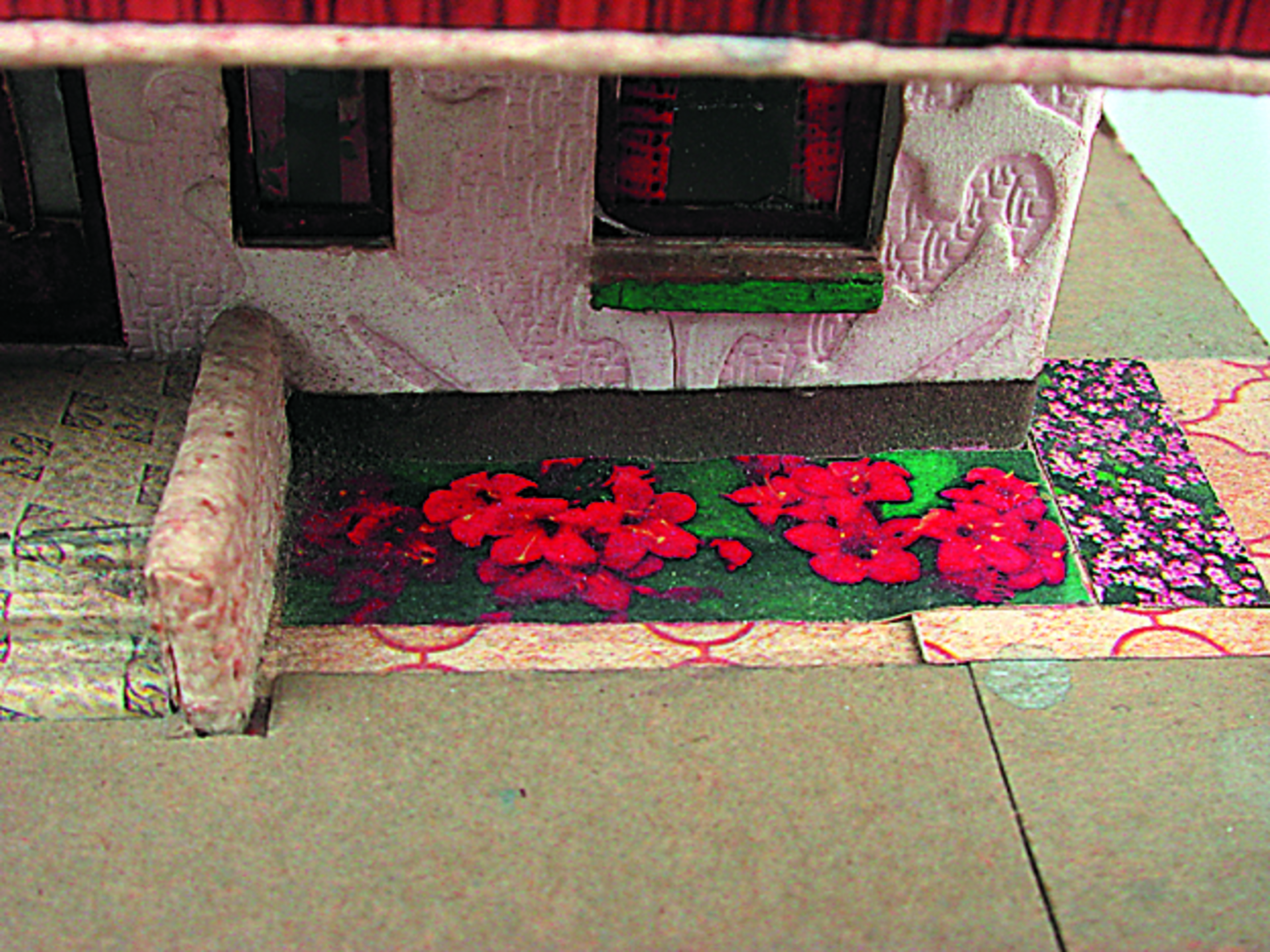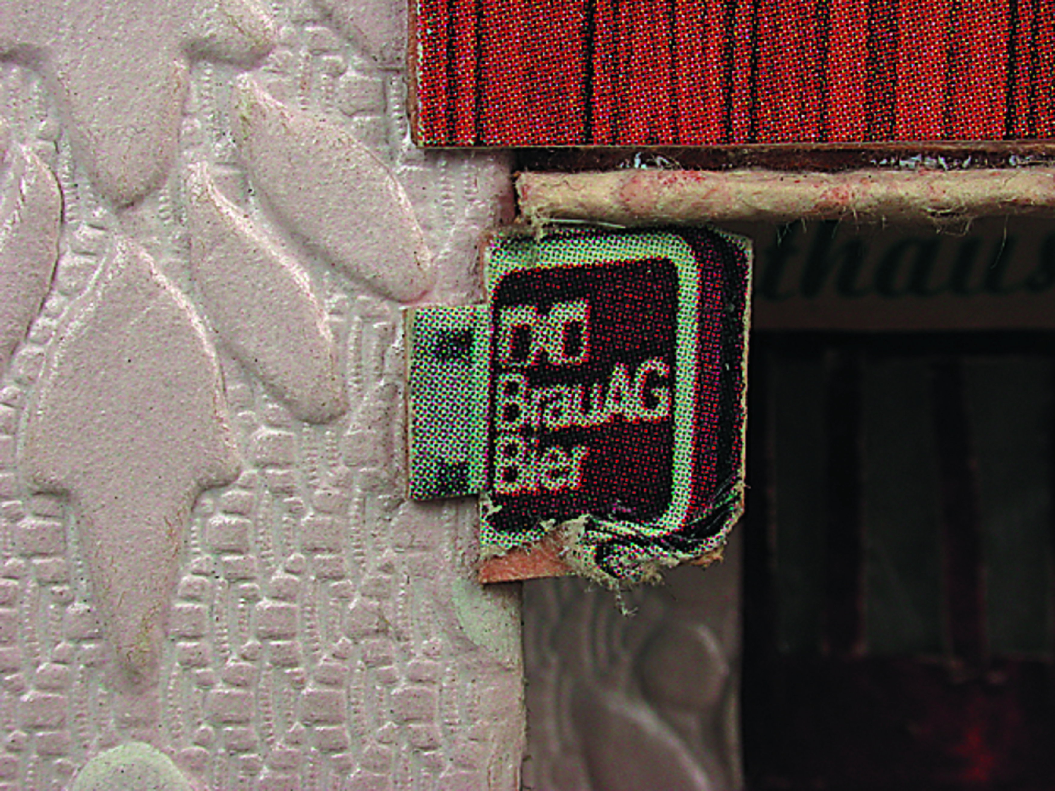Anmerkung der Redaktion: Nicht von jedem Haus sind alle einzelnen verwendeten Materialien dokumentiert. Tatsächlich verbaute der Bastler auch Zigarettenschachteln, Spinnenpapier, Pappmaschee, Tapetenreste, Bunt- und Silberpapiere, Stoffe, Synthetikfasern, d-c-fix-Folien, Schriftproben, Zeitungsschnipsel und ausgewertete Illustrierte, Kartonagen, Holzabfälle aller Art, Uhu, Holzleim und Tapetenkleister.