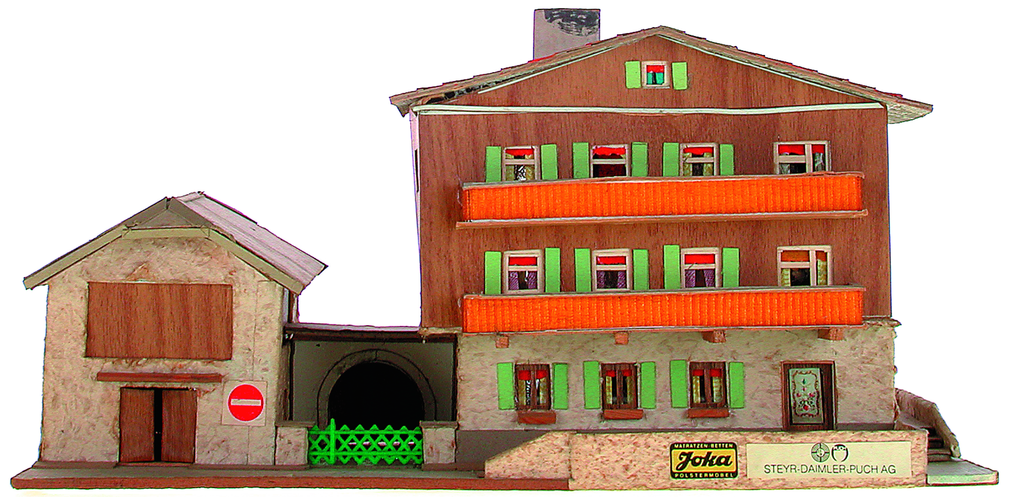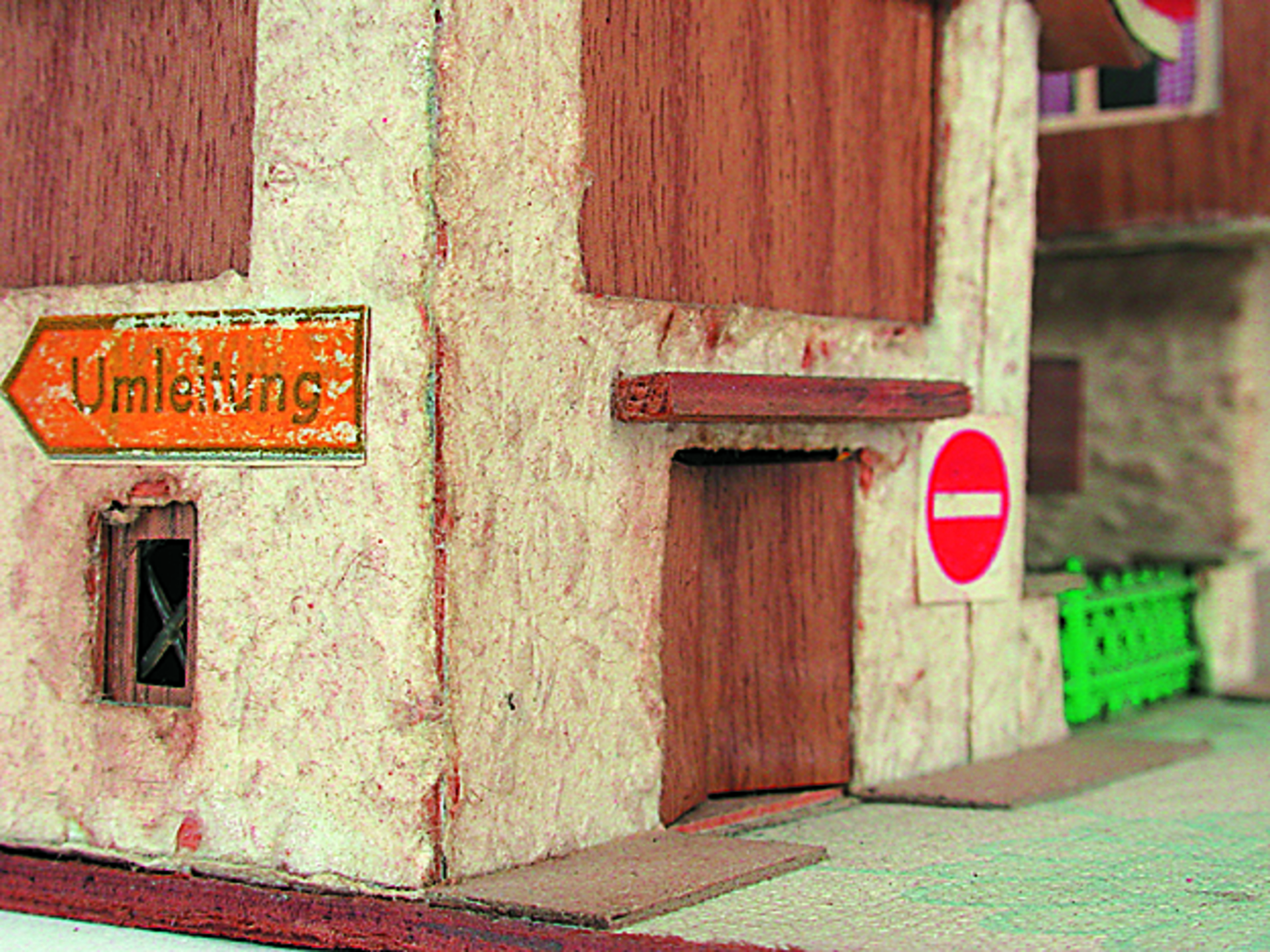 Anmerkung der Redaktion: Nicht von jedem Haus sind alle einzelnen verwendeten Materialien dokumentiert. Tatsächlich verbaute der Bastler auch Zigarettenschachteln, Spinnenpapier, Pappmaschee, Tapetenreste, Bunt- und Silberpapiere, Stoffe, Synthetikfasern, d-c-fix-Folien, Schriftproben, Zeitungsschnipsel und ausgewertete Illustrierte, Kartonagen, Holzabfälle aller Art, Uhu, Holzleim und Tapetenkleister.