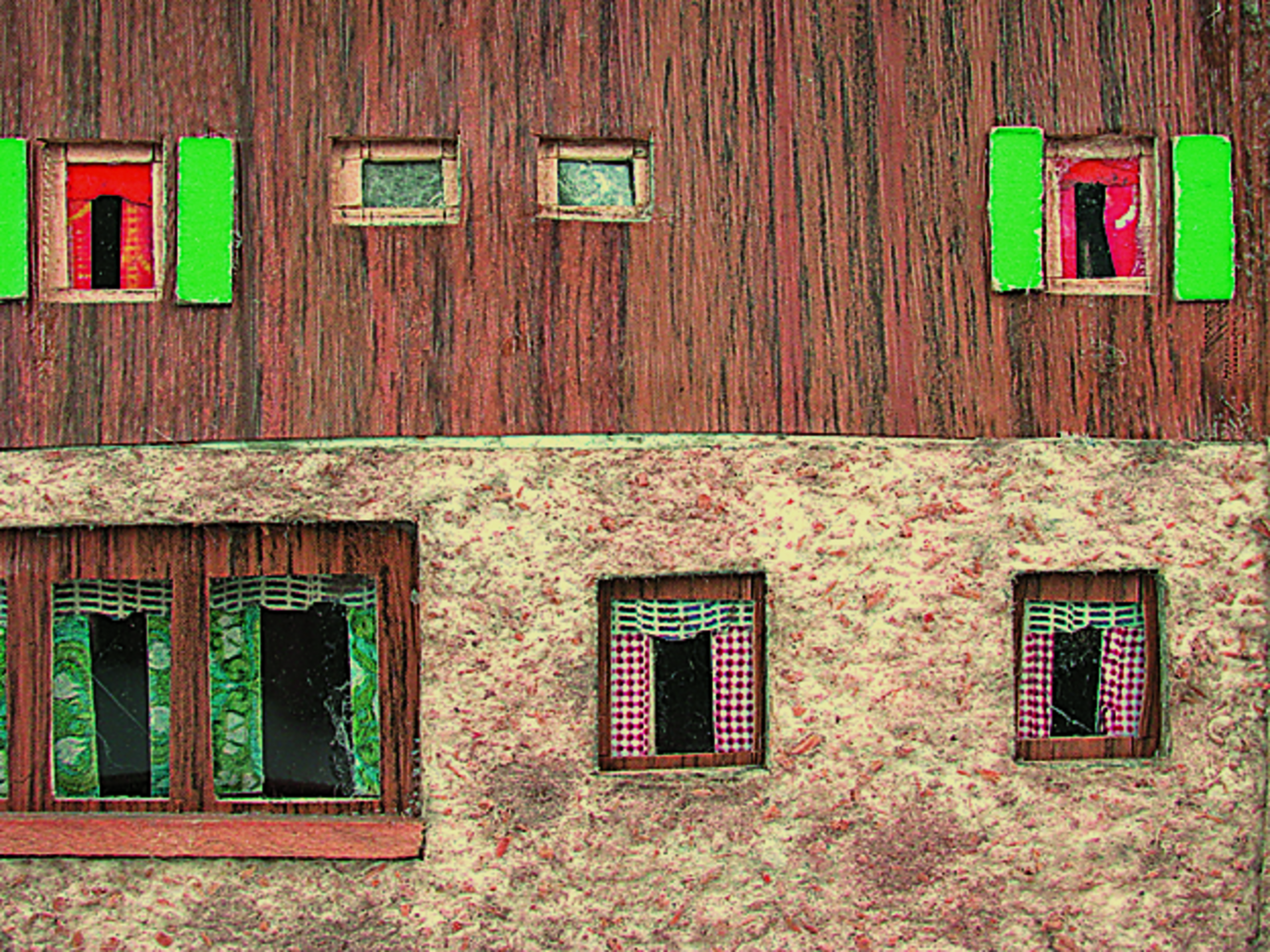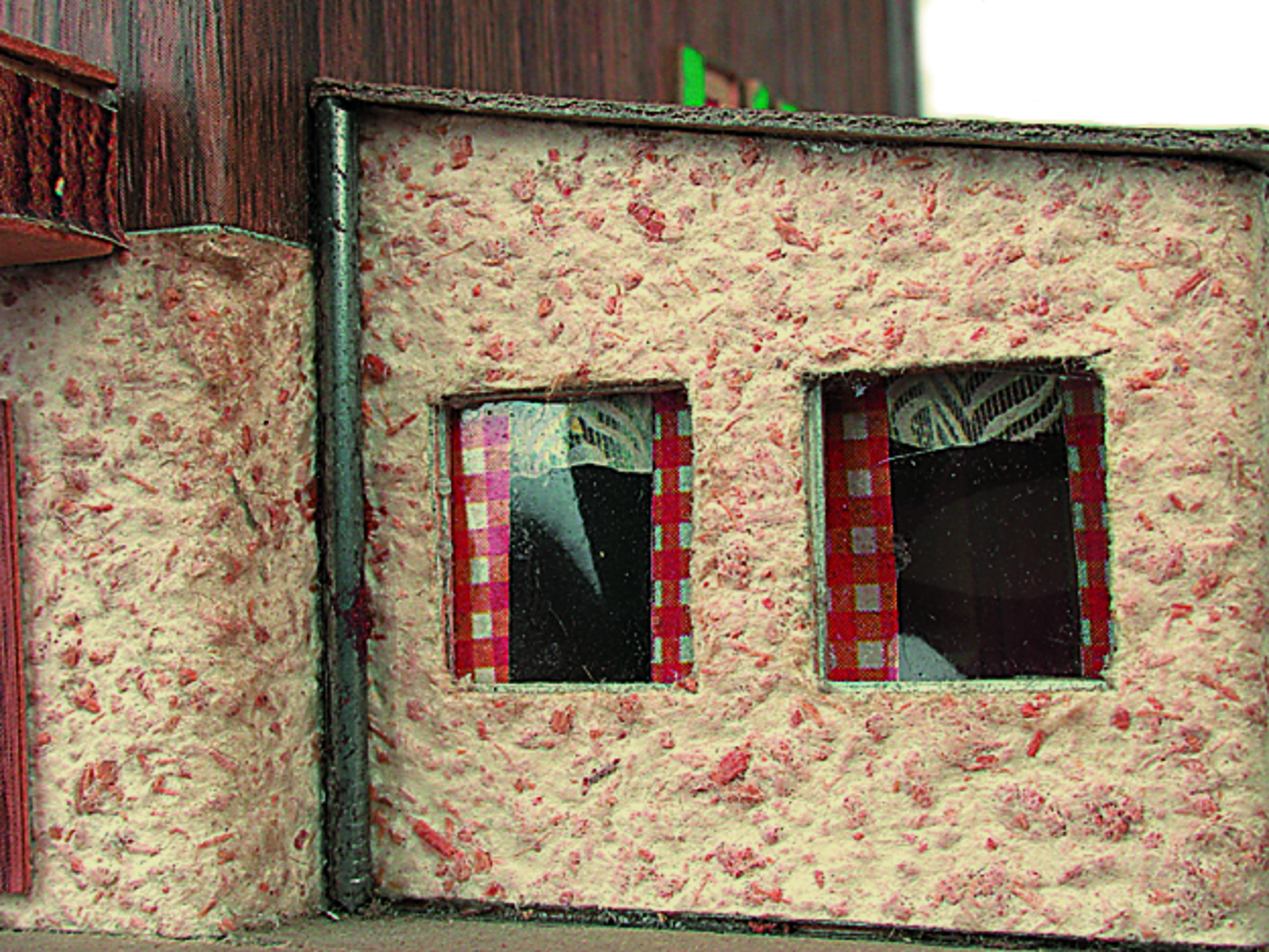 Anmerkung der Redaktion: Nicht von jedem Haus sind alle einzelnen verwendeten Materialien dokumentiert. Tatsächlich verbaute der Bastler auch Zigarettenschachteln, Spinnenpapier, Pappmaschee, Tapetenreste, Bunt- und Silberpapiere, Stoffe, Synthetikfasern, d-c-fix-Folien, Schriftproben, Zeitungsschnipsel und ausgewertete Illustrierte, Kartonagen, Holzabfälle aller Art, Uhu, Holzleim und Tapetenkleister.