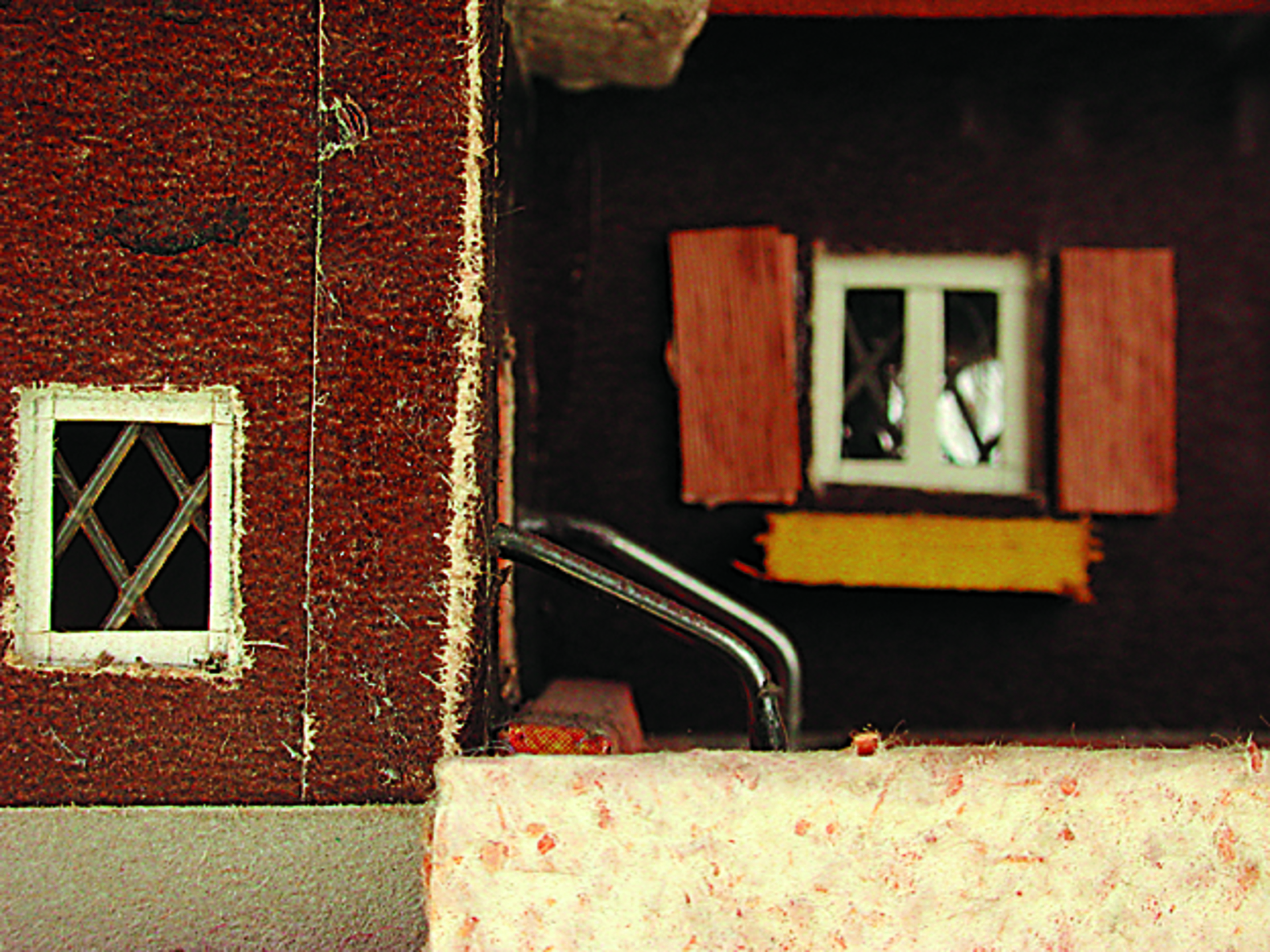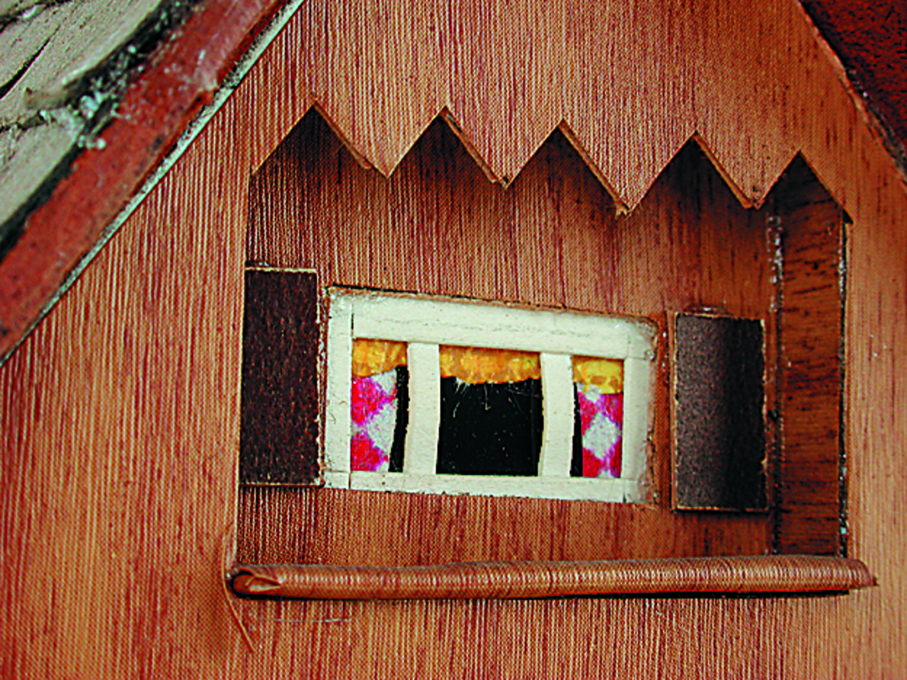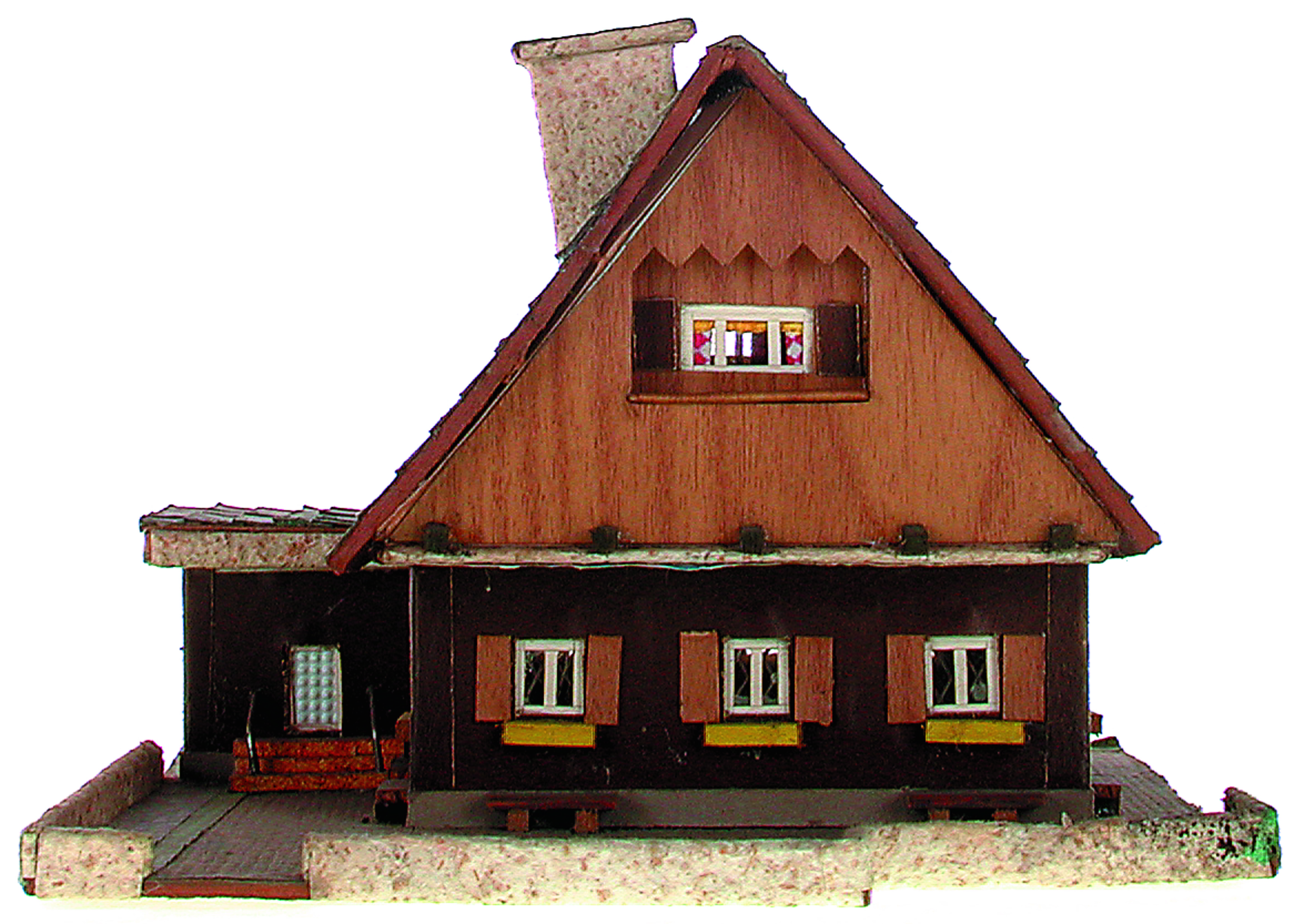 Anmerkung der Redaktion: Nicht von jedem Haus sind alle einzelnen verwendeten Materialien dokumentiert. Tatsächlich verbaute der Bastler auch Zigarettenschachteln, Spinnenpapier, Pappmaschee, Tapetenreste, Bunt- und Silberpapiere, Stoffe, Synthetikfasern, d-c-fix-Folien, Schriftproben, Zeitungsschnipsel und ausgewertete Illustrierte, Kartonagen, Holzabfälle aller Art, Uhu, Holzleim und Tapetenkleister.