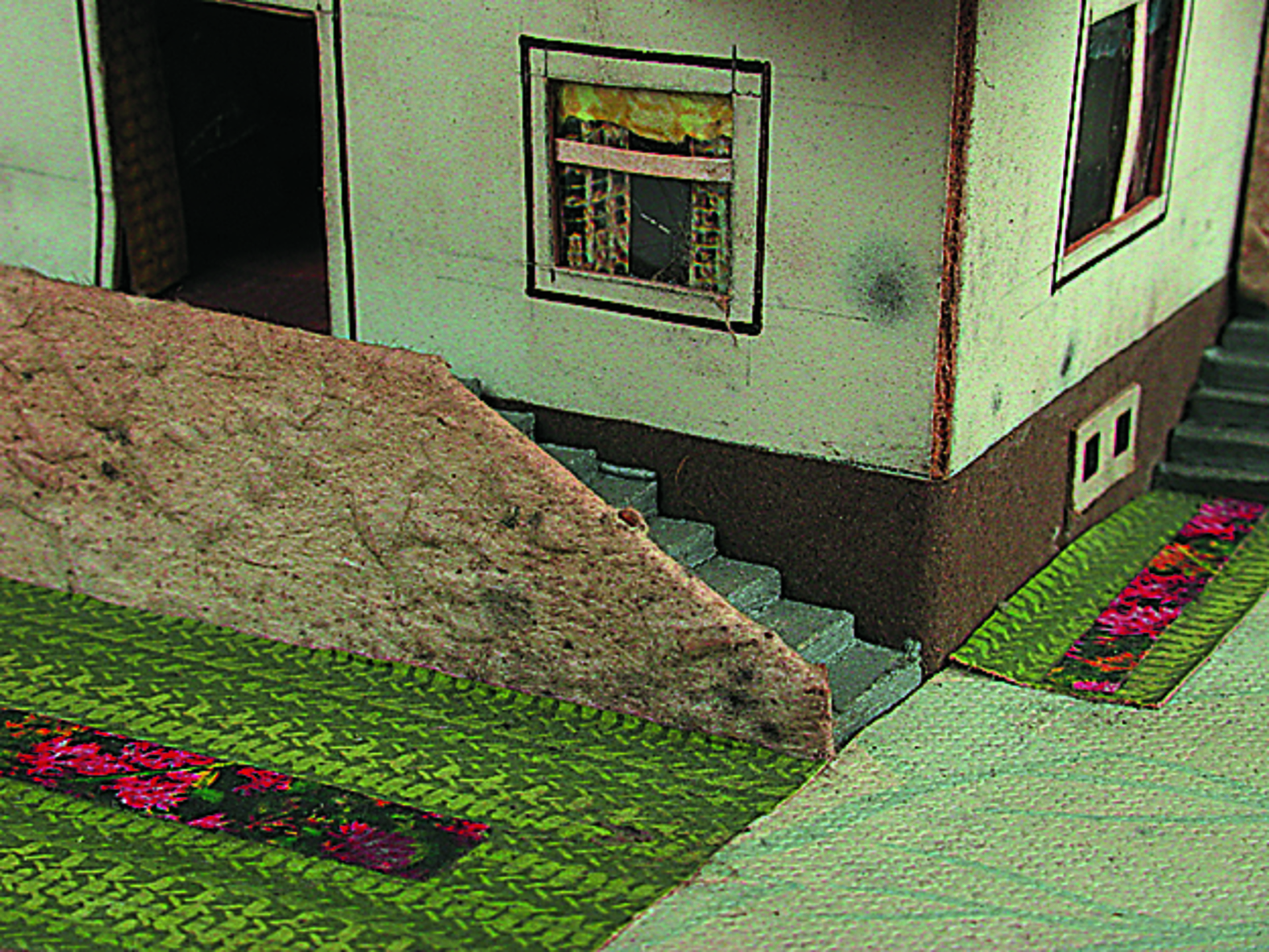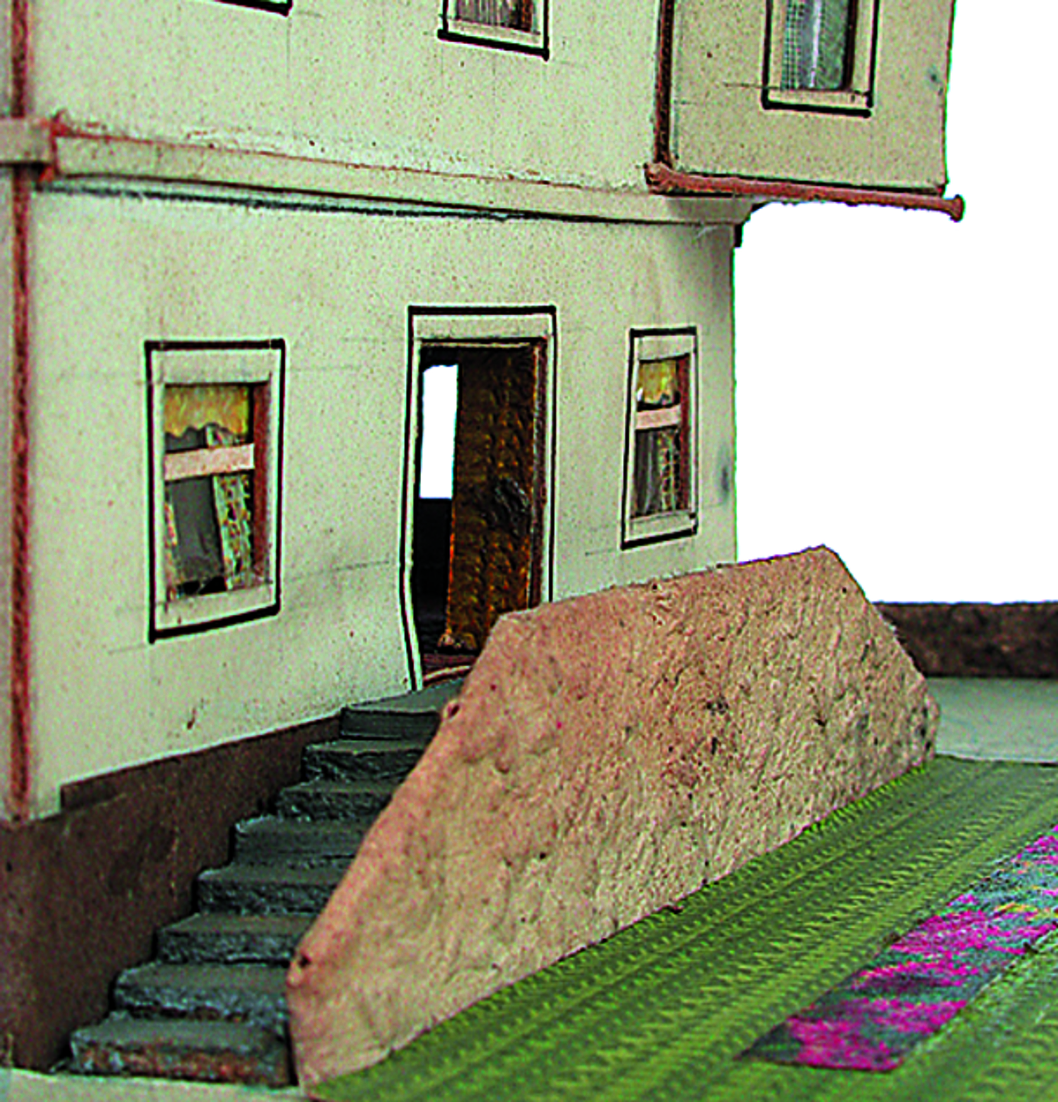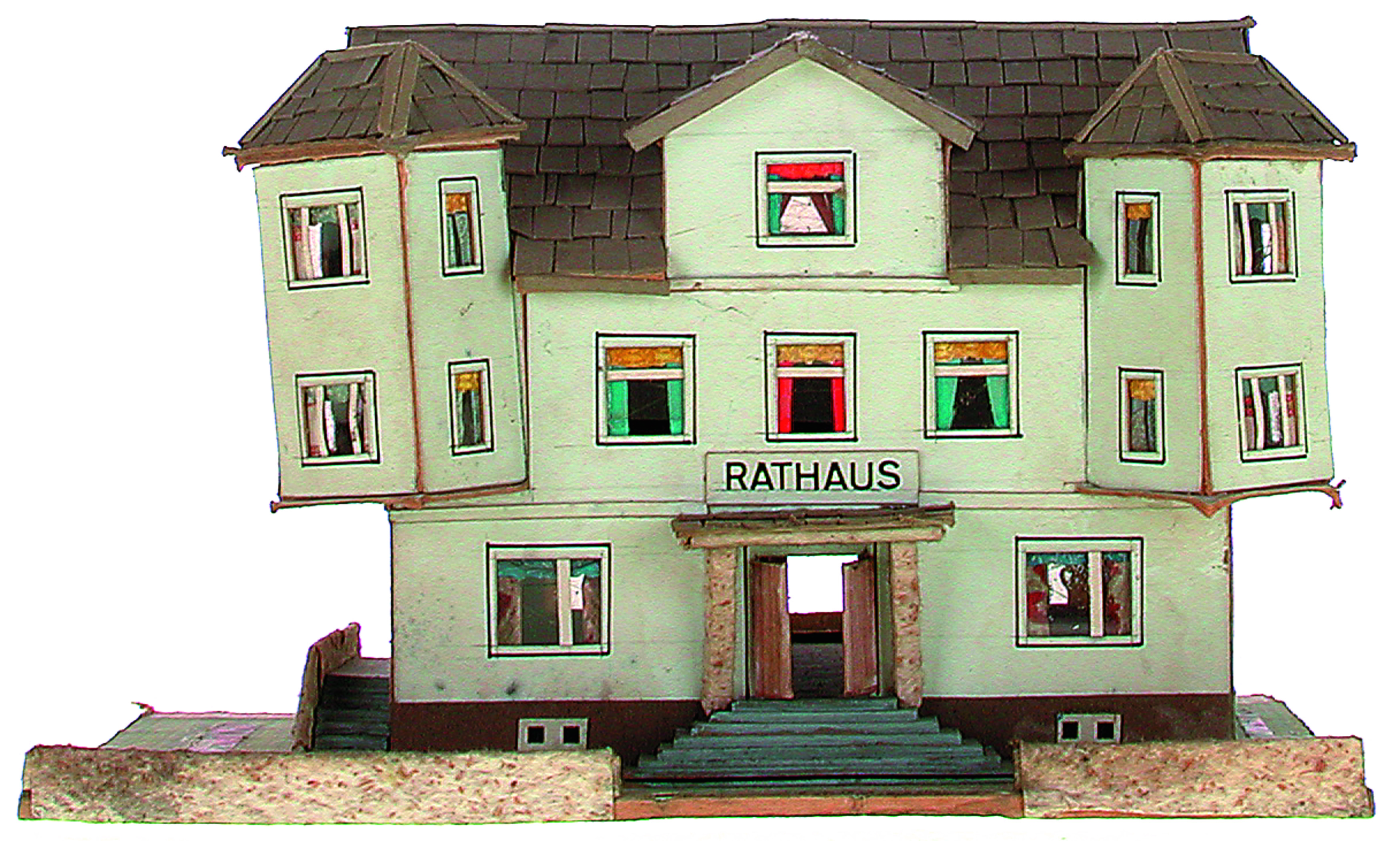 Anmerkung der Redaktion: Nicht von jedem Haus sind alle einzelnen verwendeten Materialien dokumentiert. Tatsächlich verbaute der Bastler auch Zigarettenschachteln, Spinnenpapier, Pappmaschee, Tapetenreste, Bunt- und Silberpapiere, Stoffe, Synthetikfasern, d-c-fix-Folien, Schriftproben, Zeitungsschnipsel und ausgewertete Illustrierte, Kartonagen, Holzabfälle aller Art, Uhu, Holzleim und Tapetenkleister.