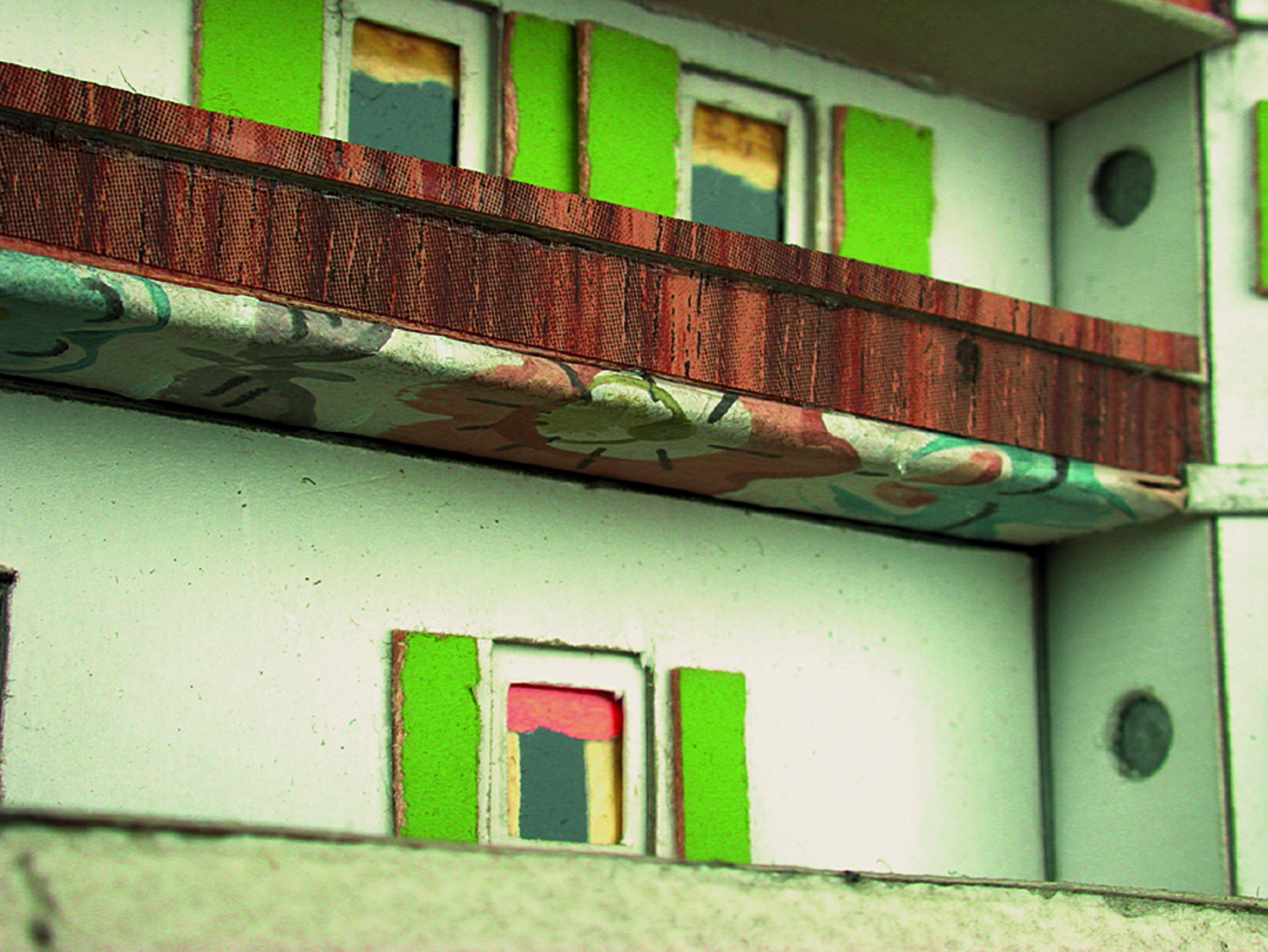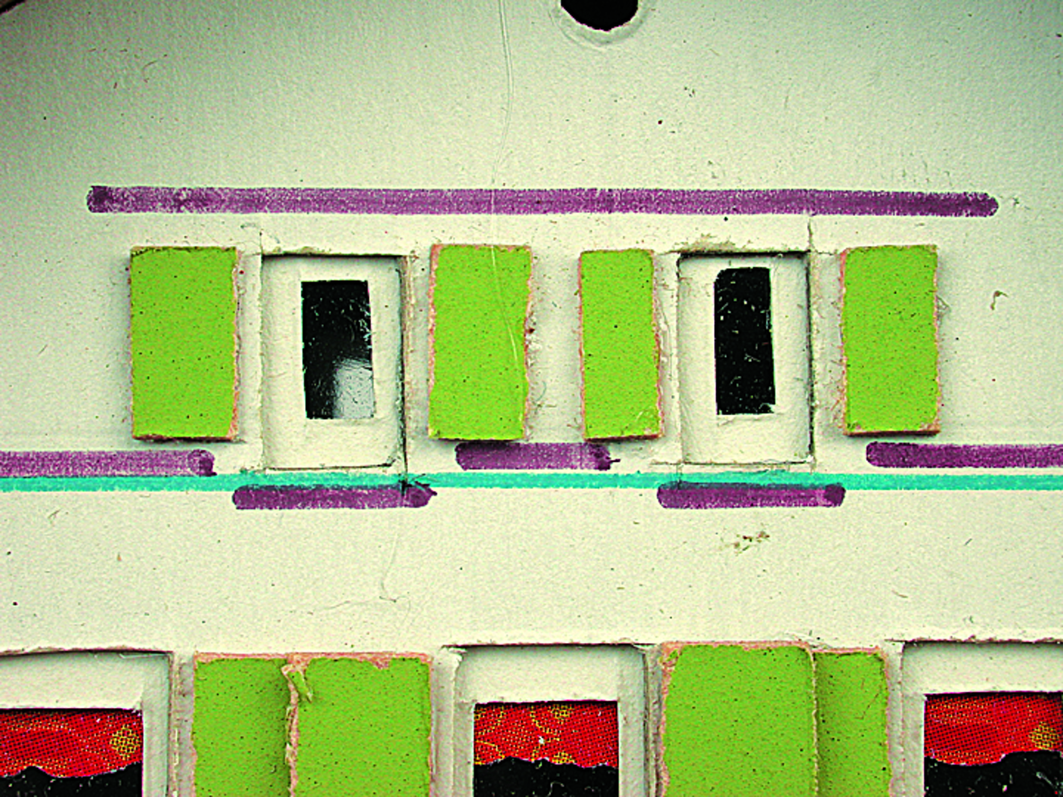 Anmerkung der Redaktion: Nicht von jedem Haus sind alle einzelnen verwendeten Materialien dokumentiert. Tatsächlich verbaute der Bastler auch Zigarettenschachteln, Spinnenpapier, Pappmaschee, Tapetenreste, Bunt- und Silberpapiere, Stoffe, Synthetikfasern, d-c-fix-Folien, Schriftproben, Zeitungsschnipsel und ausgewertete Illustrierte, Kartonagen, Holzabfälle aller Art, Uhu, Holzleim und Tapetenkleister.