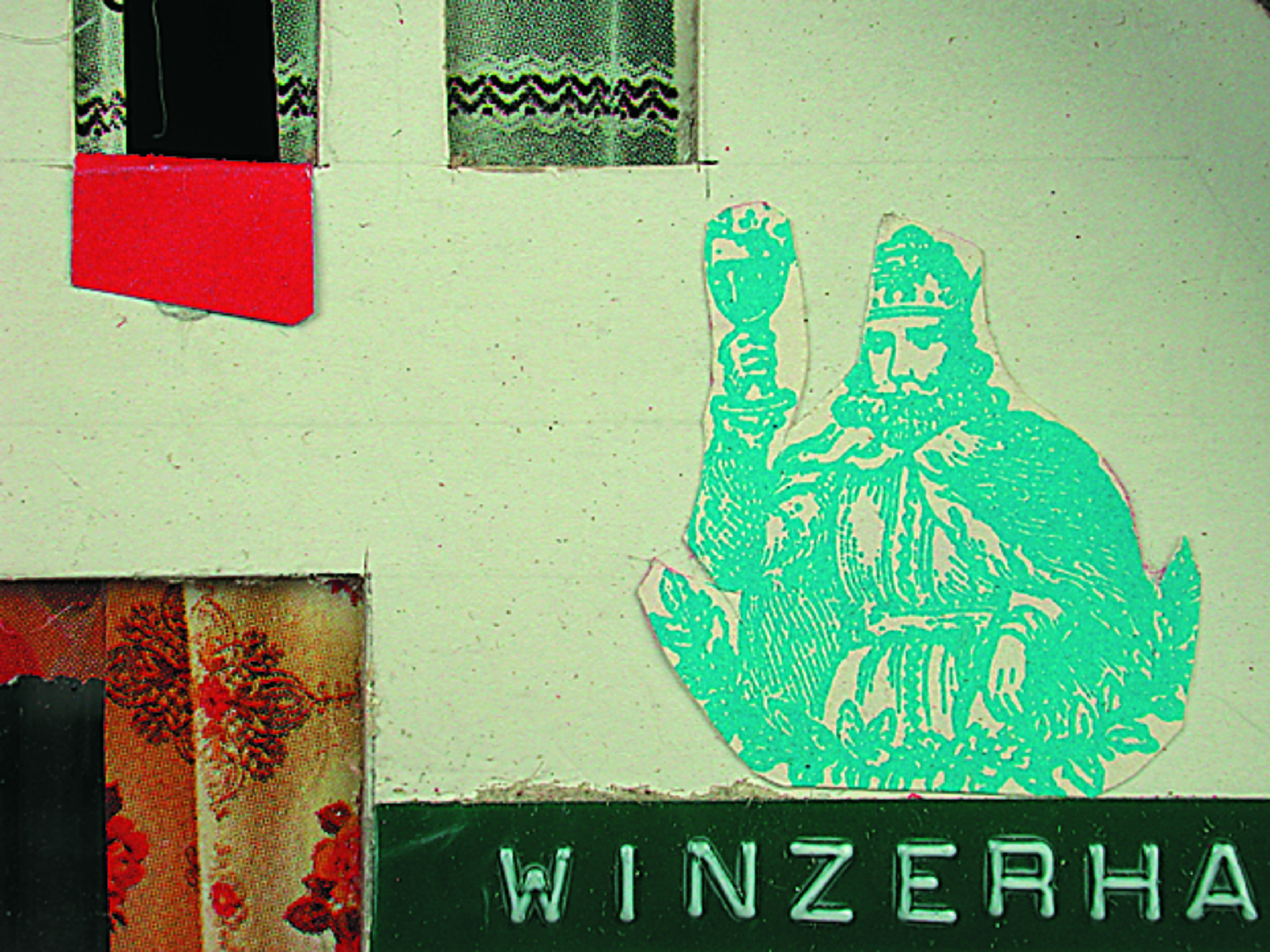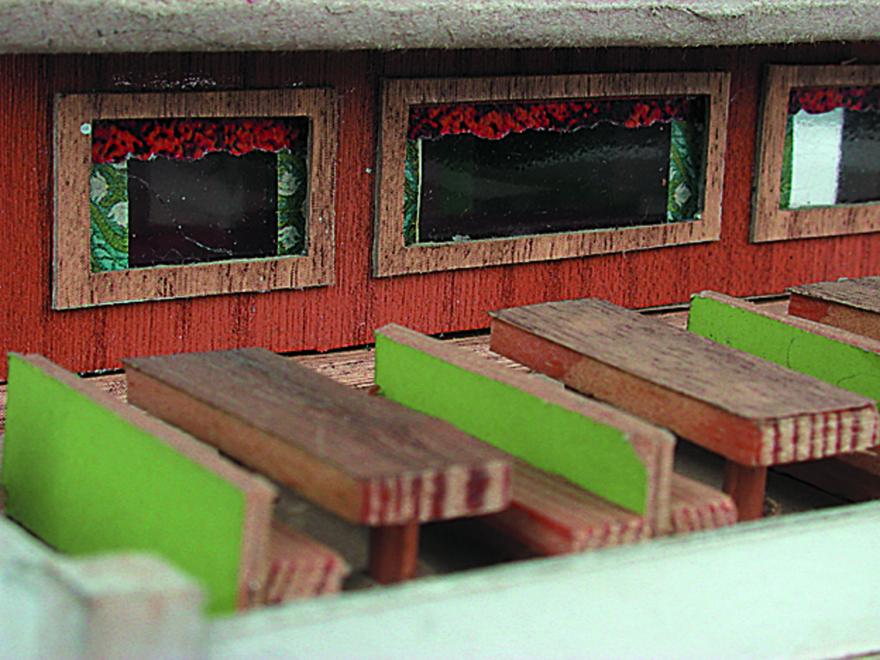 Anmerkung der Redaktion: Nicht von jedem Haus sind alle einzelnen verwendeten Materialien dokumentiert. Tatsächlich verbaute der Bastler auch Zigarettenschachteln, Spinnenpapier, Pappmaschee, Tapetenreste, Bunt- und Silberpapiere, Stoffe, Synthetikfasern, d-c-fix-Folien, Schriftproben, Zeitungsschnipsel und ausgewertete Illustrierte, Kartonagen, Holzabfälle aller Art, Uhu, Holzleim und Tapetenkleister.